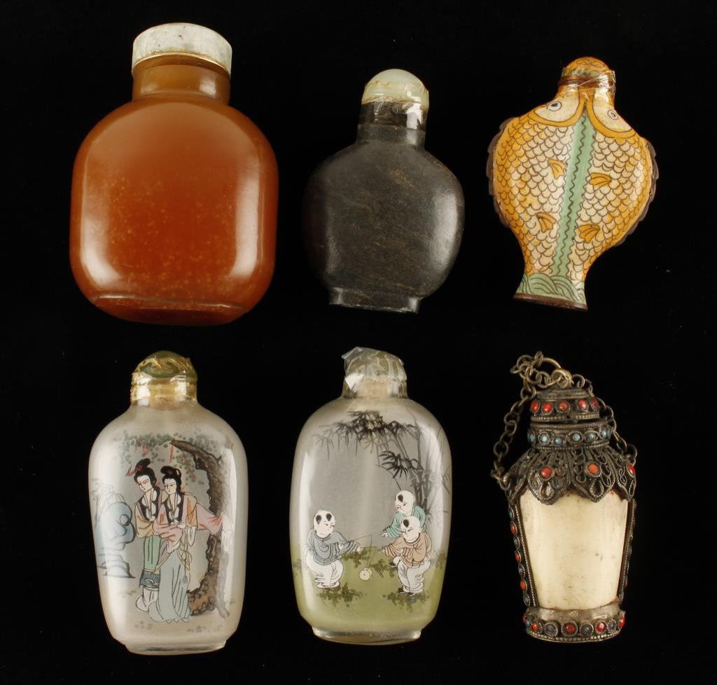 Lot of 6 snuff bottles; one large carved agate with jade top; one cloisonné fish; one bone body with jeweled metal decoration (Northern China/Tibet); one Peking glass scenes of boys; one Peking glass scenes of ladies; one greenish black stone with jade top. Est.: $300-$600.