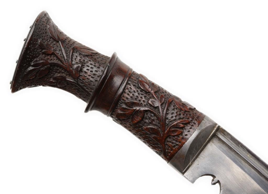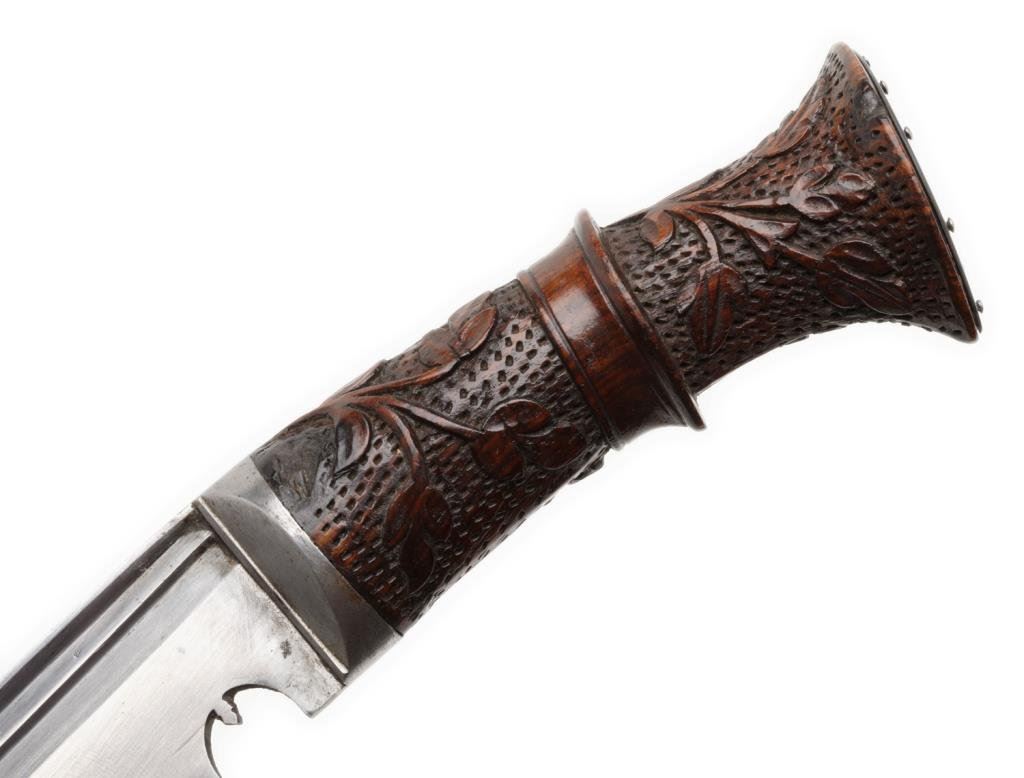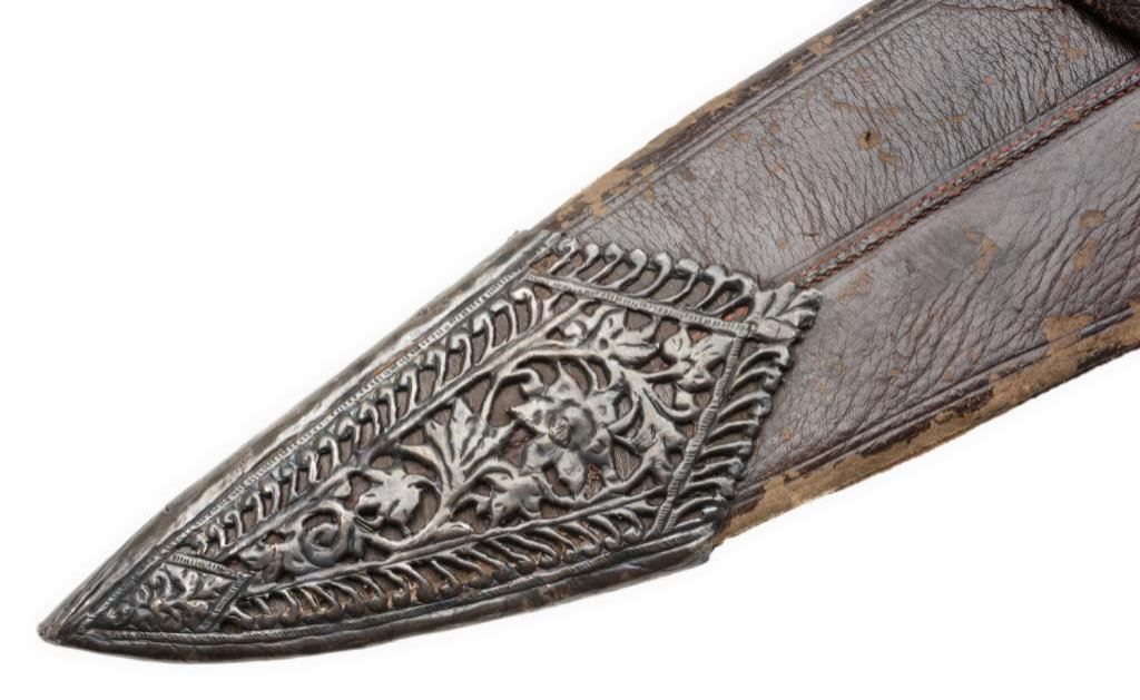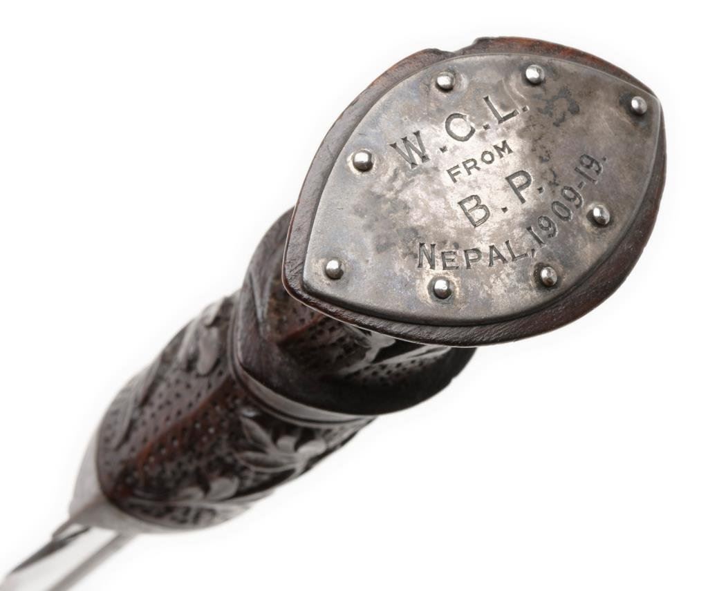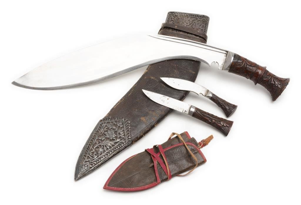 Fancy Nepal Tribal Gurkha with ornately carved horn handle and leather scabbard. The knife is overall very good to nearly fine condition with a 16” overall length and 13” blade. The blade shows only handling marks and polishing. While the exquisitely carved horn handle is in very good condition with an old, crude repair at the bolster. The pommel has a silver plate inscribed, “W.C.L. FROM B.P. NEPAL 1909-19.” The brown leather scabbard is in overall good condition with some losses of finish and loosening of stitches. The mouth and toe of the sheath are decorated with silver colored metal work. A pair of 5” horn handled side knives and separate leather pouch complete the set. A neat old set from the turn of the century. Est.: $300-$600.