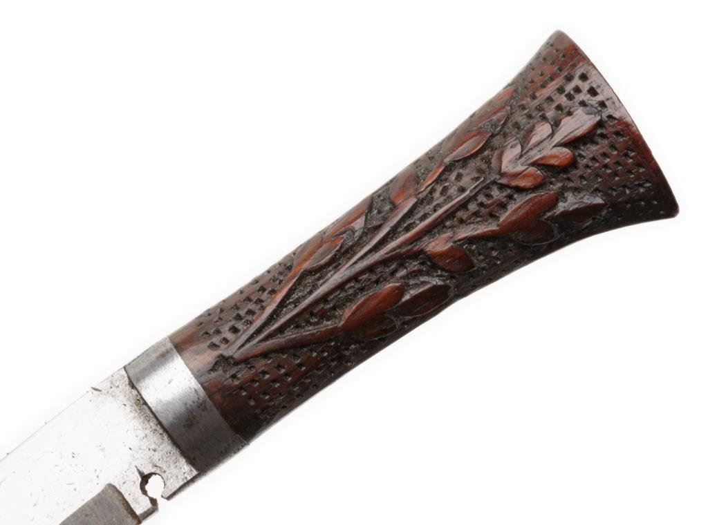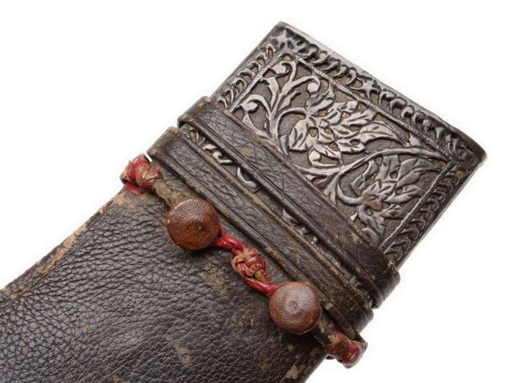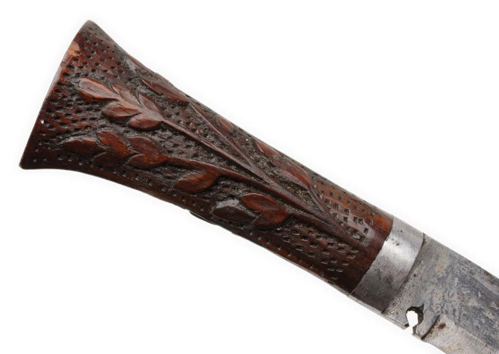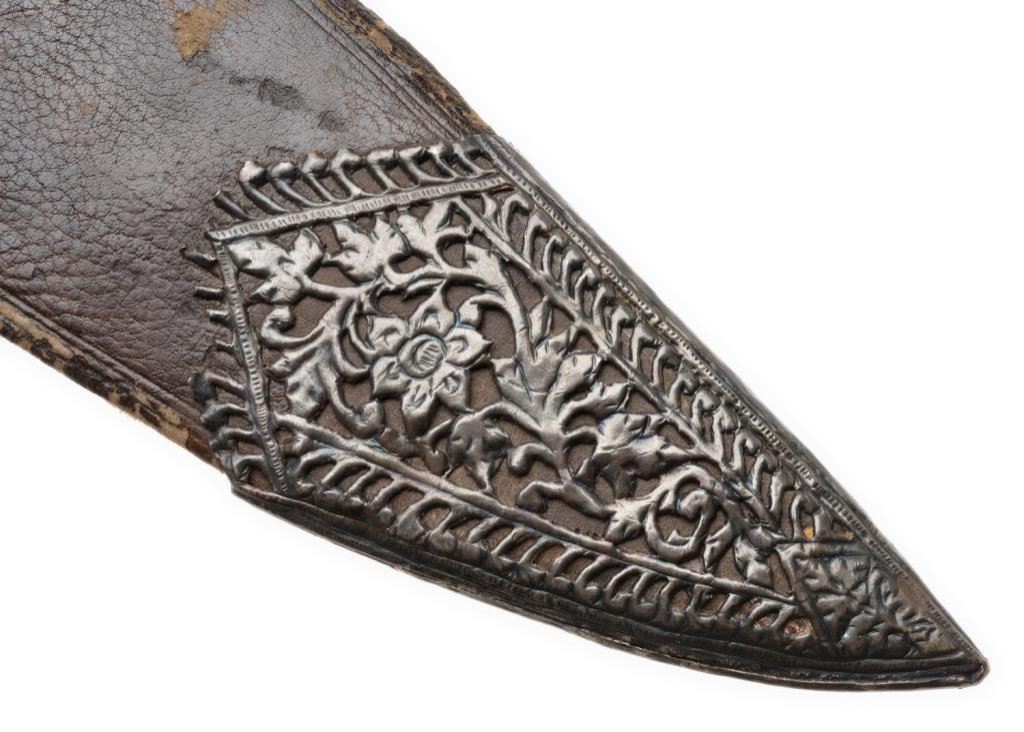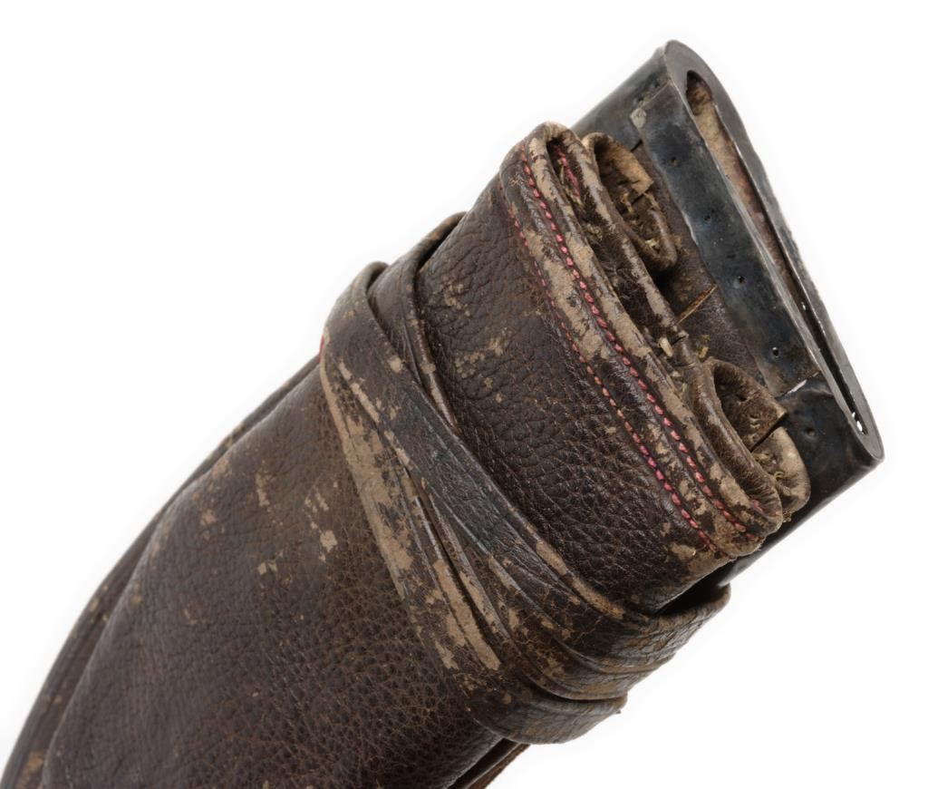 Fancy Nepal Tribal Gurkha with ornately carved horn handle and leather scabbard. The knife is overall very good to nearly fine condition with a 16” overall length and 13” blade. The blade shows only handling marks and polishing. While the exquisitely carved horn handle is in very good condition with an old, crude repair at the bolster. The pommel has a silver plate inscribed, “W.C.L. FROM B.P. NEPAL 1909-19.” The brown leather scabbard is in overall good condition with some losses of finish and loosening of stitches. The mouth and toe of the sheath are decorated with silver colored metal work. A pair of 5” horn handled side knives and separate leather pouch complete the set. A neat old set from the turn of the century. Est.: $300-$600.