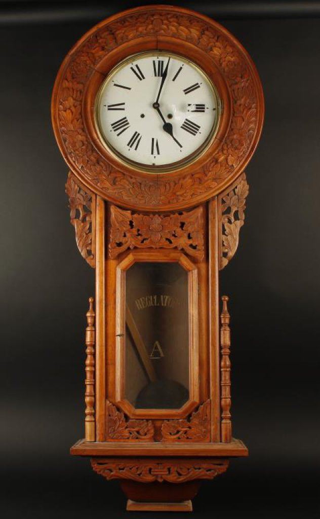 Large carved wooden Regulator Wall Clock, approximately 51” tall x 22” at widest point x 5” deep; beautifully accomplished and appears to be in very good to fine condition with pendulum. Est.: $350-$700.
