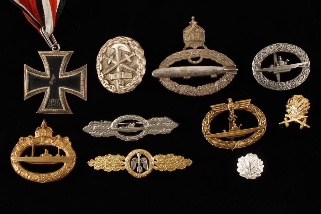 Box lot of Nazi style medals collected by a pilot from Alaska over the last 40 years in Germany and at gun shows. 9 pieces sold as good quality older reproduction. We have had arguments that 1 or 2 may be real but our opinion is they are copies and the collector was fooled. Est.: $300-$600