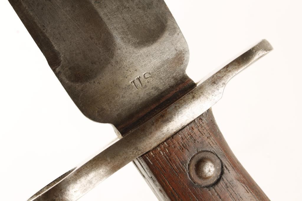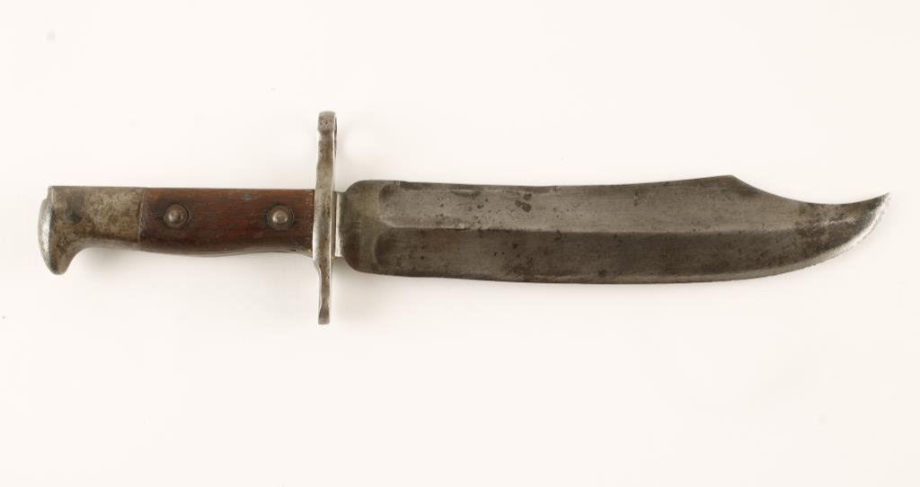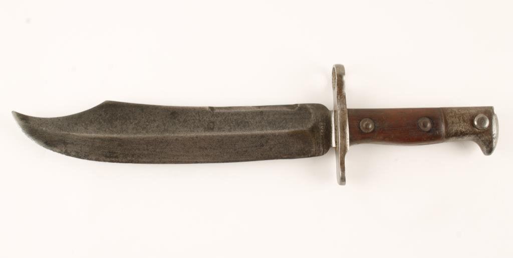 Rare original U.S. Krag rifle “Bowie knife” bayonet, approximately 13.5” overall with a 9” clip point blade marked “US” on one side of the blade at base and “1900” on the other side at base. This hard-to-find bayonet is in overall very good condition showing a grey patina with some scattered erosion; good markings, very good wood grip slabs and working release button in pommel. It is estimated that less than 3,000 of this style of bayonet was produced by the Springfield Armory. Bayonet only, no metal sheath accompanying this piece. Est.: $400-$800.