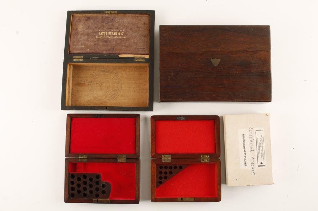 Lot of 4 boxes from Bob Allen estate. Maker of excellent cases in antique style. 2 Remington vest pocket cases for a large caliber .41 and .30 cal. small frame. Finished with correct red baize lining and cartridge blocks. These boxes are often aged and pass for authentic. 1 antique rosewood case marked “Manufactured for Payot Upham & Co, San Francisco, Cal.” in embossed lid. 7” x 4”x 1” deep. No bottom lining in good condition. Altered rosewood desk or dresser box to gun box by reducing angles. Rosewood. 9 ½” x 7” x 1” deep. As a lot. Est.: $300-$600
