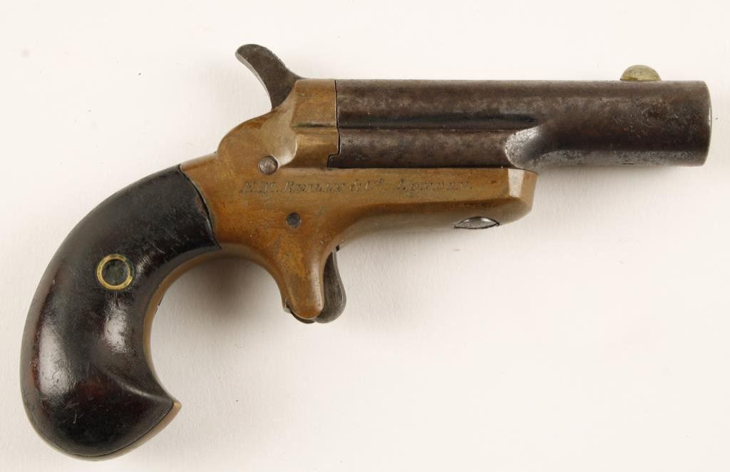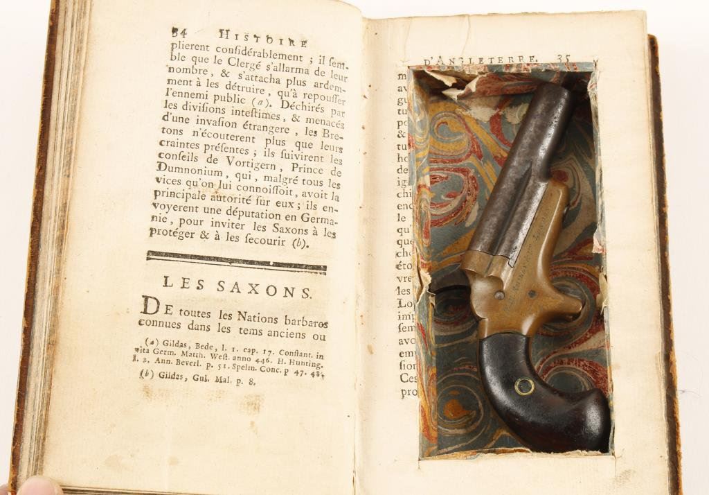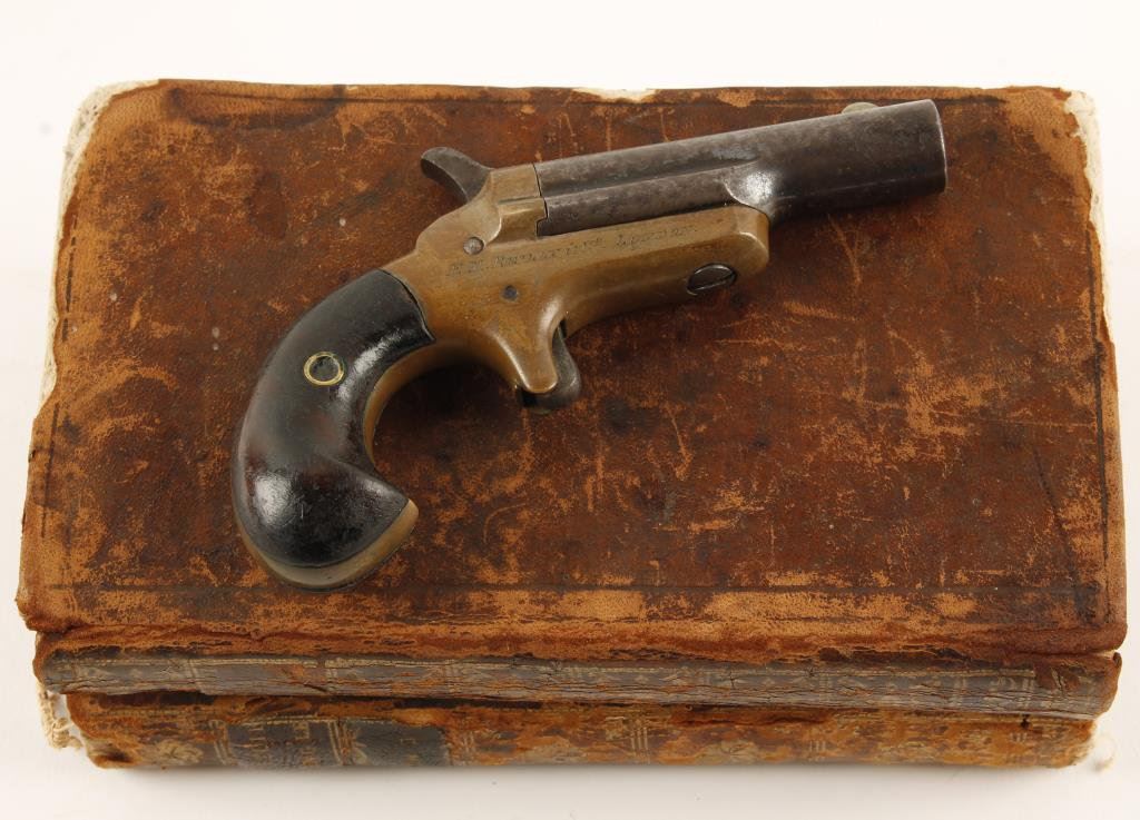 Colt #3 single shot London marked derringer, .41 caliber, brass frame, wood grips, right side of frame marked “E. M. REILLY & CO./LONDON”; overall good condition with dark patina, action not staying on full cock; accompanied by a pair of antique books that have a cut-out compartment to conceal the Colt. Est.: $400-$800.