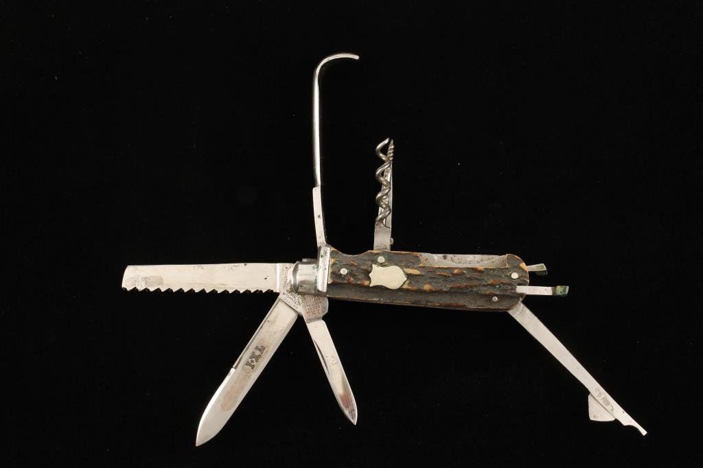 Rare multi-blade/tool Ferrier’s pocket knife with stag slabs marked “I.X.L” by premier maker George Wostenholm, Sheffield, England, approximately 3.5” overall closed. This knife is in minty condition with two blades and eight tools; a great piece in great condition! Est.: $500-$1,000.