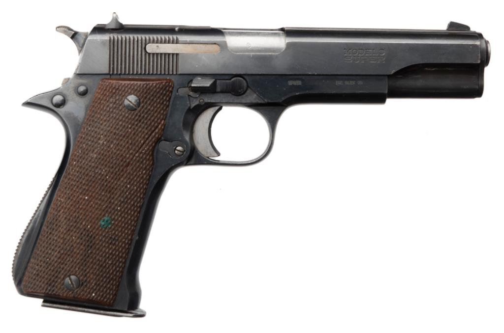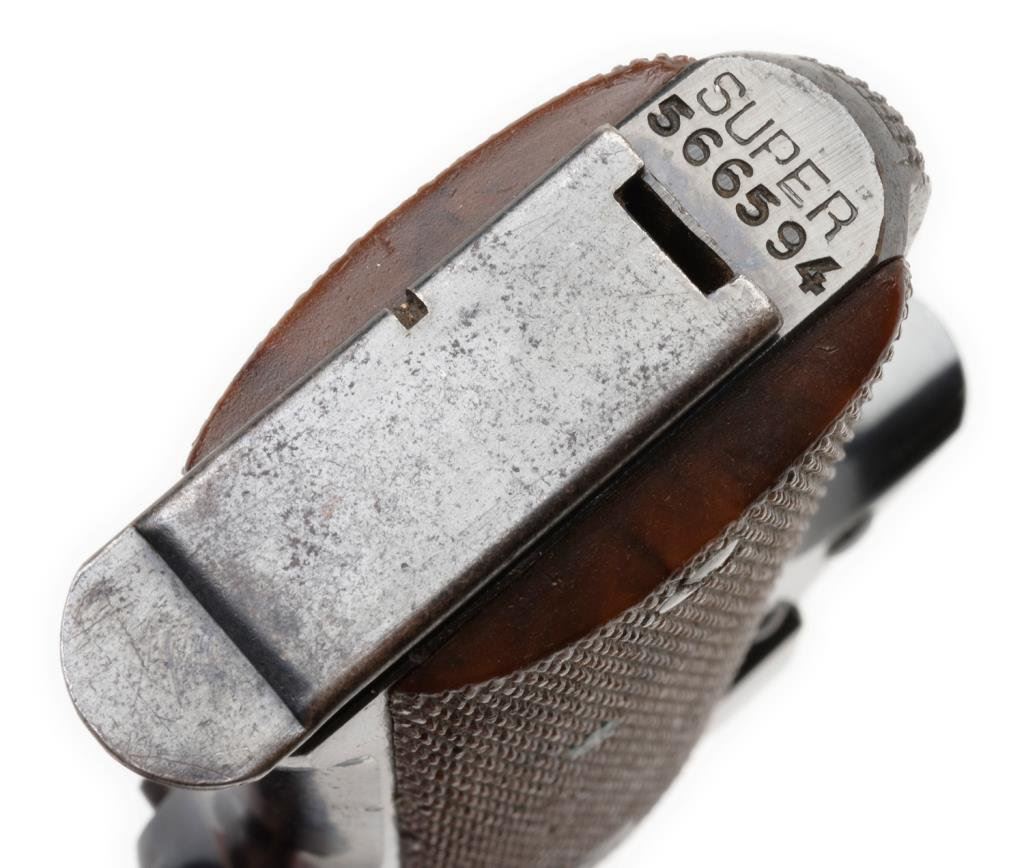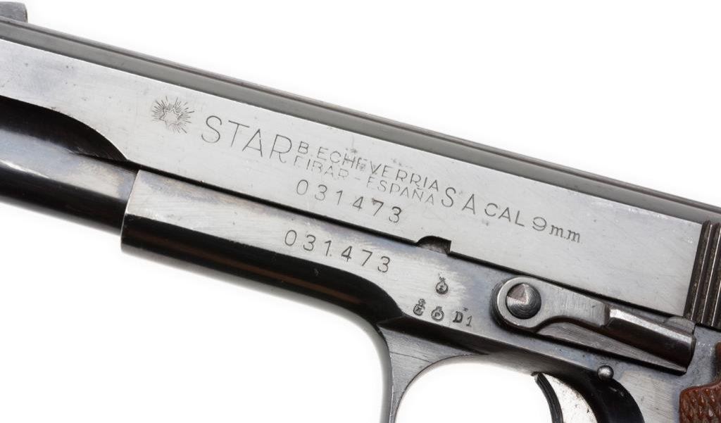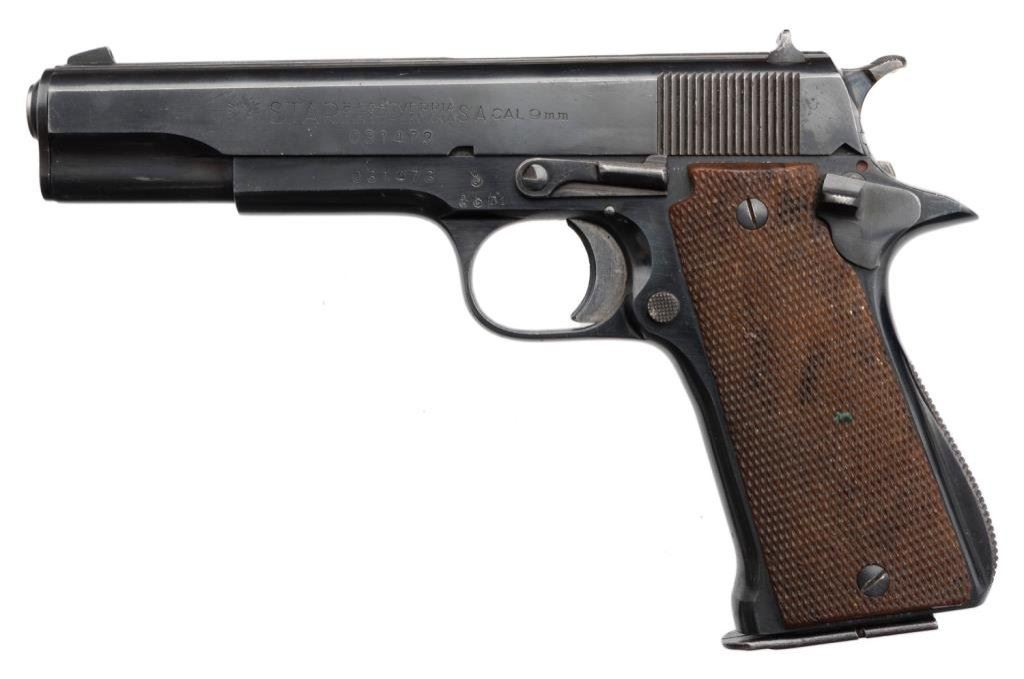 *Spanish Star Super Model semi-automatic pistol, 9mm Largo caliber, 5” barrel, S/N 031473, blued finish, checkered faux wood grips in overall very good to near fine condition; import-marked, majority of original finish remaining, very good bore, crisp action, sharp markings and very good + grips. Est.: $300-$500.