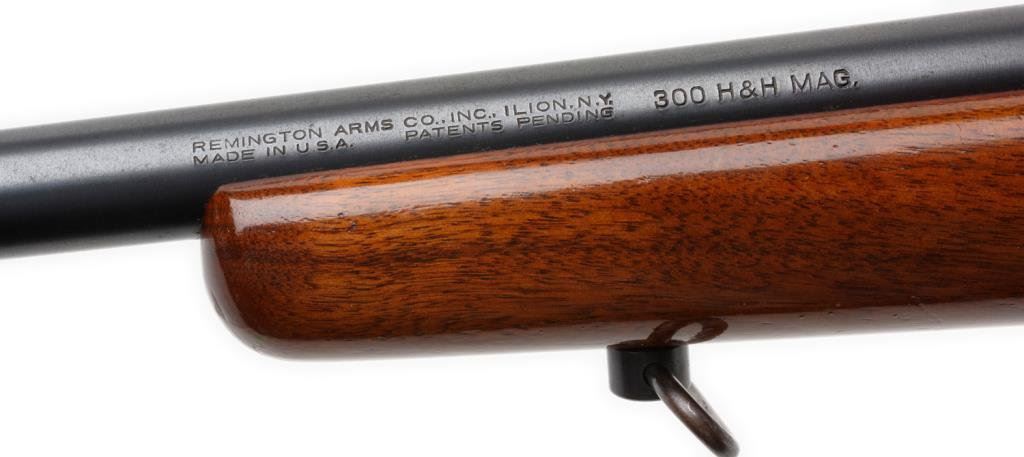 **Remington Model 721 bolt action rifle, .300 H&H caliber, serial #80838. The rifle is in overall very good condition with a 26” blued barrel, a ramp front sight and rear sight removed. The barrel retains the majority of its blued finish with some light surface erosion and freckling present. The action has been drilled and tapped with a slightly modified one-piece scope base added. The smooth wood stock is in overall very good condition with small mars and compressions consistent with field use. Sling swivels and a slip on butt pad have been added. The bore is very good, the action crisp and markings are sharp on this rifle. A nice rifle in a great caliber. Est.: $400-$800.