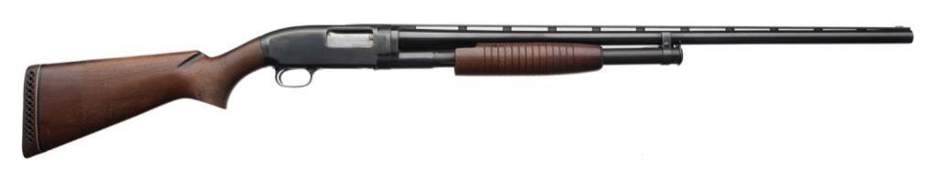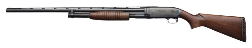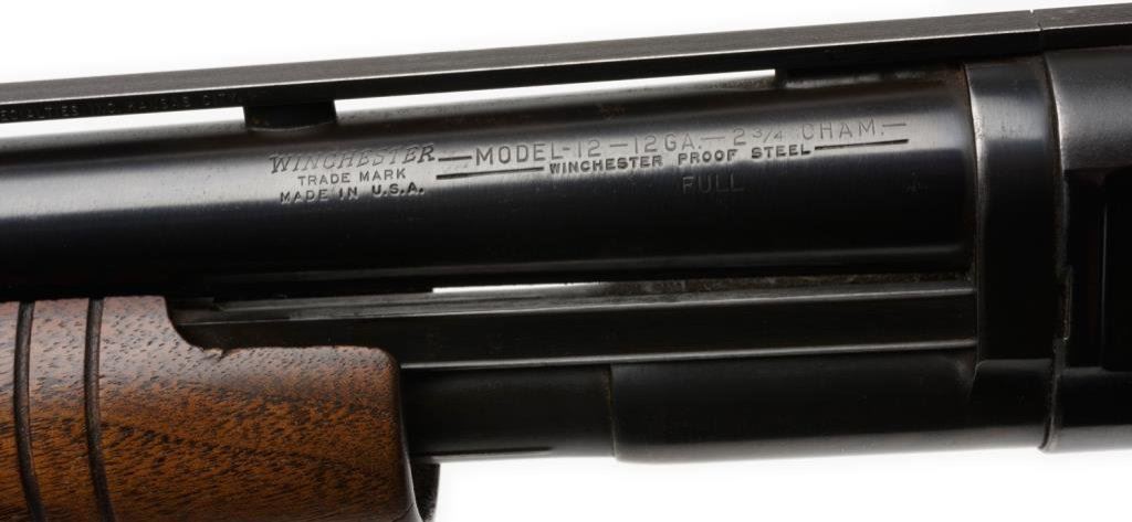**Winchester Model 12 pump action takedown shotgun, 12 gauge, full choke, 30” barrel with added Simmons ventilated rib, S/N 1668865, blued finish, wood stocks with added red hard rubber butt pad. This gun is in overall very good + condition showing scattered light pinprick pitting on the receiver; re-blued barrel, fine bore, crisp action and very good wood stocks with butt stock showing toning, loss of some finish and minor storage mars and scratches. Est.: $300-$600.