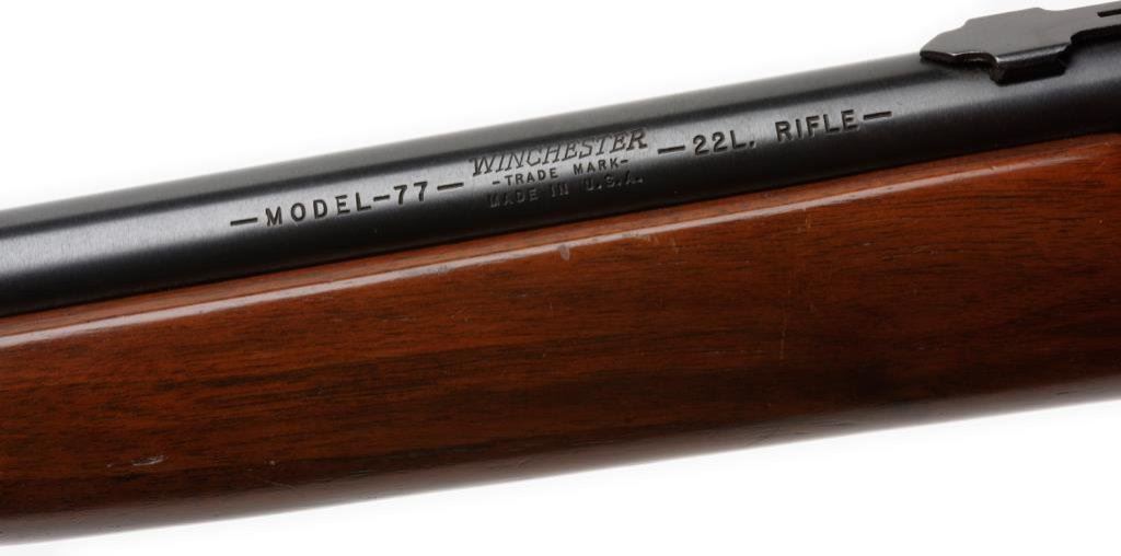 **Minty Winchester Model 77 magazine fed semi-automatic rifle, .22LR caliber, 22” round barrel, S/N 82755, blued finish, wood stock. This gun is in overall excellent condition showing little if any use; fine bore, action, markings and wood; just a couple minor storage mars. Est.: $400-$800.