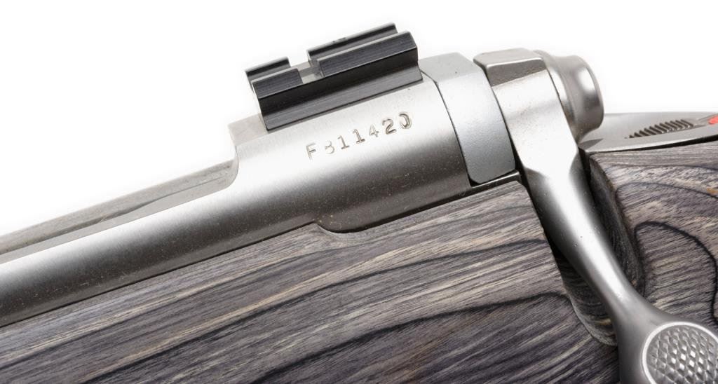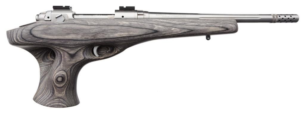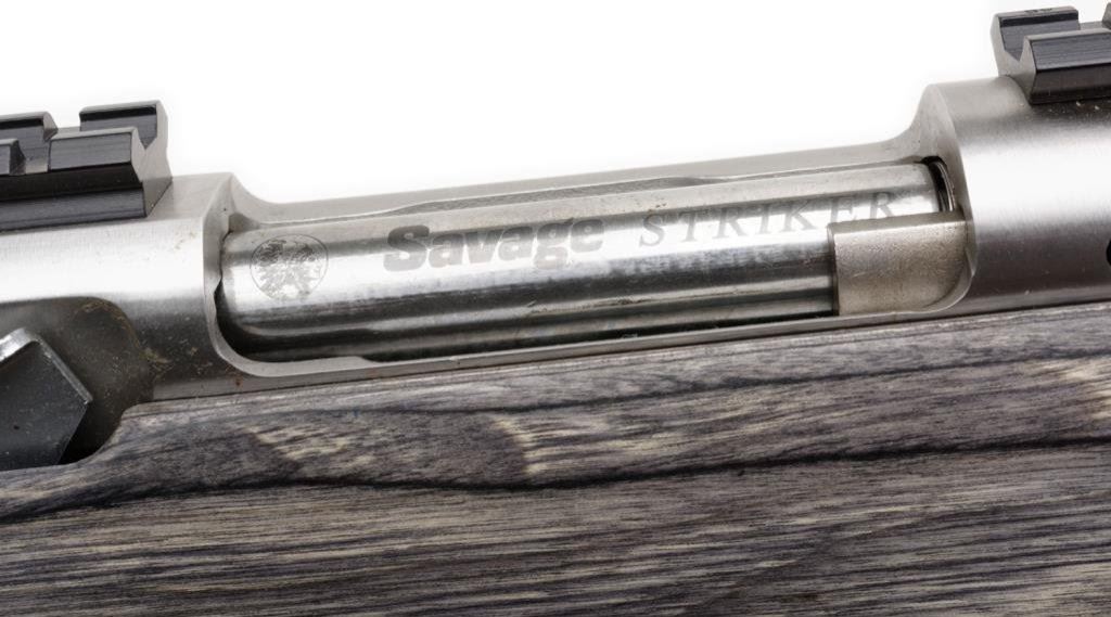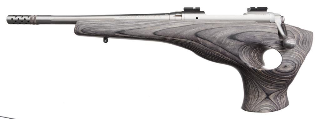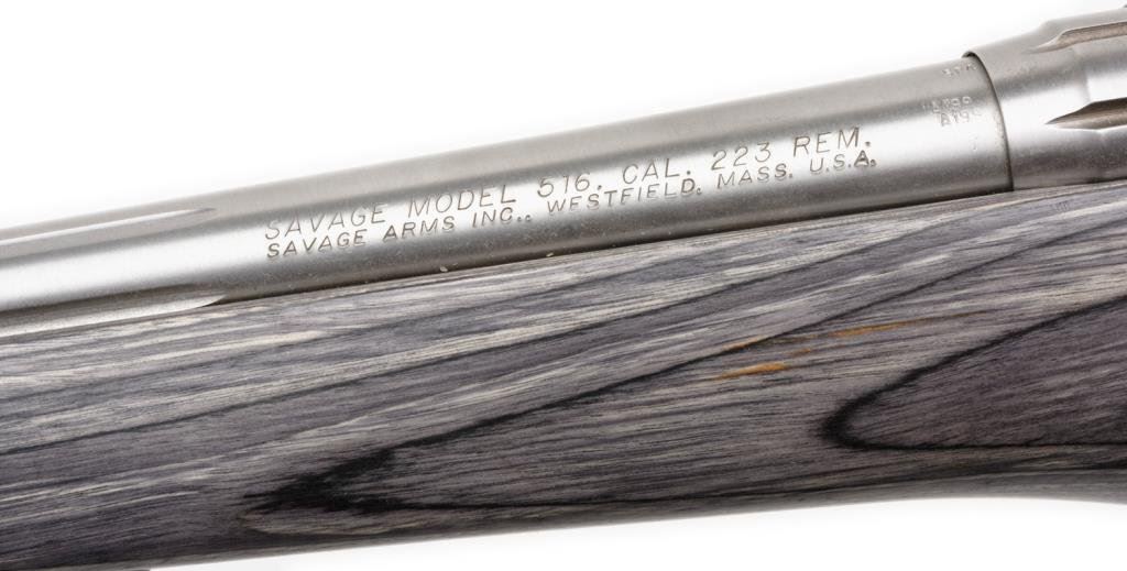 Lot 819 (15DKL-47): *Savage Model 516 Striker bolt action target pistol, .223 REM. caliber, 15” fluted and ported round barrel, S/N F811420, stainless steel, laminated wood stock with thumb hole grip and scope mounts on receiver. This gun is in overall fine condition with a fine bore, action, markings and stock. Est.: $600-$800.