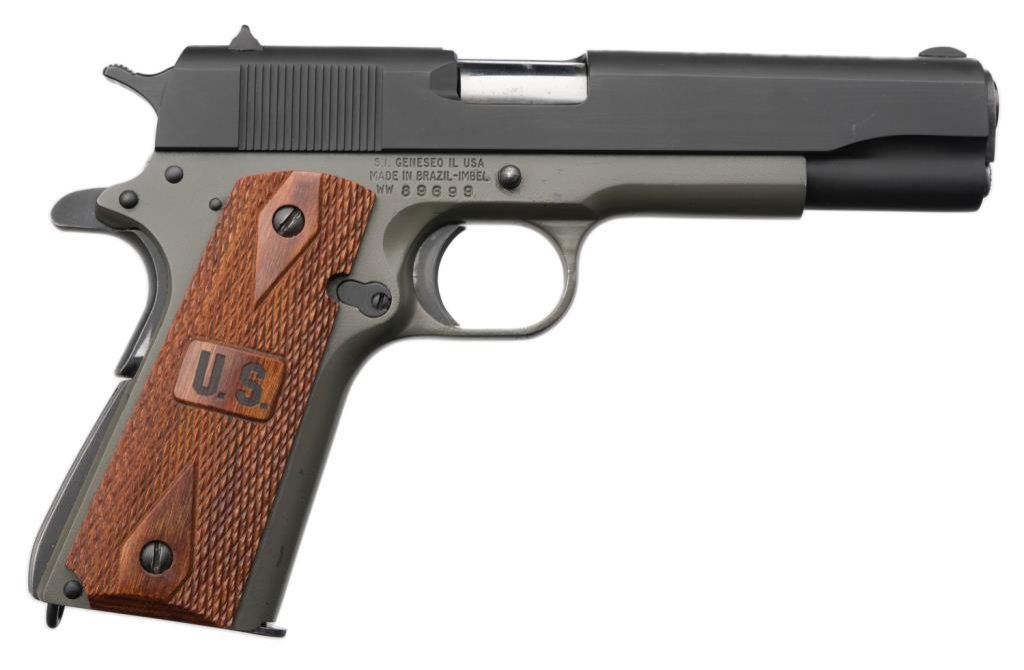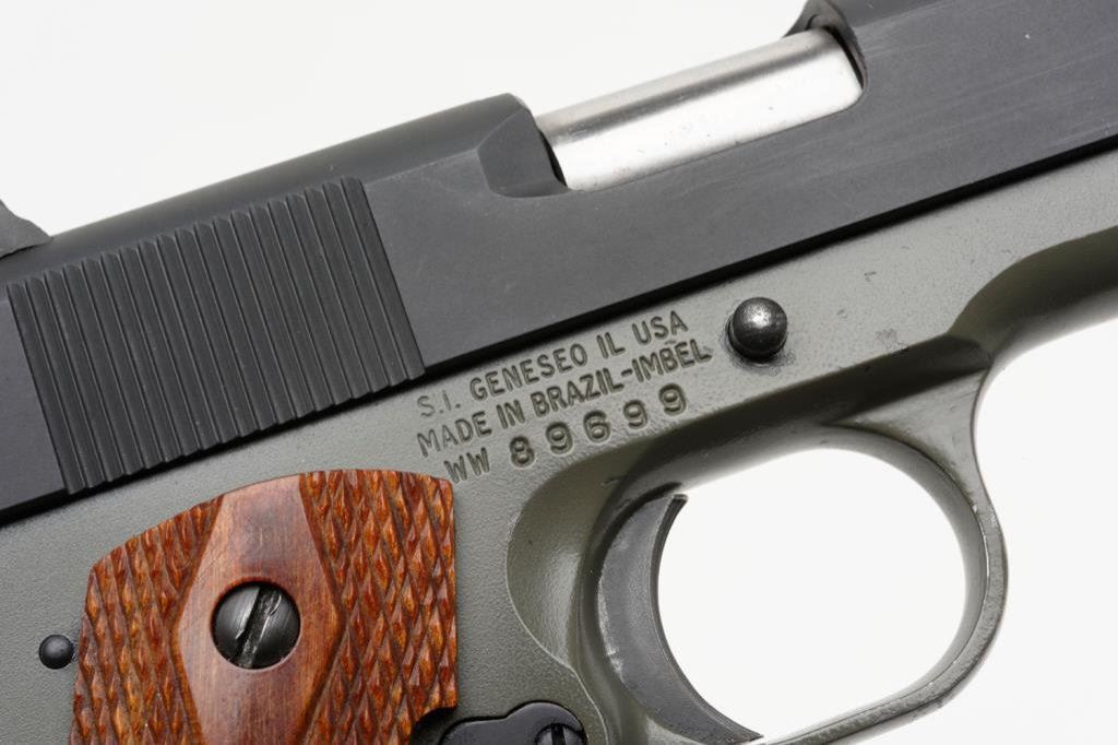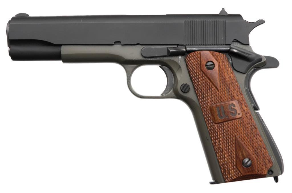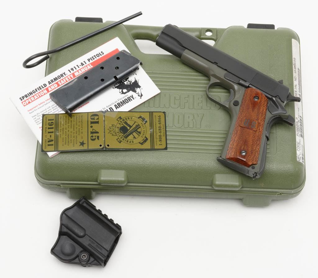 *Springfield Armory Corp. Model 1911 semi-automatic pistol, .45 caliber, 5” barrel, S/N 89699, green and black finish, checkered wood grips in overall excellent condition and contained in a green hard carry case with extra magazine, cleaning rod, manual and concealment holster inset in lid padding of casing. Est.: $400-$600.