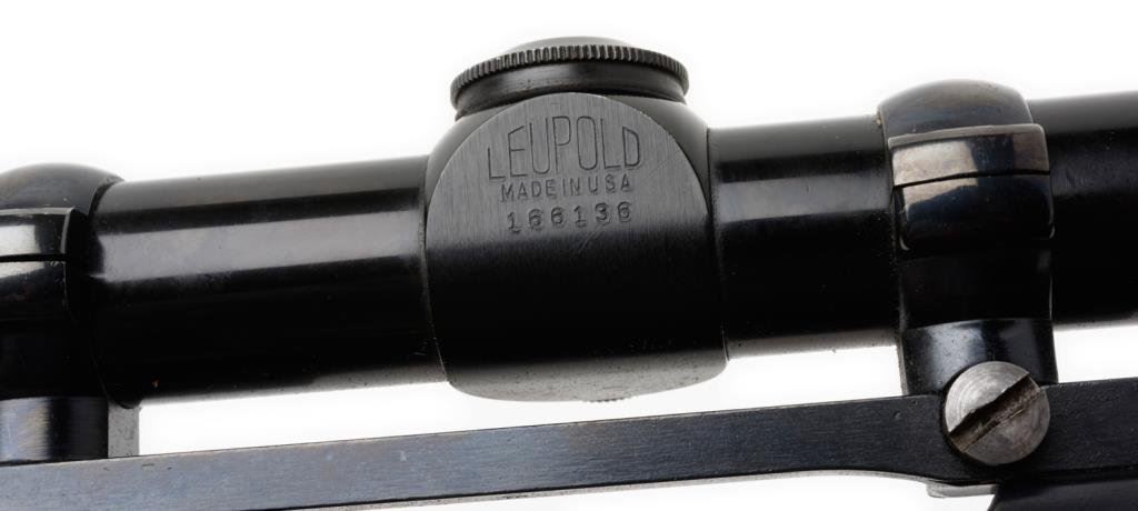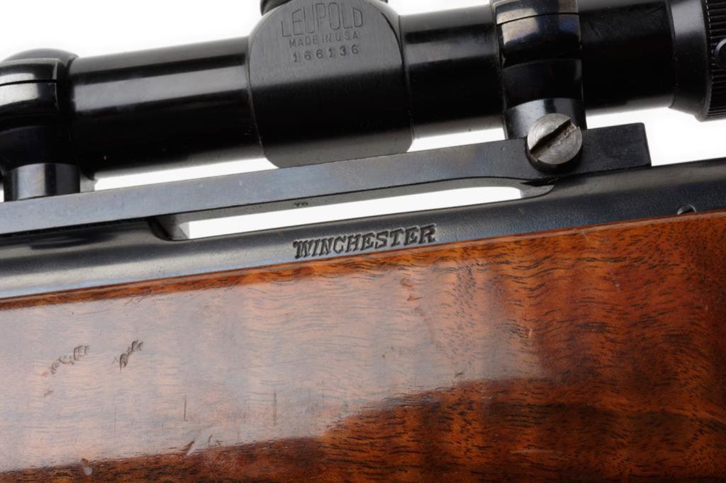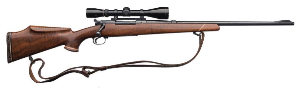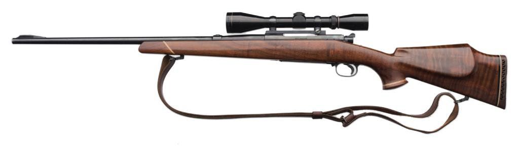 *Custom Winchester Model 70 bolt action rifle, .300 Winchester Magnum cal., serial #5670. The rifle is in overall very good condition with a 24” blued barrel. The rifle has been completely customized with the front sight ground down and rear sight removed. The barrel and receiver retain the majority of a quality period re-finish. The pre-war action was manufactured in 1937 according to the serial number and re-chambered for .300 Win Mag during the period of use. The nicely figured wood stock including a roll over cheek piece and oversized pistol grip shows mars and compressions consistent with field use. Additionally, the stock shows an old repair at the pistol grip, sling swivels, period leather sling and a rubber ventilated butt pad. The bore is very good, action and markings sharp on this custom Model 70. The rifle is topped with a one piece Redfield mount and a Leupold Vari-X II variable power 3x9x40 scope, with crisp clear optics. Est.: $600-$1,200.