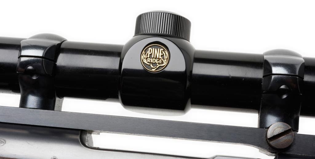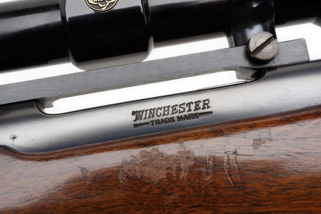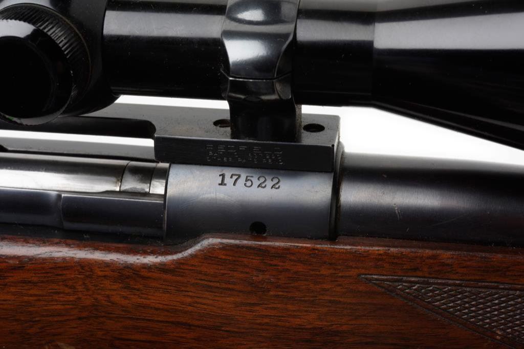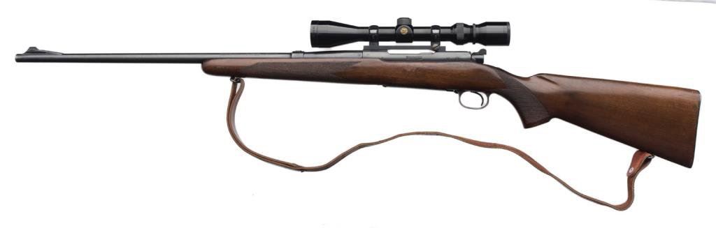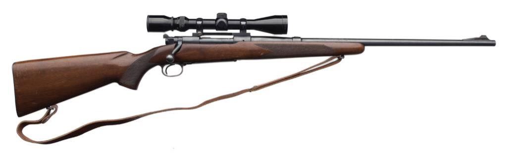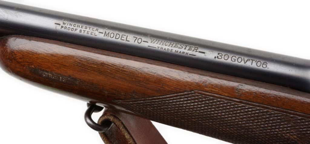 *Prewar Winchester Model 70 bolt action rifle, 30/06 cal., serial #17522. The rifle is in overall very good condition with a 24” blued barrel with a ramp front sight and rear sight removed. The barrel retains approximately 70% of the original blue with slight surface erosion, scrapes and a loss of finish near the barrel address. The receiver retains nearly all of its blued finish with only edge wear on the magazine base. The checkered wood stock is in very good condition with small mars and losses of finish consistent with field use. The rifle includes sling swivels, leather sling and checkered steel butt plate. The bore is very good; action crisp and all markings are sharp on this Model 70 manufactured in 1938. The rifle is topped by a Redfield one piece mount with a Pine Ridge 3 x 9 x 40 variable power scopes. Est.: $600-$1,200.