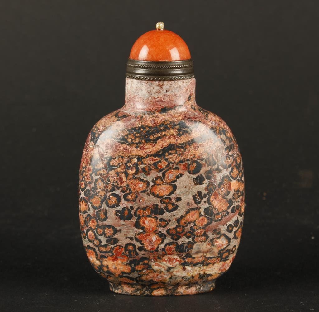 Red leopard Jasper stone snuff bottle, ca 1900. Est.: $500-$1,000.