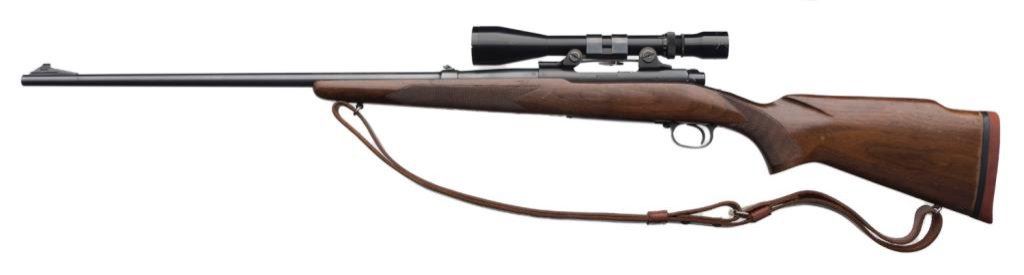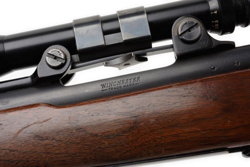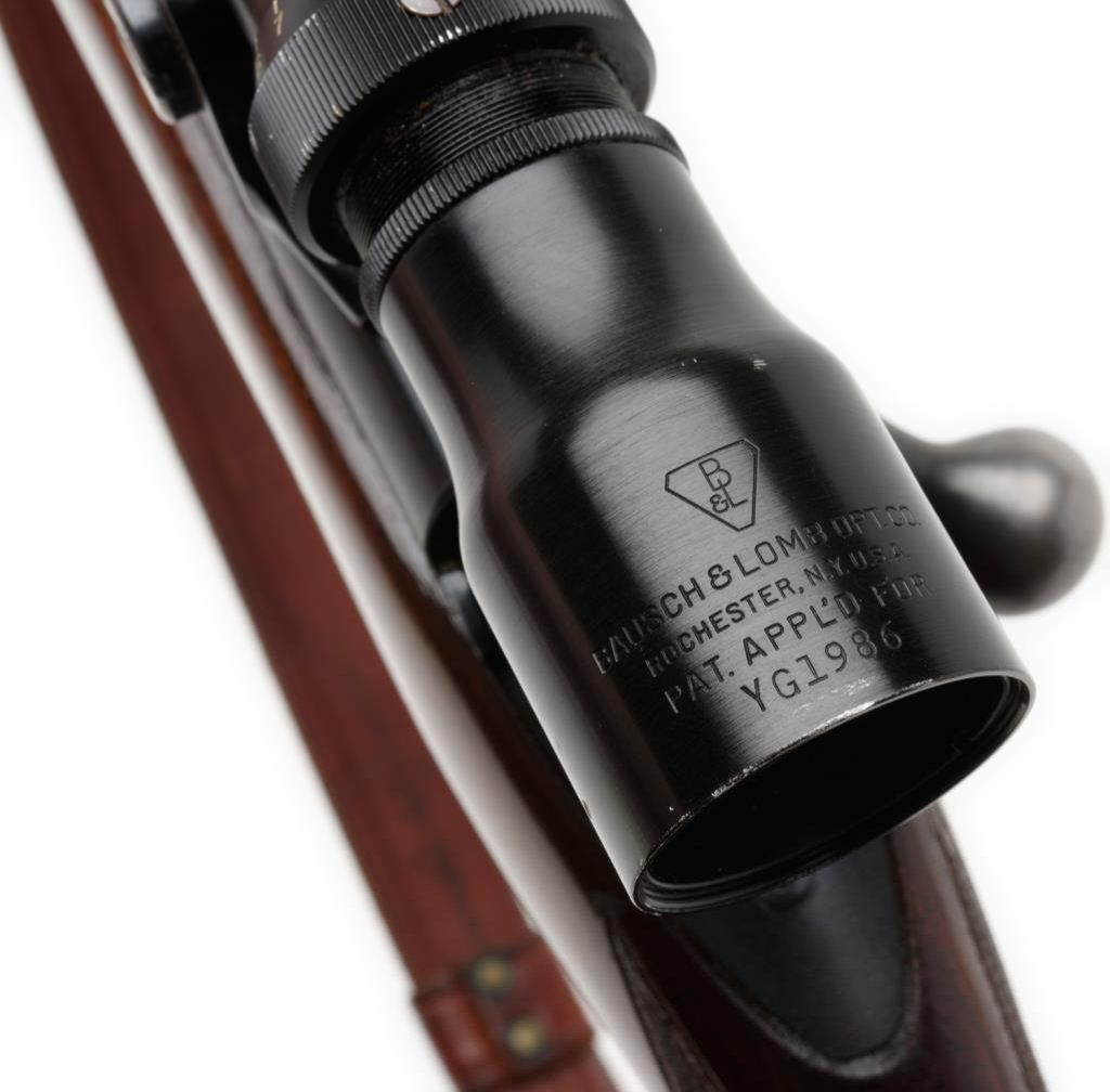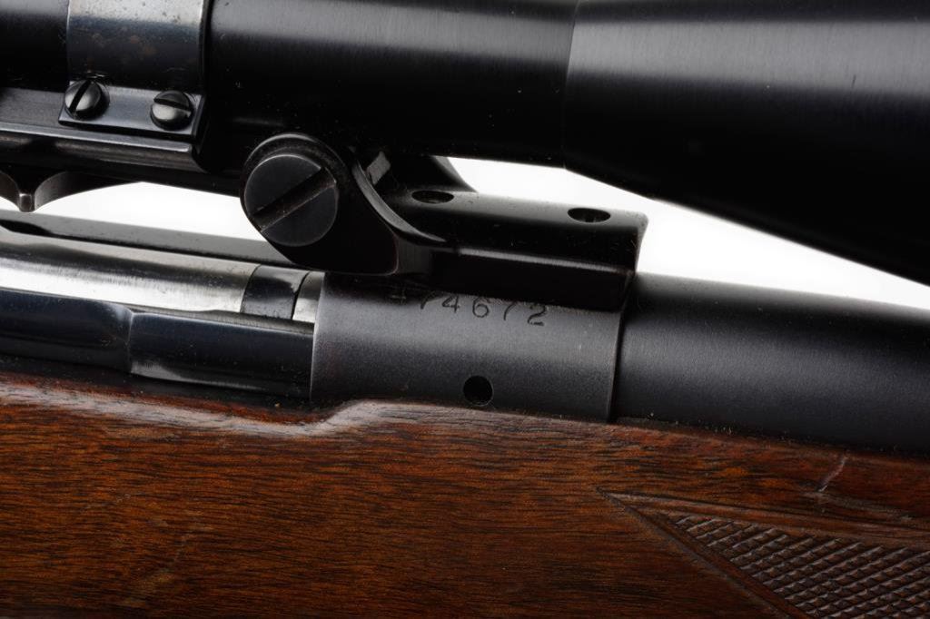 *Winchester Model 70 bolt action rifle, .264 Winchester Magnum cal., serial #474672. The rifle is in overall very good to nearly fine condition with a 26” blued barrel, ramp front and folding rear sights. The barrel and action retain the majority of their original blued finish with minor losses of finish at the muzzle and on the magazine base plate. The checkered wood stock is in overall very good condition with small mars and loss of finish consistent with field use. The stock includes sling swivels, leather sling and a red, rubber Winchester butt pad has been added. The bore is good, the action crisp and all markings are sharp on this pre-64 Model 70. The rifle is topped by a Bausch and Lomb proprietary mount with a Bausch and Lomb 2.5 x 8 variable power scope with crisp, clear optics. Est.: $800-$1,600.