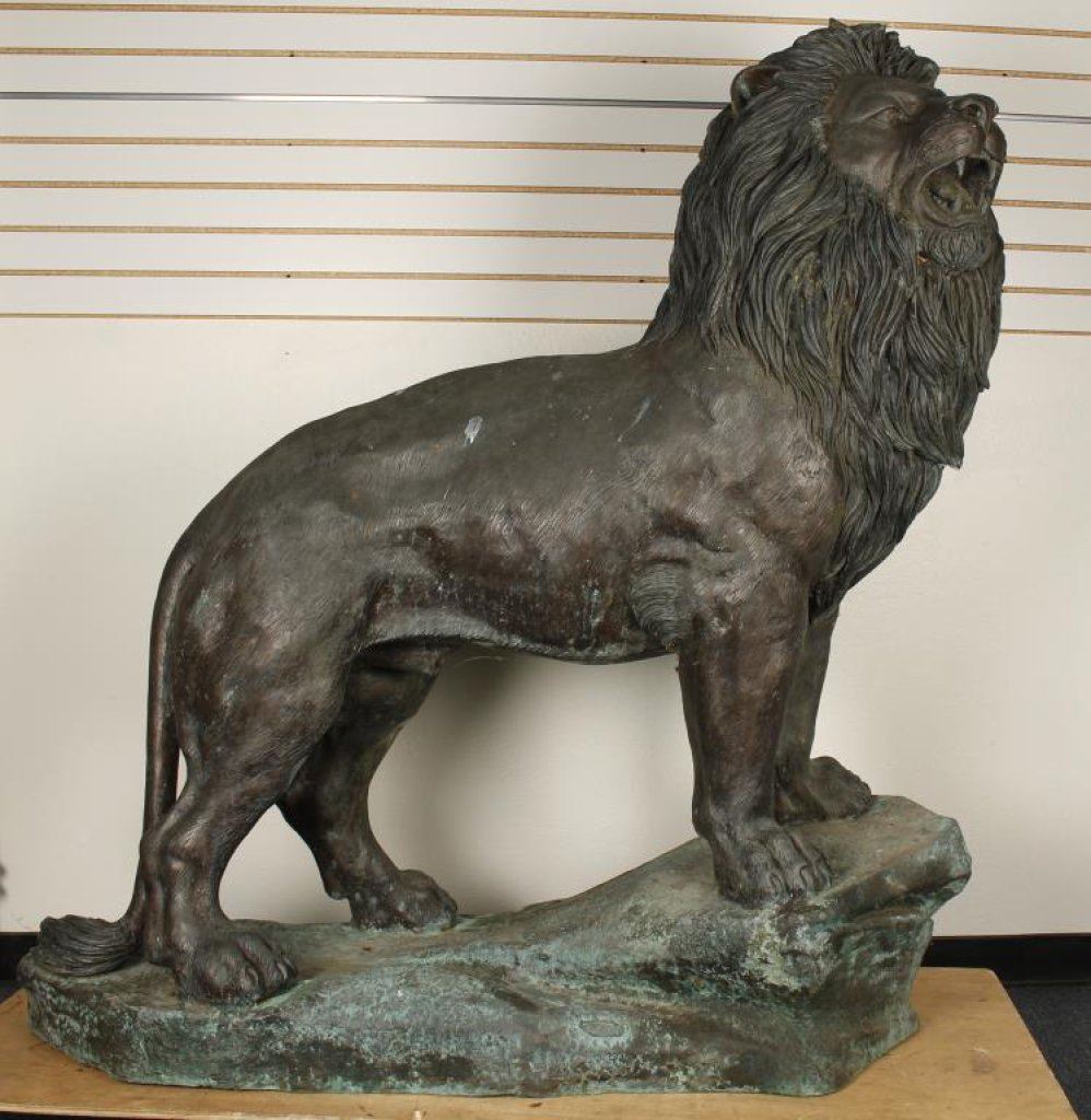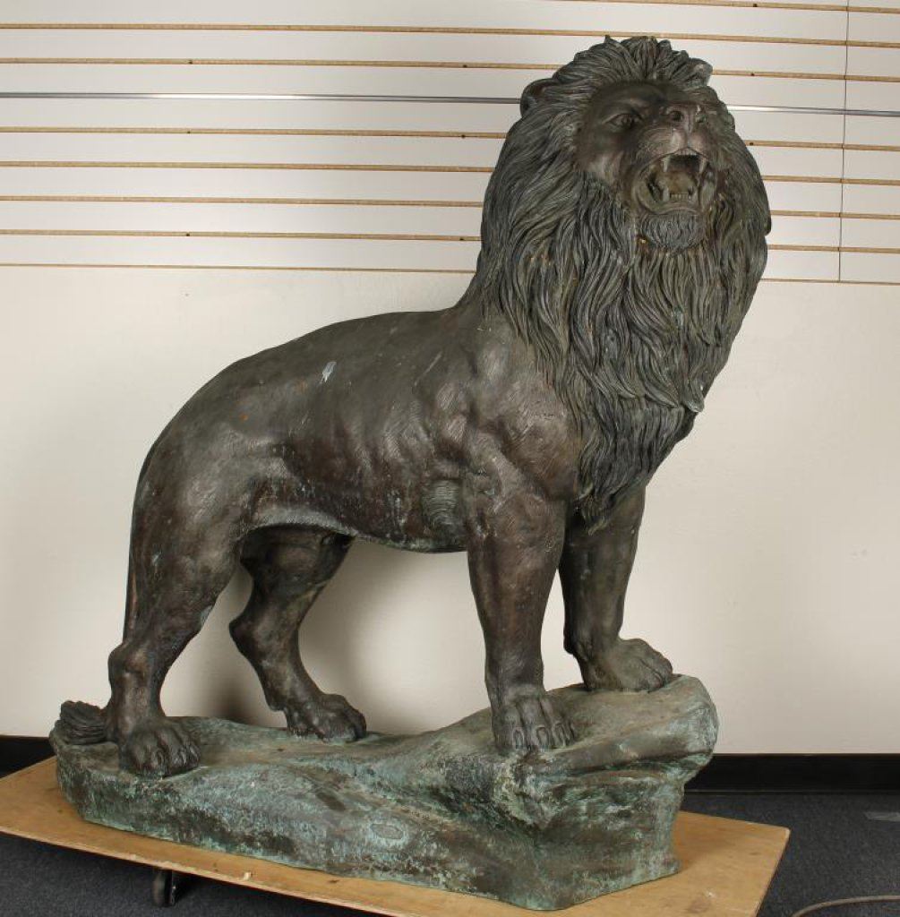 Hollow cast bronze lion approximately 56” tall by 51.5” long by 19.5” wide; great patina; has age and detail. Retails above $6,000. BUYER OF THIS LOT HAS OPTION TO BUY THE NEXT LOT FOR THE SAME HAMMER PRICE. Est.: $2,000-$4,000.