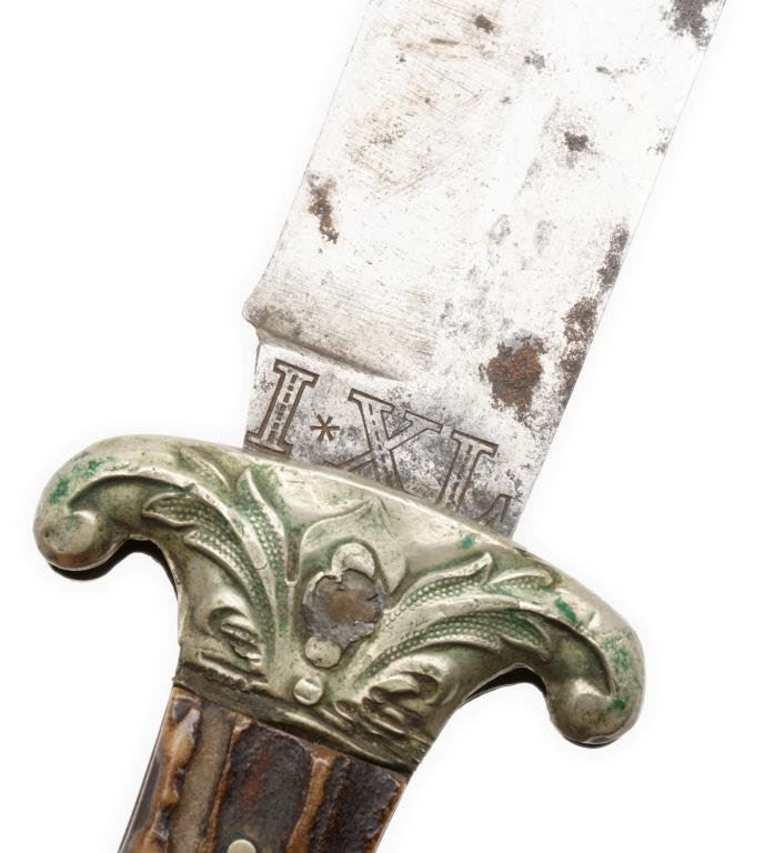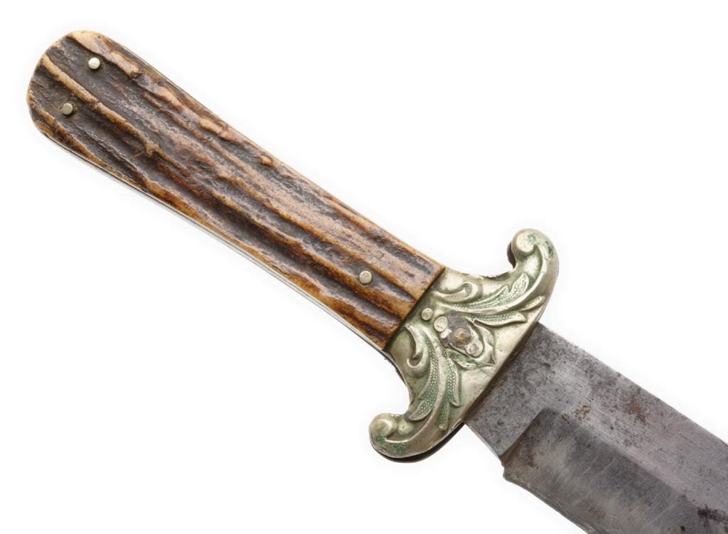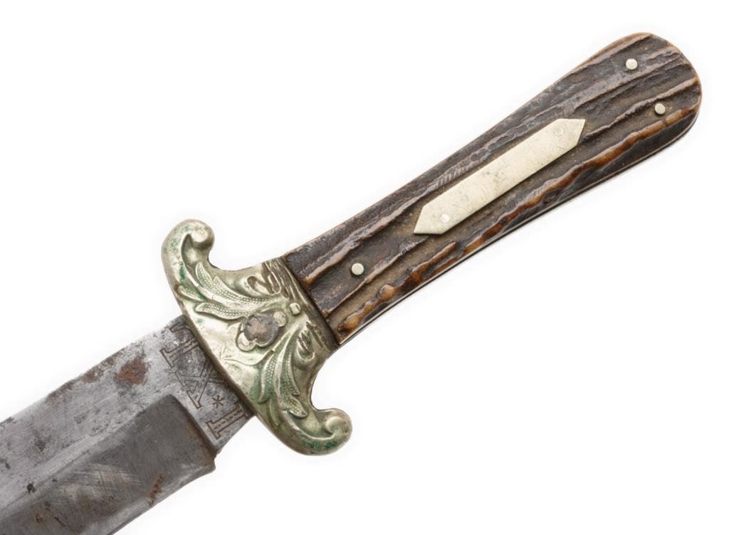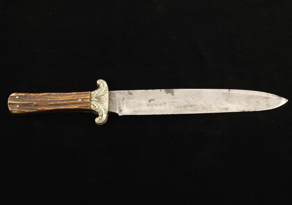 Spear point Bowie knife marked “G. WOSTENHOLM & SON/WASHINGTON WORKS/SHEFFIELD/IXL”, approximately 12” overall with an 8” blade and stag grip slabs. This classic Civil War era knife is in overall good to very good condition showing some spots of rust on the blade, otherwise a grey patina, sharp markings and very good grip and decorative cross guard. Est.: $450-$900.