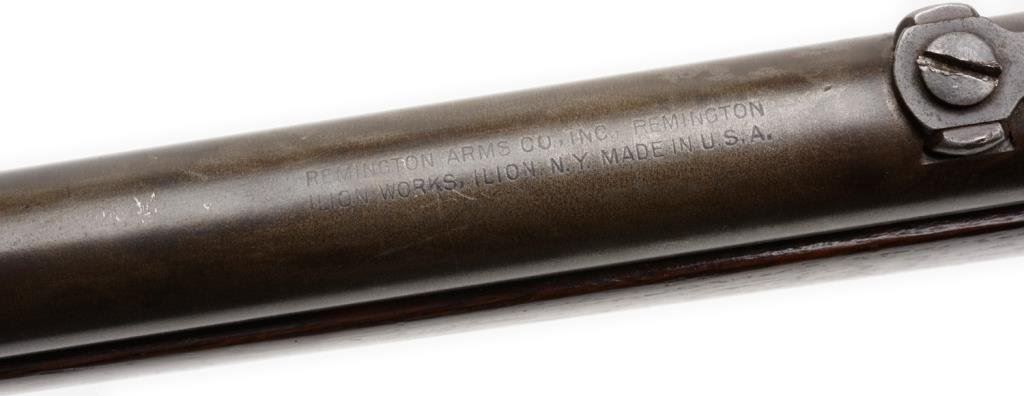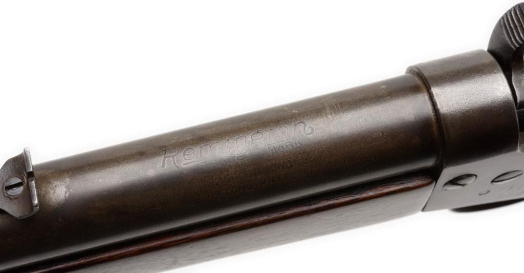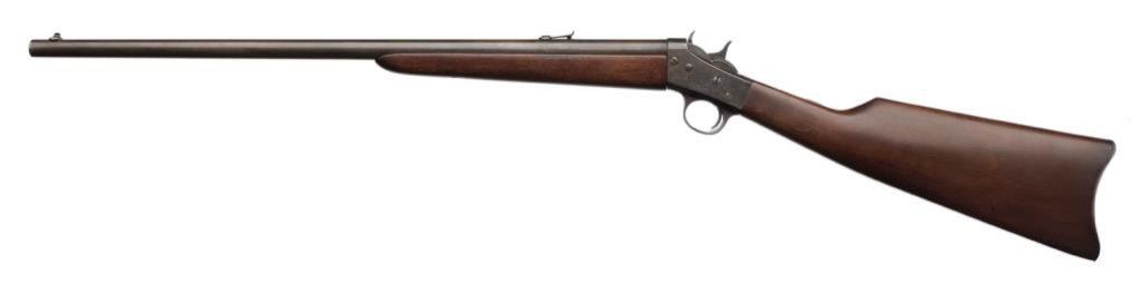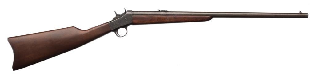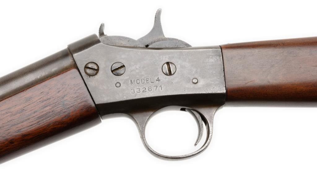Remington Rolling Block Model 4 single shot rifle, .22 caliber, 22.5” barrel, S/N 332671, blued and case hardened finish, wood stocks in overall very good condition displaying a plum brown patina on metal surfaces with some grey toning on the receiver; very good bore, crisp action, good markings and very good + wood. Est.: $300-$600.