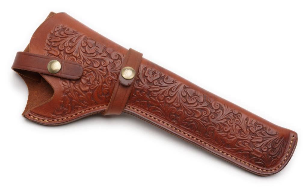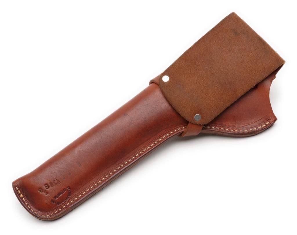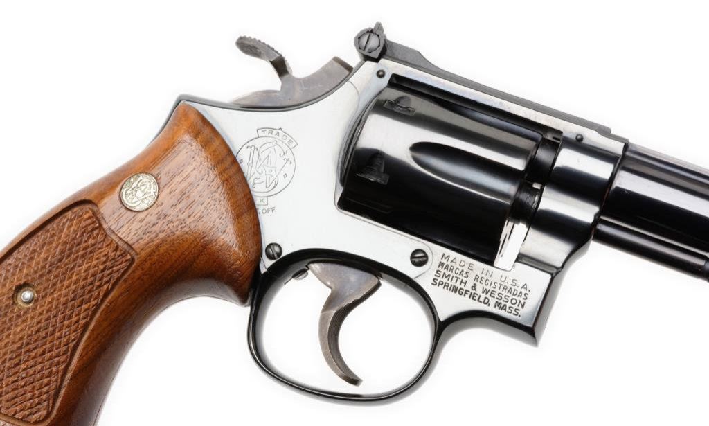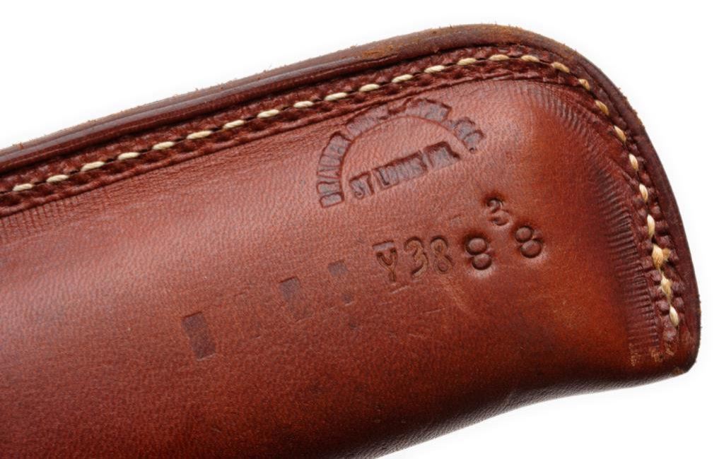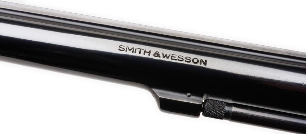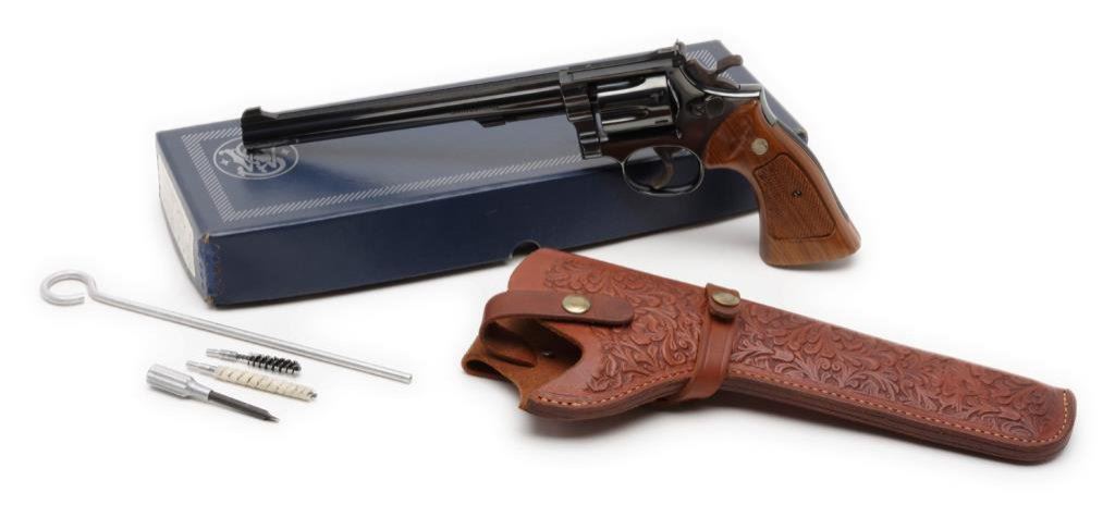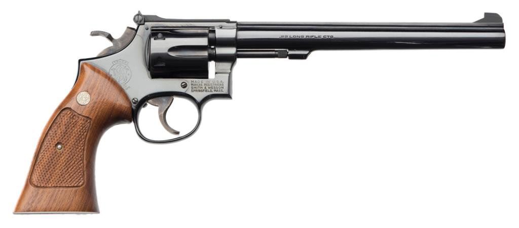 **Smith and Wesson Model 17-4 revolver, .22 Long Rifle caliber, with a 8 3/8” blued barrel, S/N 21K4771. The pistol is in excellent overall condition in the original blue box with factory packing material, cleaning rod and screwdriver. The pistol retains nearly all of its blued finish with a pinned barrel with full length matte rib. The checkered wood medallion grips are in excellent condition as well showing little to no use. The hammer and trigger display significant case color. The action is crisp, markings sharp and bore excellent on this nice S&W pistol. The pistol comes with a nice tooled leather holster marked “Brauer St. Louis, Mo”. Est.: $350-$700.