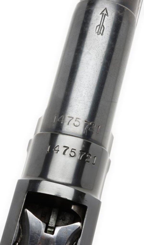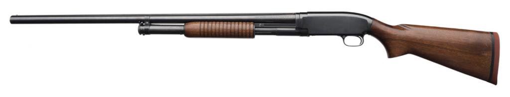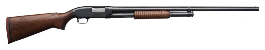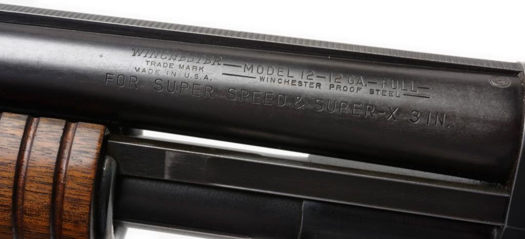 *Winchester Model 12 3” Magnum pump action shotgun, 12 Gauge, serial #1475721. The shotgun is in overall nearly fine condition with 30” blued barrel with full length raised milled rib and metal bead front sight. The barrel and receiver retain the majority of their blued finish with only minor wear at the muzzle noted. The smooth wood stocks are in overall very good condition with small mars and loss of finish. The butt stock ends with a red, rubber Winchester marked recoil pad and a 13 ¾” LOP. The bore is very good and may clean, the action is crisp and markings sharp on this most acceptable Model 12. Est.: $800-$1,600.