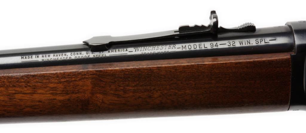 Winchester Model 94 lever action carbine, .32 Win Spl caliber, 20” round barrel, S/N 2304428, blued finish, wood stocks in overall like new condition showing little use or handling. New Haven, CT. made! Est.: $400-$800.