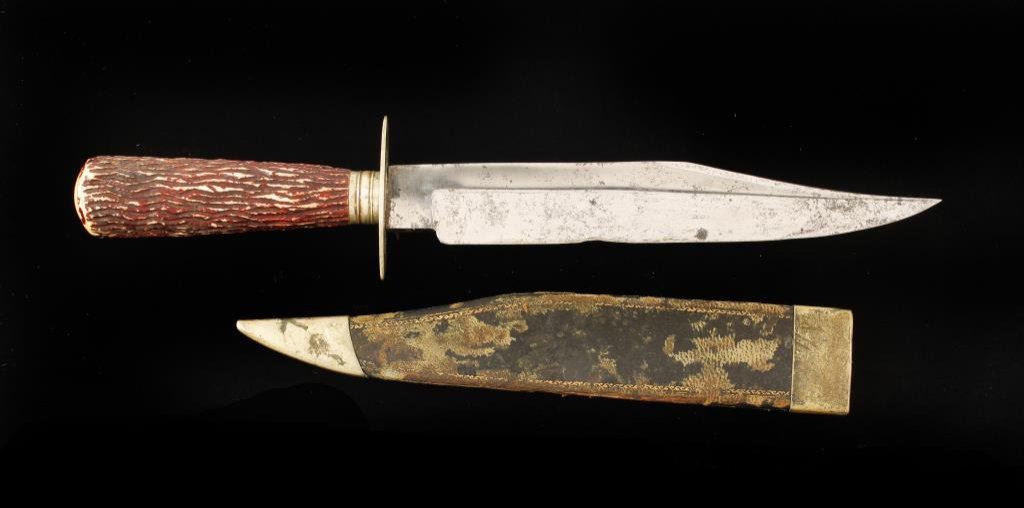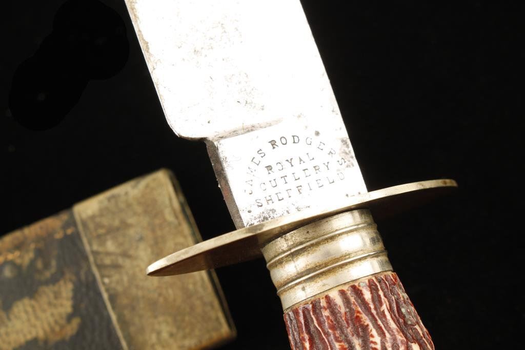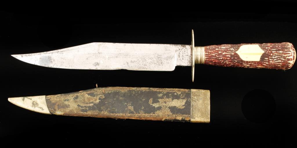 Bowie knife with sheath marked “James Rodgers, Royal Cutlery, Sheffield”; approximately 12” overall with an 8” blade and stag grip; blade shows some original polish; blade has one ground area otherwise blade is good to very good; grip is very good; sheath shows some leather losses and retains metal throat and tip. Est.: $700-$1,400.