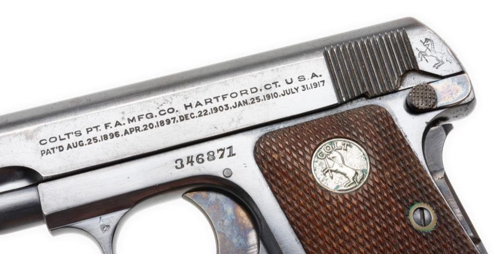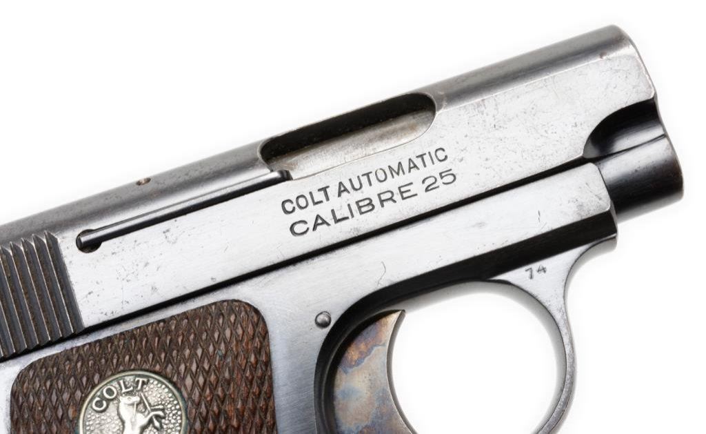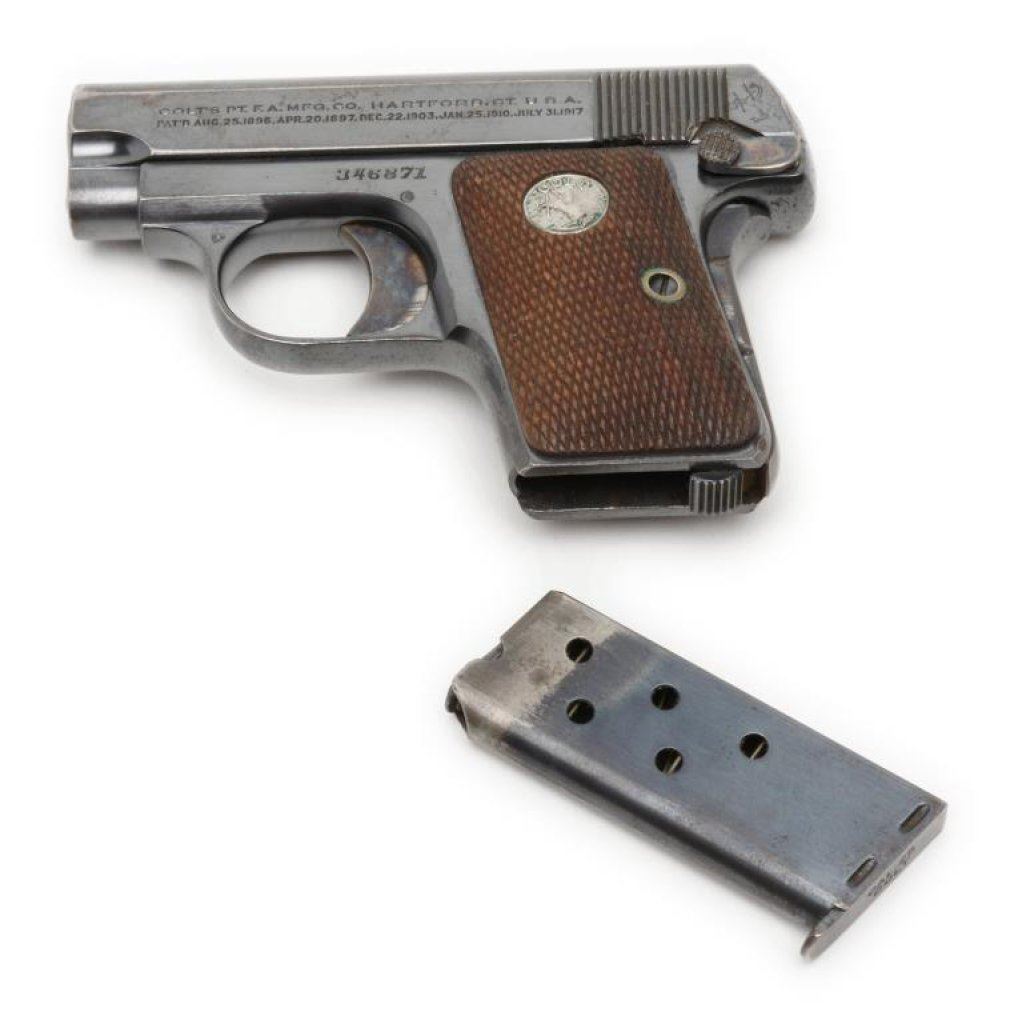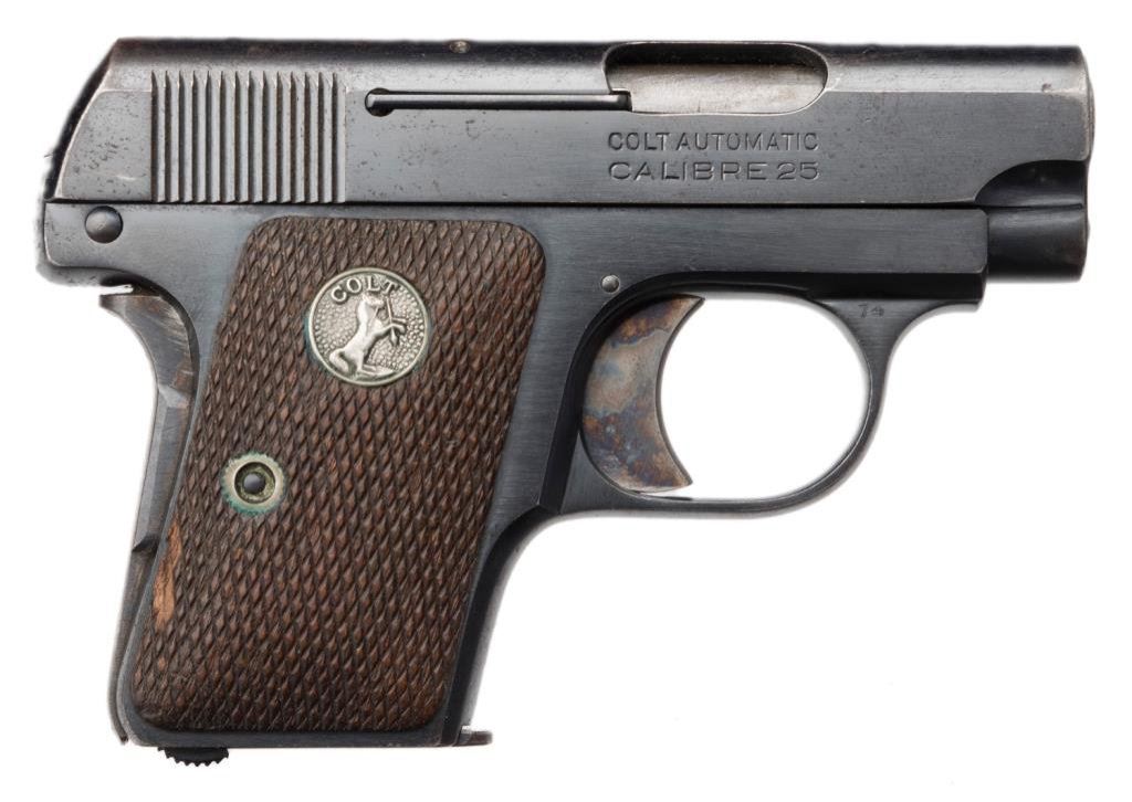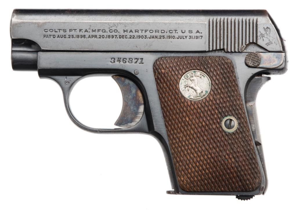 **Colt Model 1908 semi-auto pistol, .25 caliber, 2” barrel, S/N 346871, blued finish, checkered wood medallion grips, two-tone magazine in overall fine condition showing the majority of its original finish, fine bore, crisp action and markings, very good + grips with a mar to the bottom back edge of the right grip. Est.: $500-$1,000.