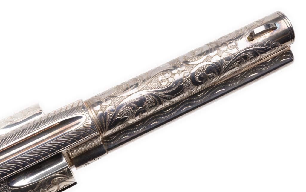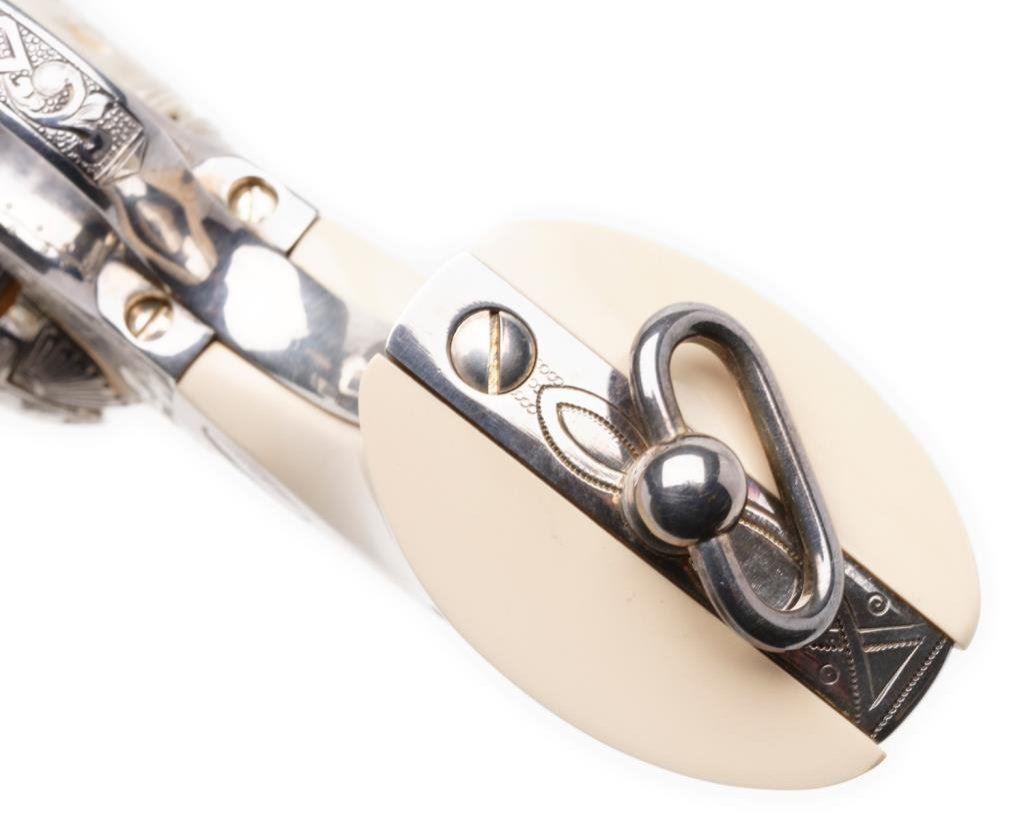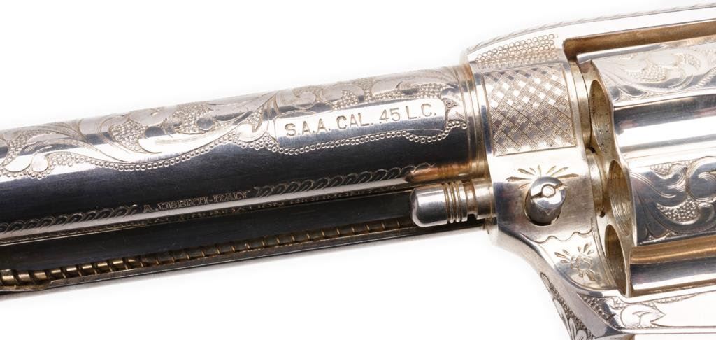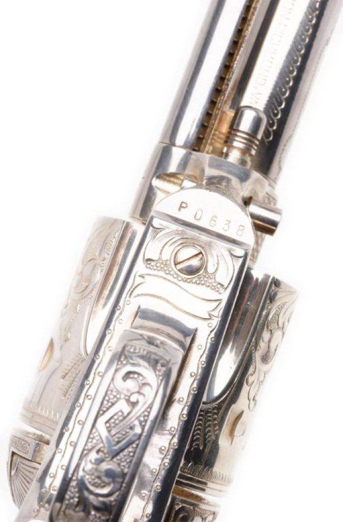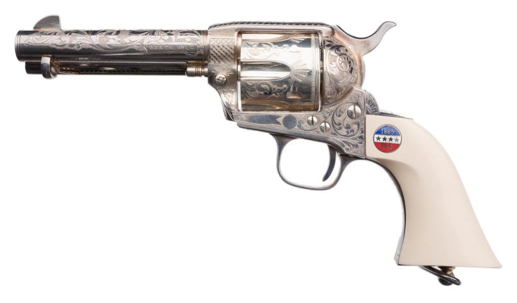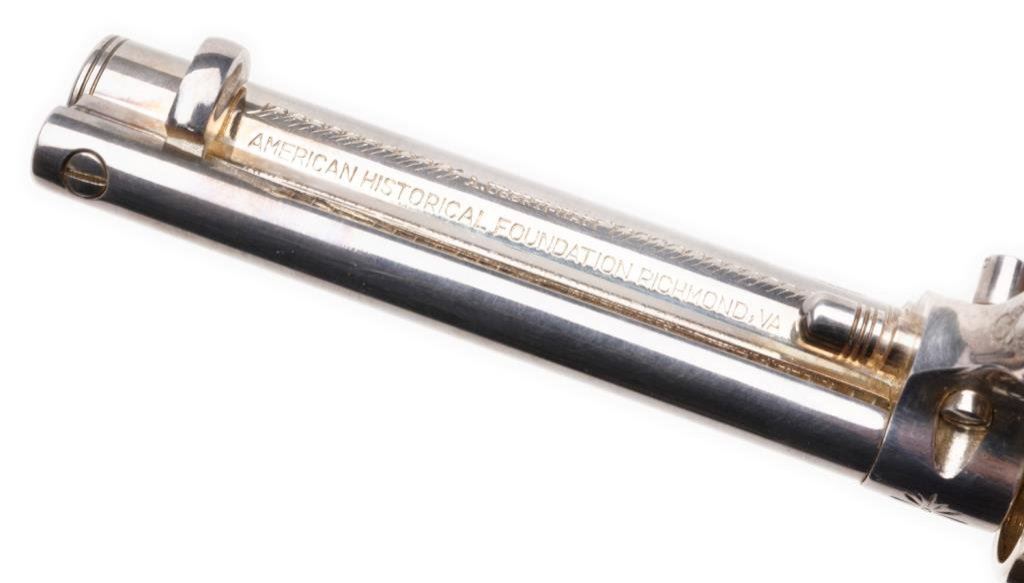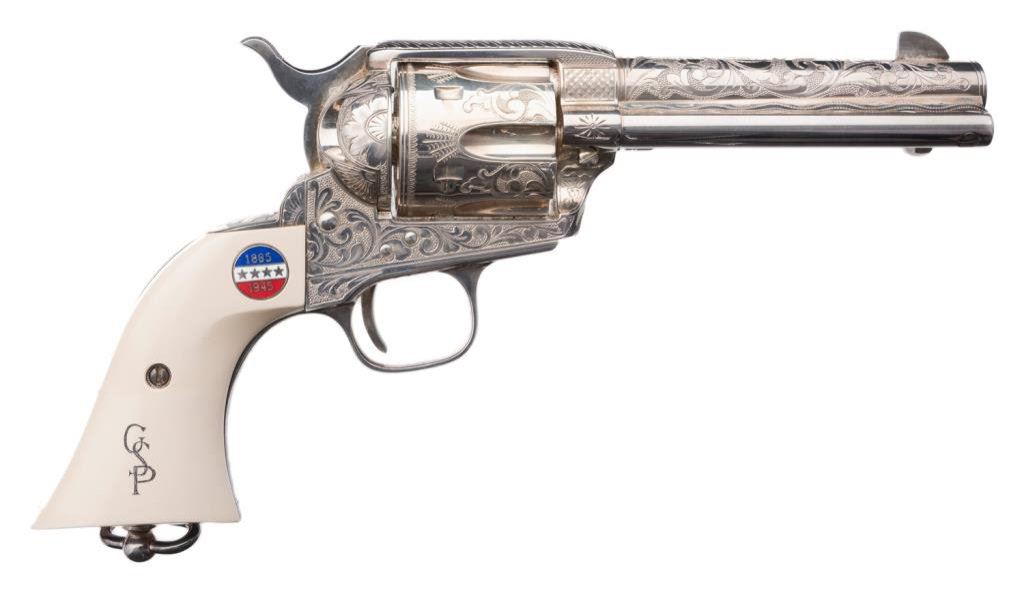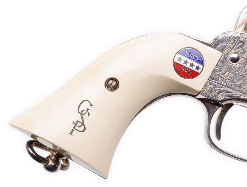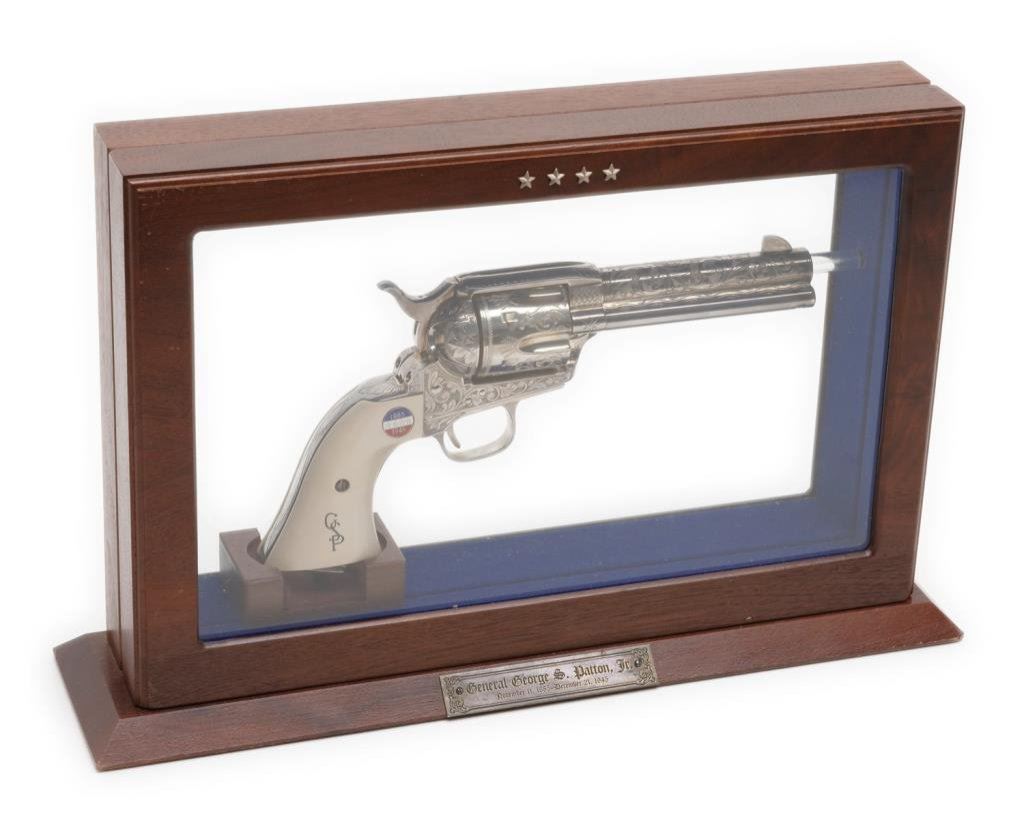 **American Historical Foundation Gen. George S. Patton engraved Commemorative SAA by Uberti in presentation wood and glass display case, .45 caliber, 4.75” barrel, S/N P0638, silver finish, faux ivory medallion grips with red, white and blue enamel inlays of 4 stars and the dates 1885-1945 (Patton’s birth to death). This set is in overall like new condition showing little handling; right grip displays the intertwined initials “GSP”. Patton was known to carry a Colt SAA during the war that this Commemorative is designed after. Est.: $800-$1,600.
