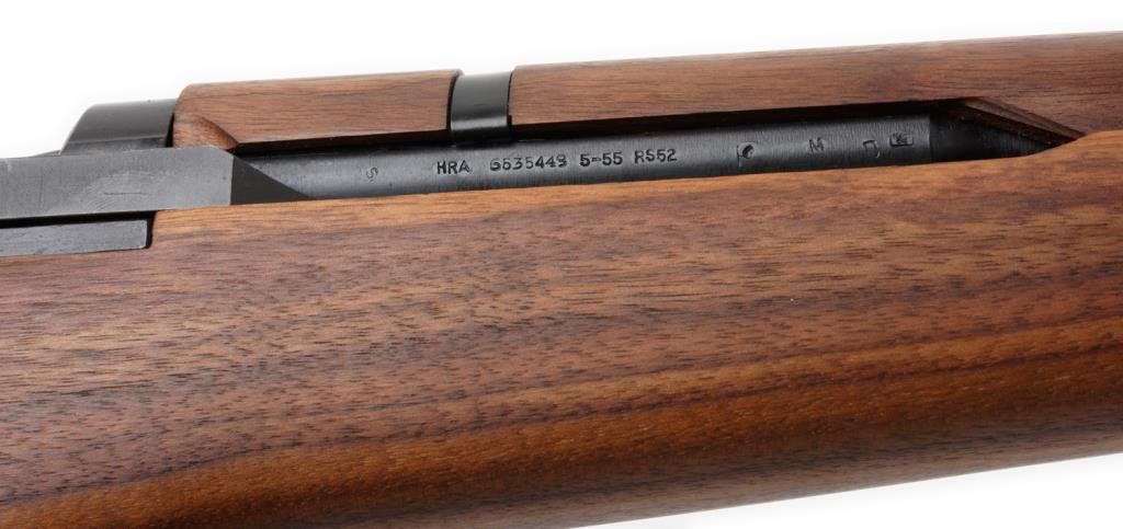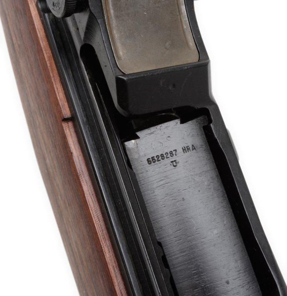 U.S. M1 Garand semi auto rifle by Harrington & Richardson Arms Co., .30 caliber, 24” HRA proofed barrel marked “5-55”, S/N 5631105 in overall very good to nearly fine condition showing the majority of its military finish, fine bore, crisp action, sharp markings and nicely figured wood with no visible proofs or cartouches. The stock appears to be as new with extraordinary figure in the buttstock. The rifle retains its sling swivels and a metal butt plate with trap. A good looking and desirable H&R Garand with an outstanding stock. Est.: $1,200-$1,800.
