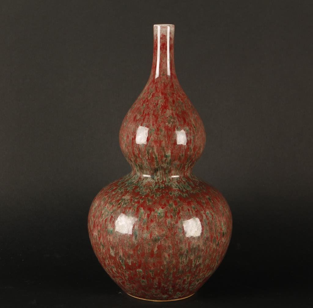 Kang Xi marked vase, approximately 10.5” in height, red and green; double gourd shape; double blue circle marked on bottom. Est.: $1,000-$2,000.