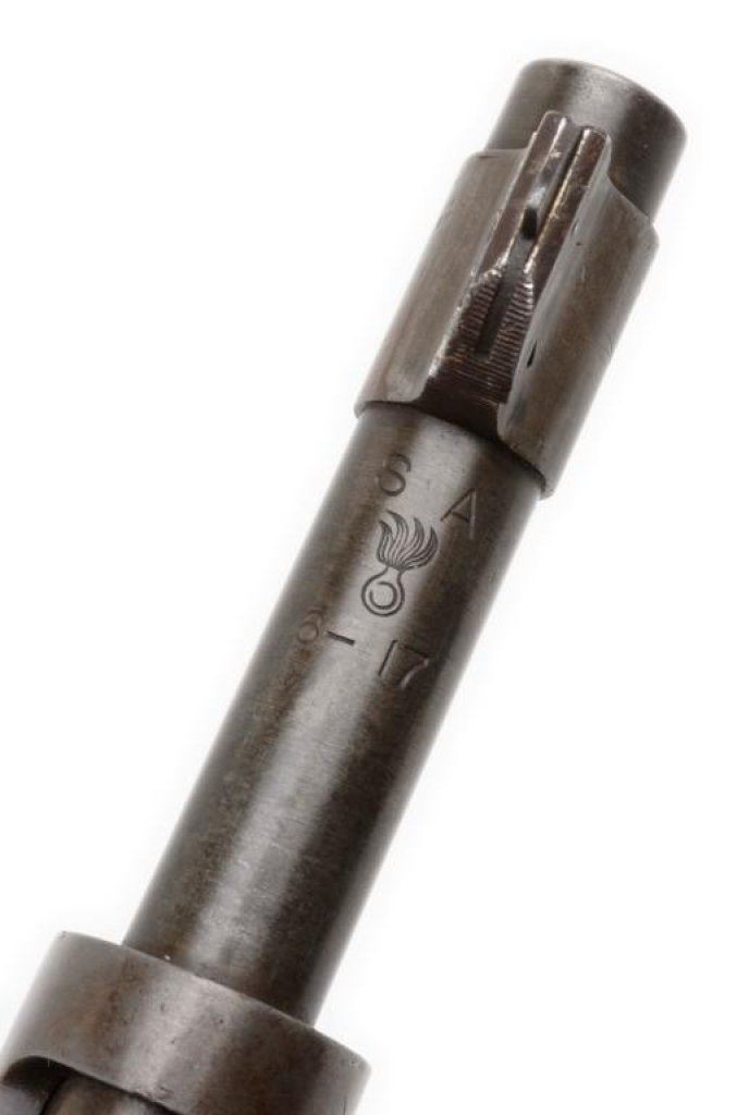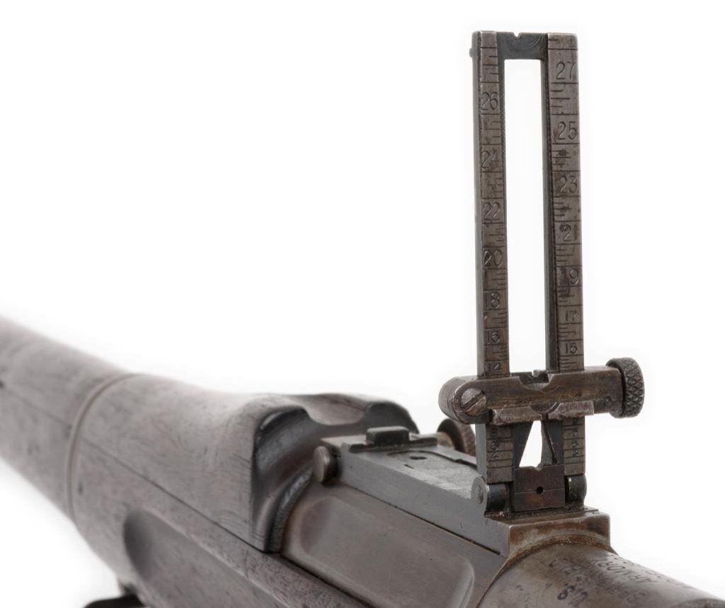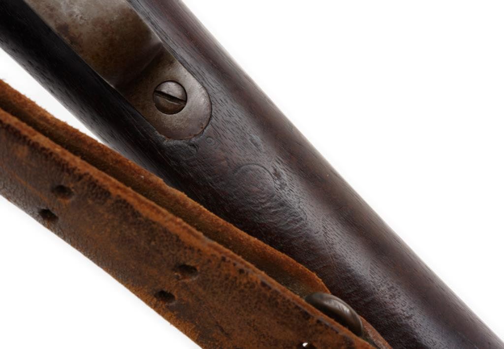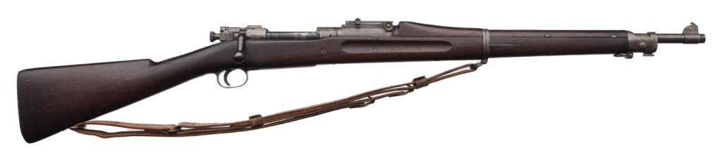 ++U.S. Springfield Armory Model 1903 bolt action rifle, .30 caliber, S/N 666725. The rifle is in overall good condition with a 24 1/2” barrel. The metal parts retain significant military finish with slight surface rust evident on the action and magazine plate. While the barrel has SA and the Flaming Bomb proof dated 6-17. The smooth wood stock is in good condition showing mars and bruising consistent with use. The rifle features original sling swivels, period leather sling, a tangent rear sight and smooth metal butt plate with trap. The action is crisp, markings sharp and bore very good on this ’03. A desirable, early low number Springfield. Est.: $1,250-$2,750.