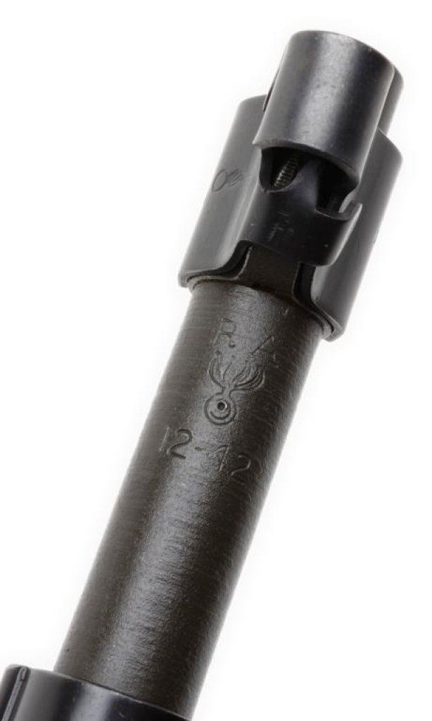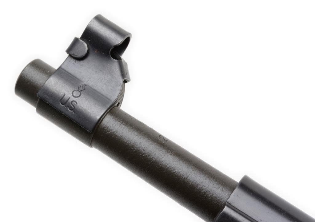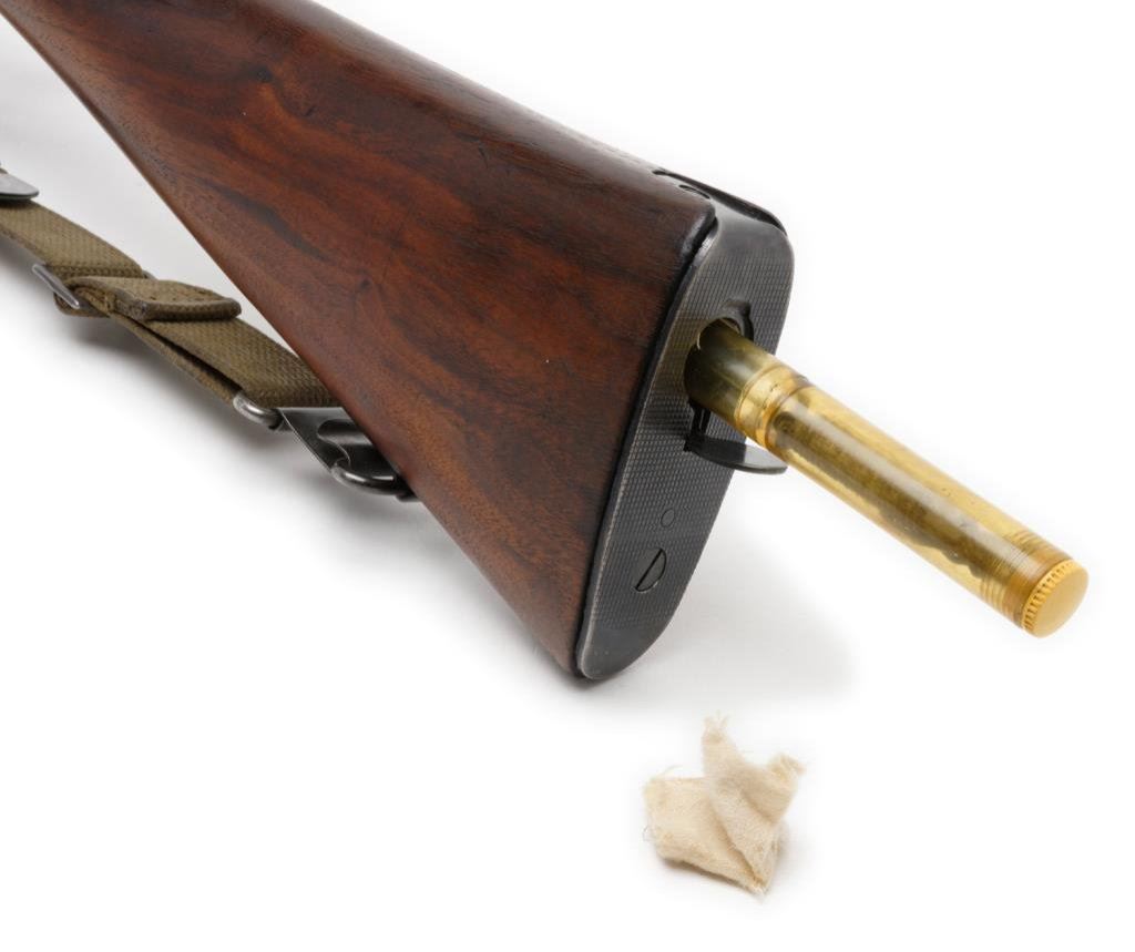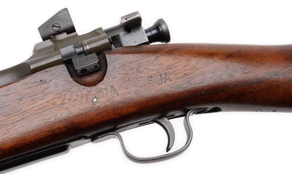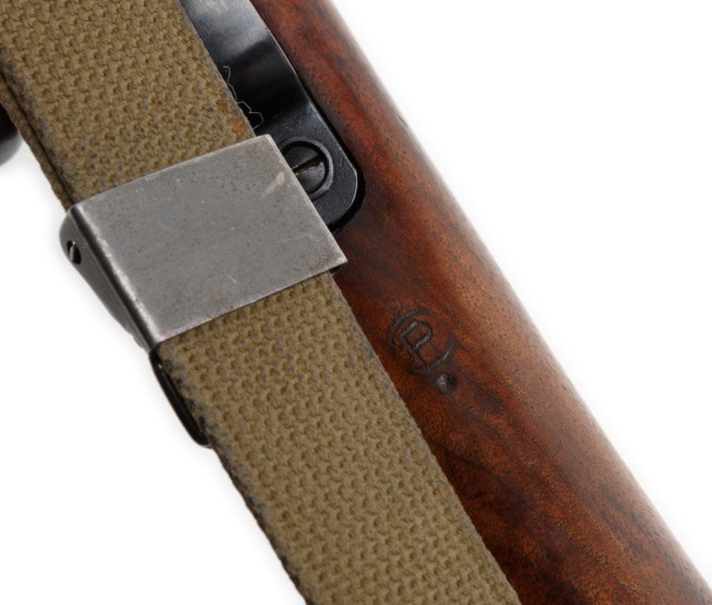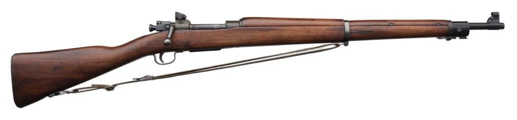 ++Remington Model 1903-A3 bolt action rifle, .30 caliber, S/N 3348859. The rifle is in overall very good to nearly fine condition with a 24 ½” barrel. The barrel and receiver retain nearly all of their military finish with a removable front sight hood. The barrel is marked” RA 12-42” with the Flaming Bomb proof. The smooth wood stock is in overall very good condition with small mars and bruises consistent with use. The stock has the circle “P” cartouche behind the trigger guard and “RA”, “FJA” and the crossed cannons on the left hand side of the stock below the receiver. Additionally, the stock features a metal butt with trap, sling swivels, brass pins and an OD green canvas sling. A most acceptable 03-A3. Est.: $500-$1,000.