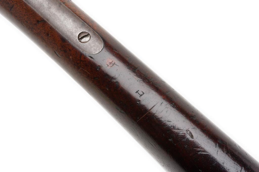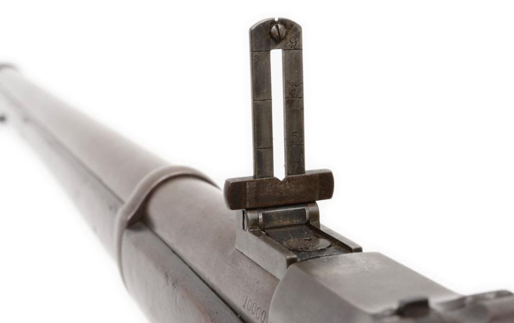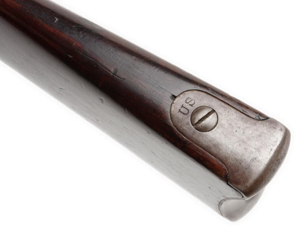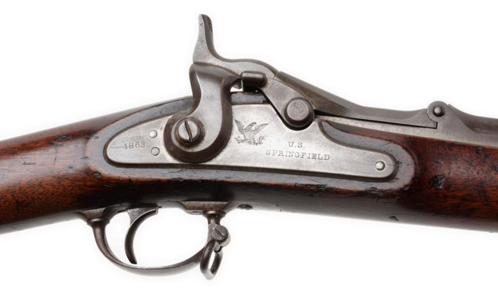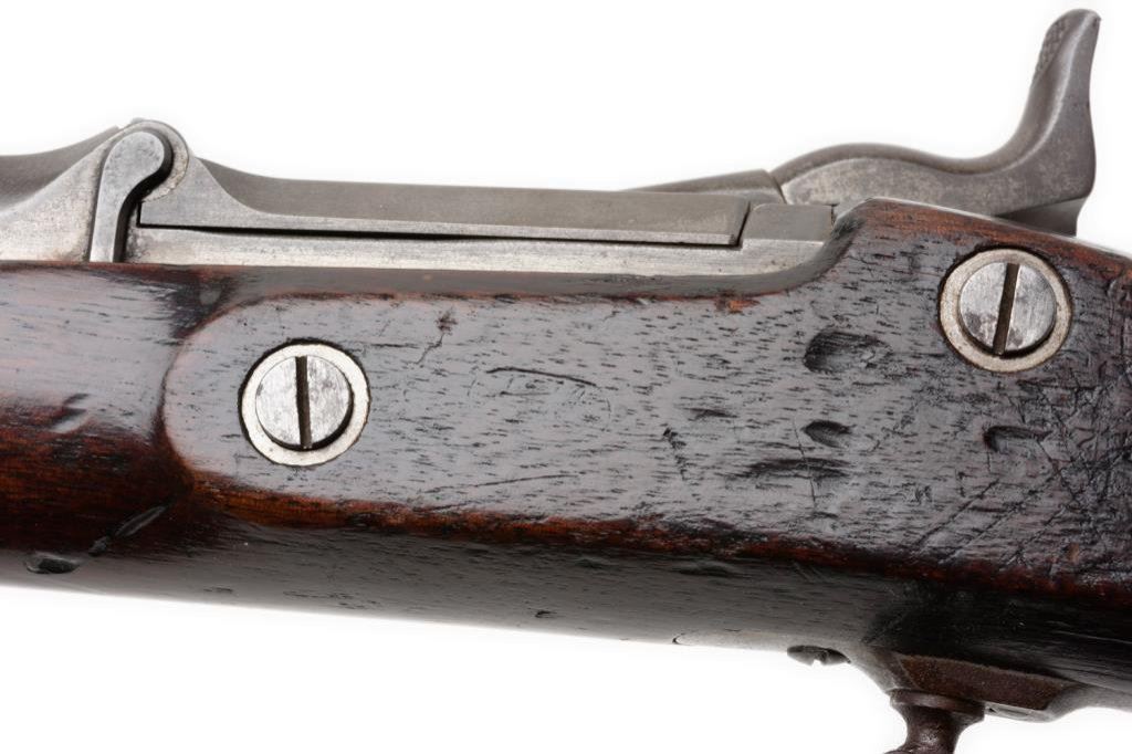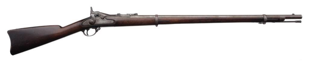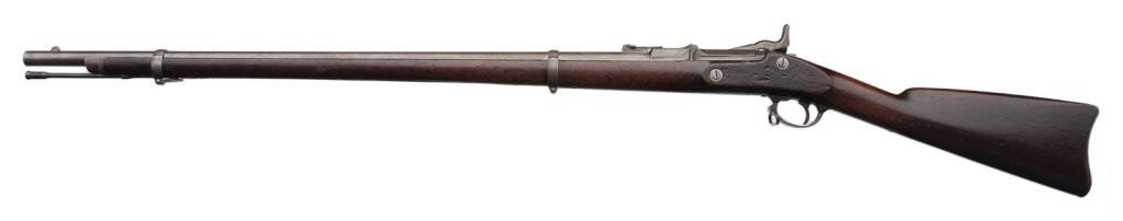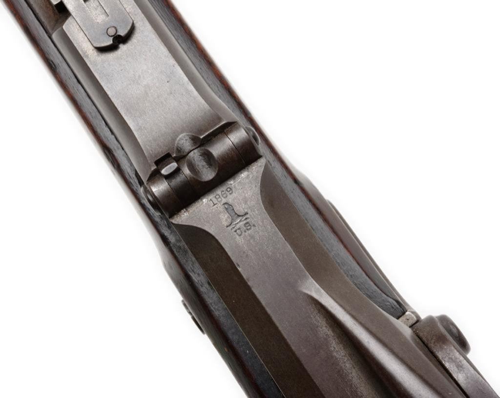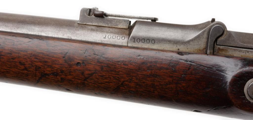 U.S. Springfield trapdoor conversion rifle, .50 caliber, 32.5” barrel, S/N 10,000, (at rear right side of barrel and adjacent to same number at front right side of receiver); full stock, iron ramrod, sling swivels in overall very good + condition displaying a pleasing patina to metal surfaces, very good bore, crisp action and markings, 1863-dated lock plate and very good + wood stock with partial inspector’s cartouche on left side of stock and small “L” inspection on the underside of the butt stock. Est.: $1,000-$1,600.