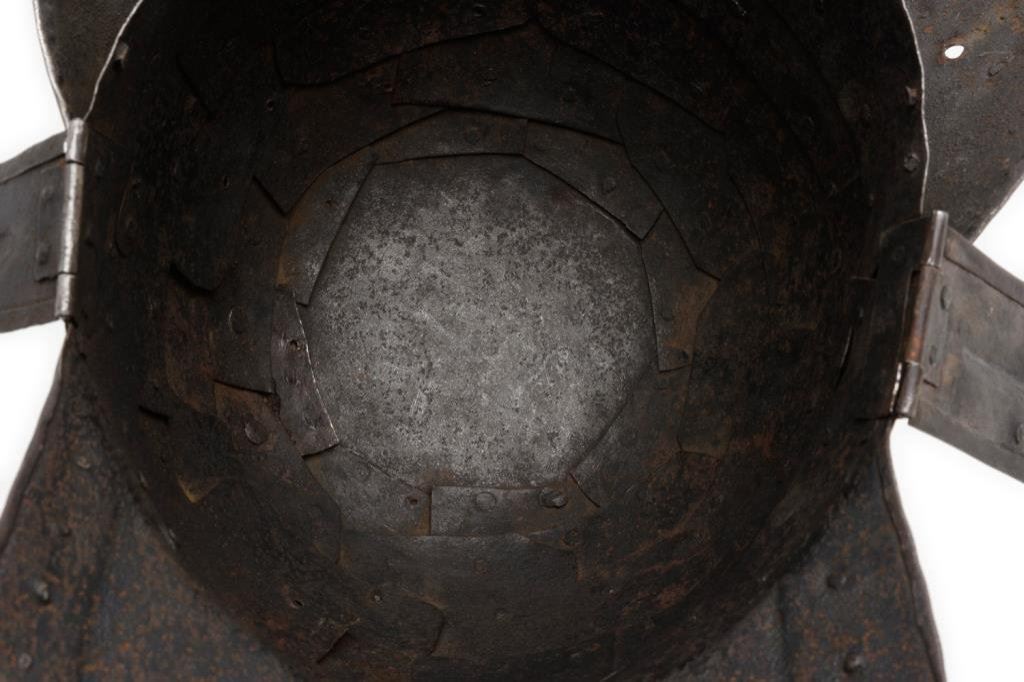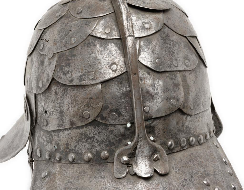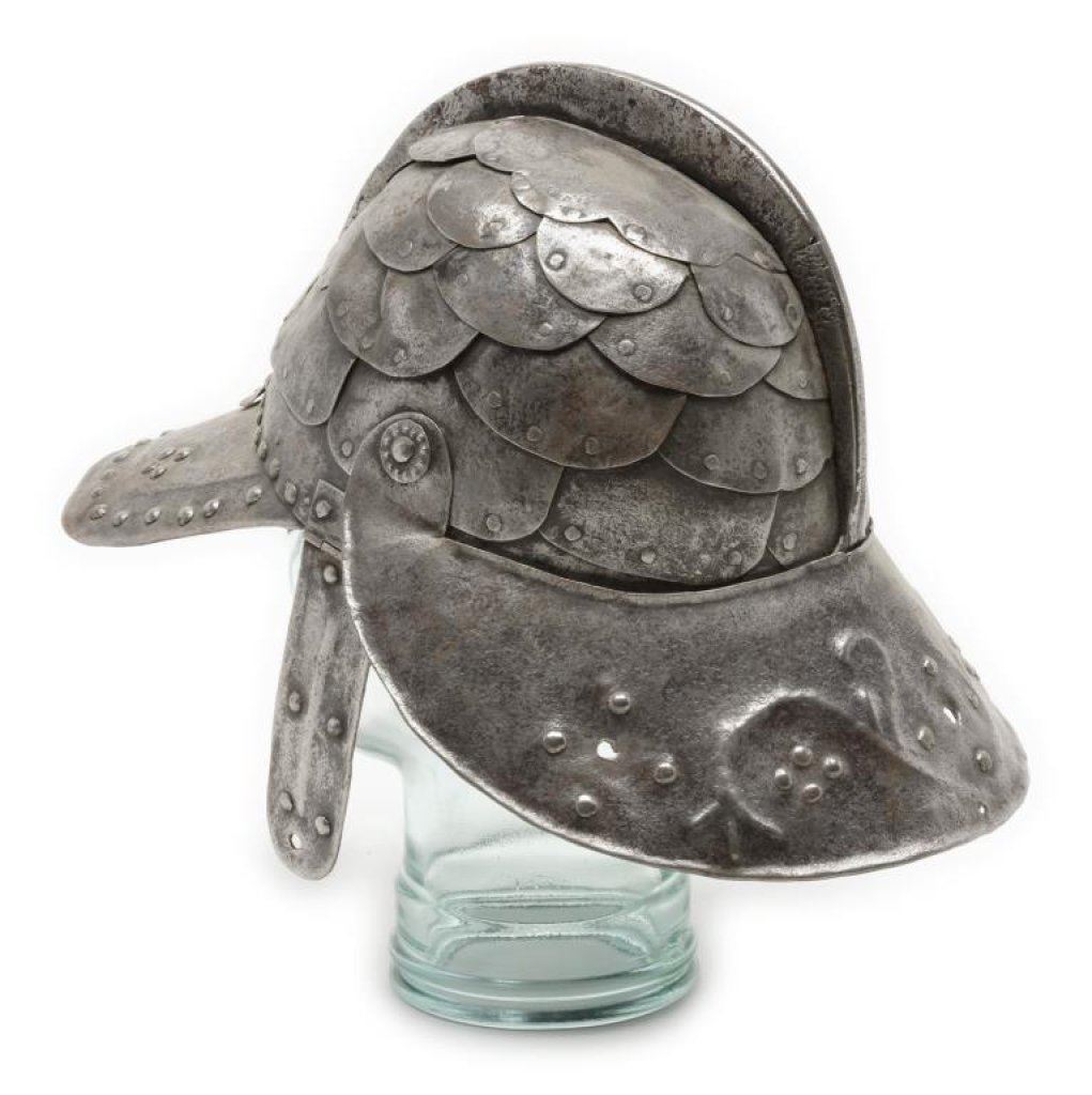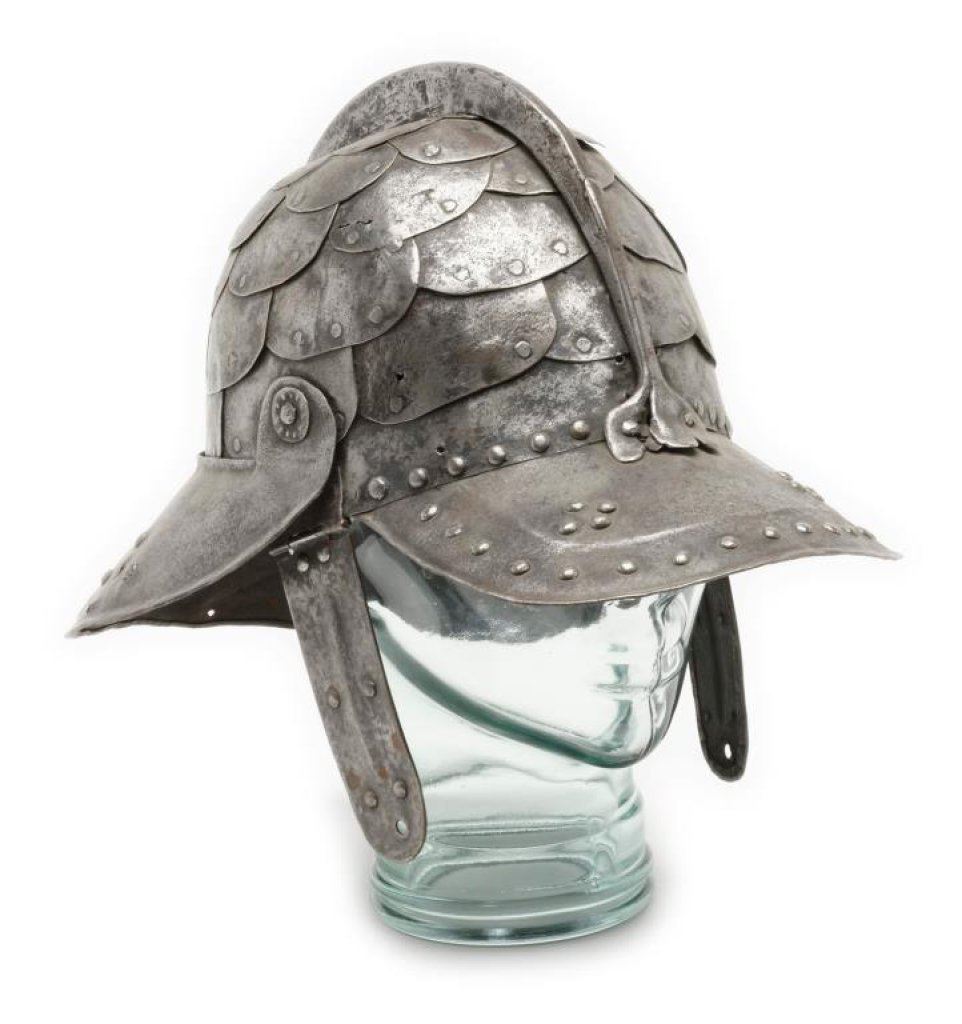 Lot 919 Iron helmet with small “lobster tail” and ear flaps, ca 17th Century; disp