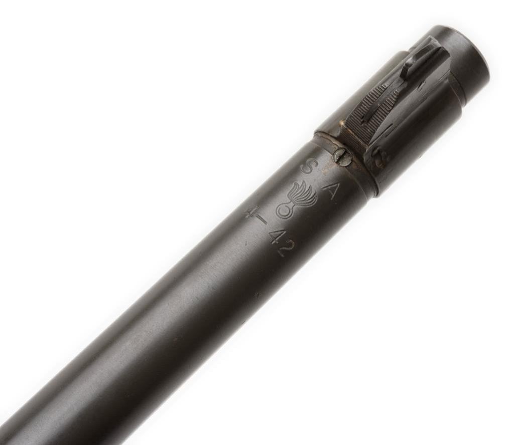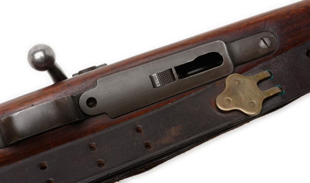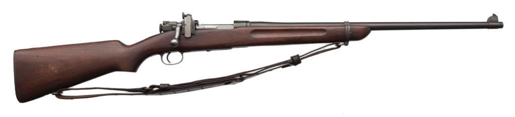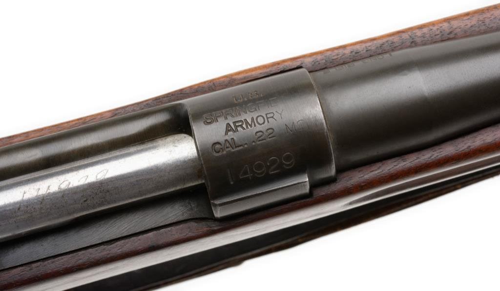 **U.S. Springfield Model 1922 bolt action rifle, altered to “M2” variation, .22LR caliber, 24” round S.A. barrel dated “4-42”, S/N 14929, blued finish, wood stock, no magazine, leather sling and adjustable Lyman receiver mounted rear sight; top of receiver is marked “M2” as is the bolt and bolt handle. The same serial # is etched on the top of the bolt. This gun is in overall very good to fine condition showing the majority of its military finish, fine bore, crisp action, good markings and very good to fine wood stock with a couple scattered minor old mars from storage. Est.: $1,000-$2,000.