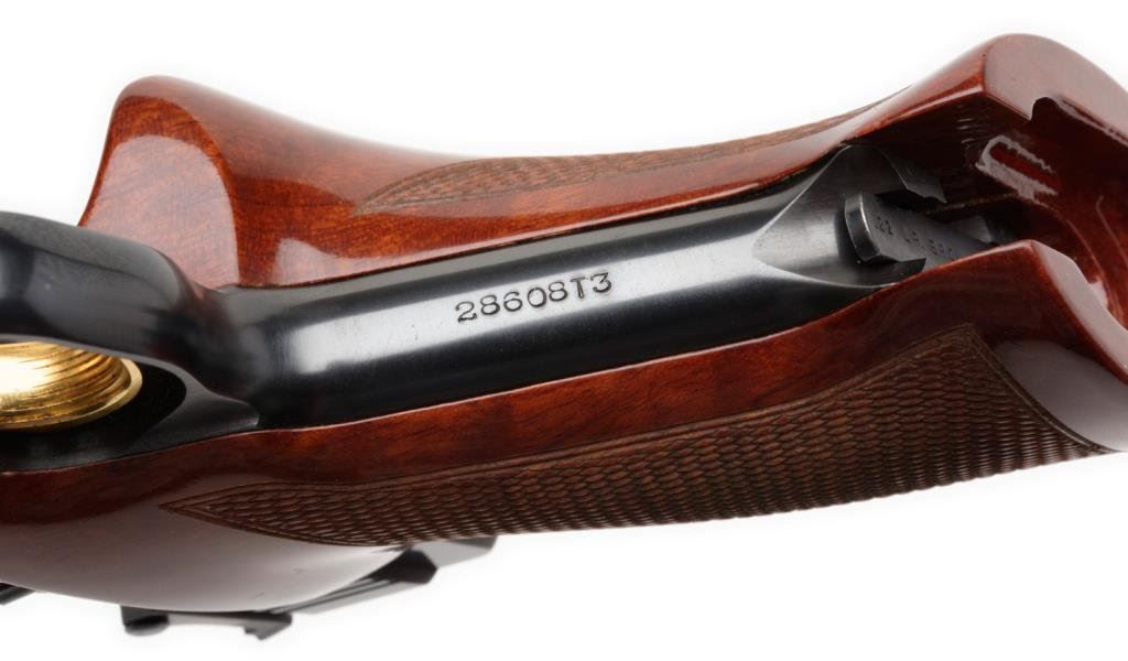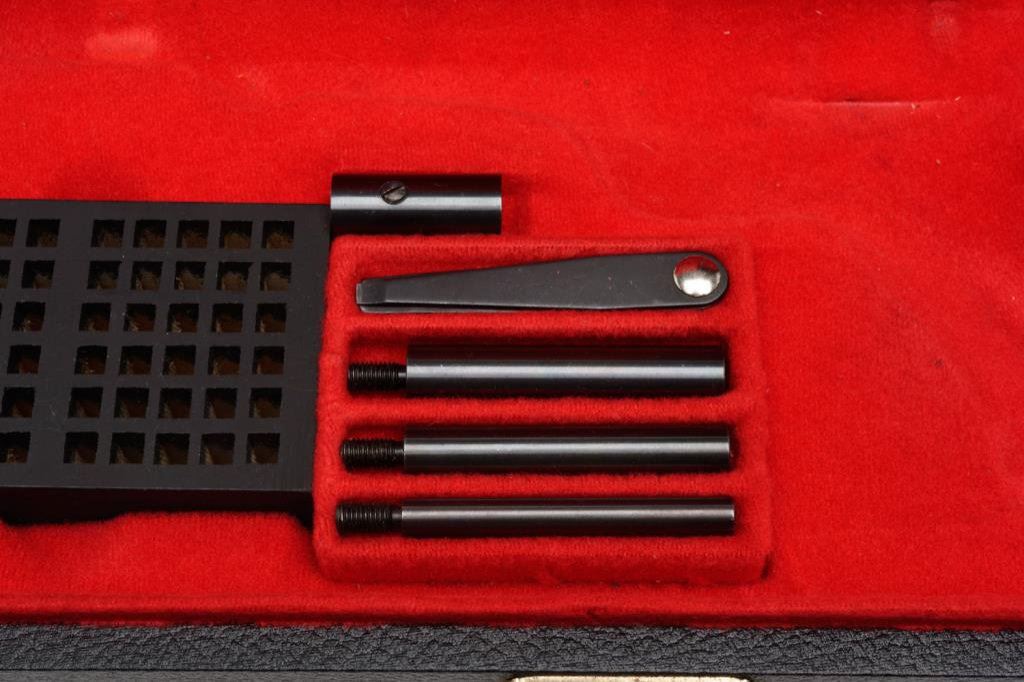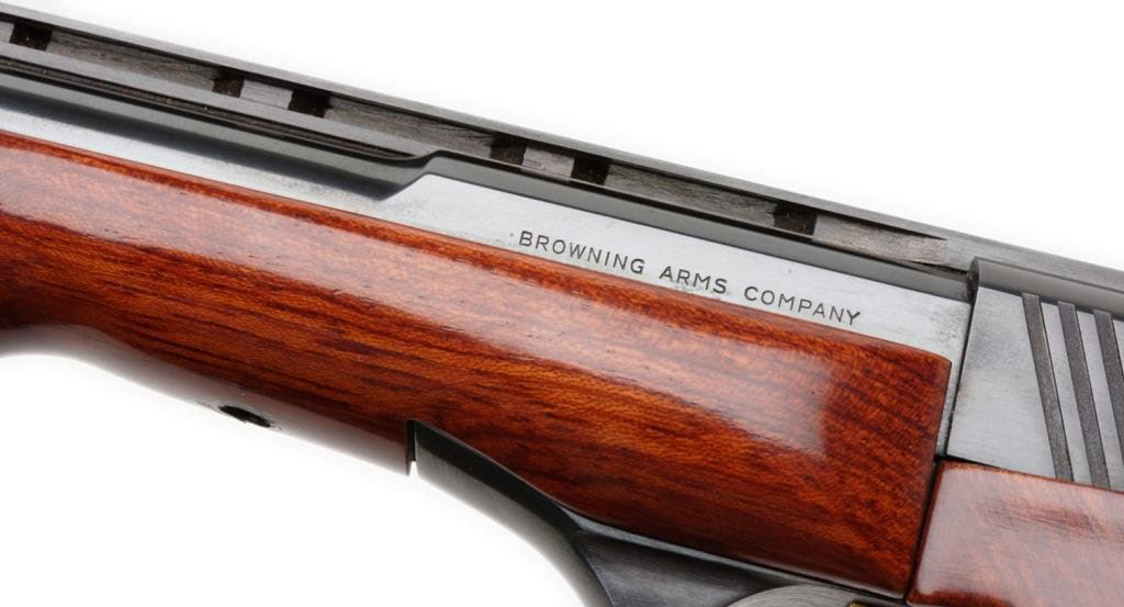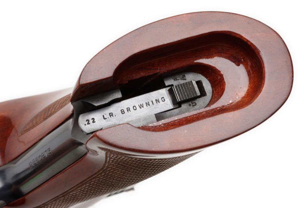 **Factory cased Belgian-made Browning Medalist target semi-automatic pistol with compliment of barrel weights and tool. .22LR caliber, 6.75” barrel, S/N 28608T3, blued finish and checkered wood forend and checkered wood thumb rest target grips. This gun is in overall fine to excellent condition showing approximately 99% original finish, fine bore, action, markings and grips. The casing and accessories are also fine. Est.: $1,000-$2,000.
