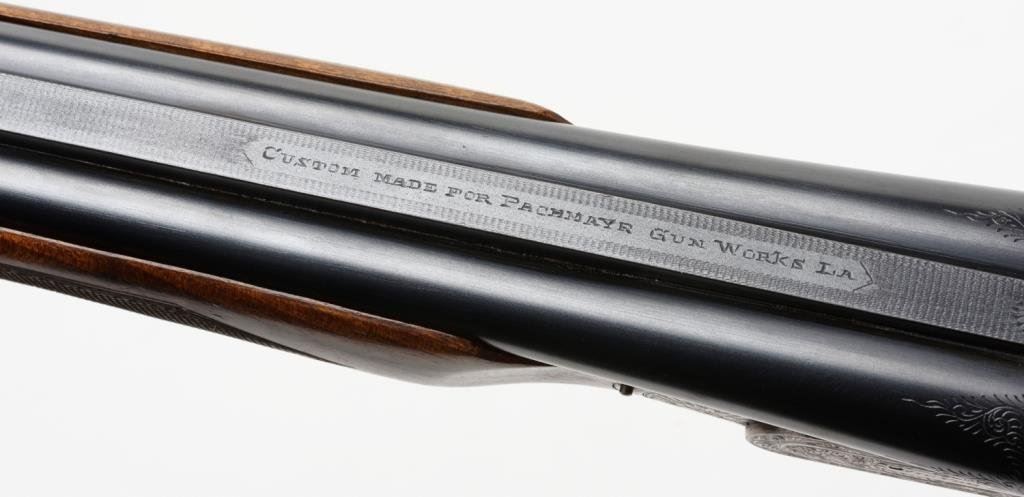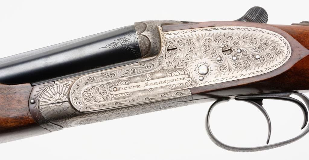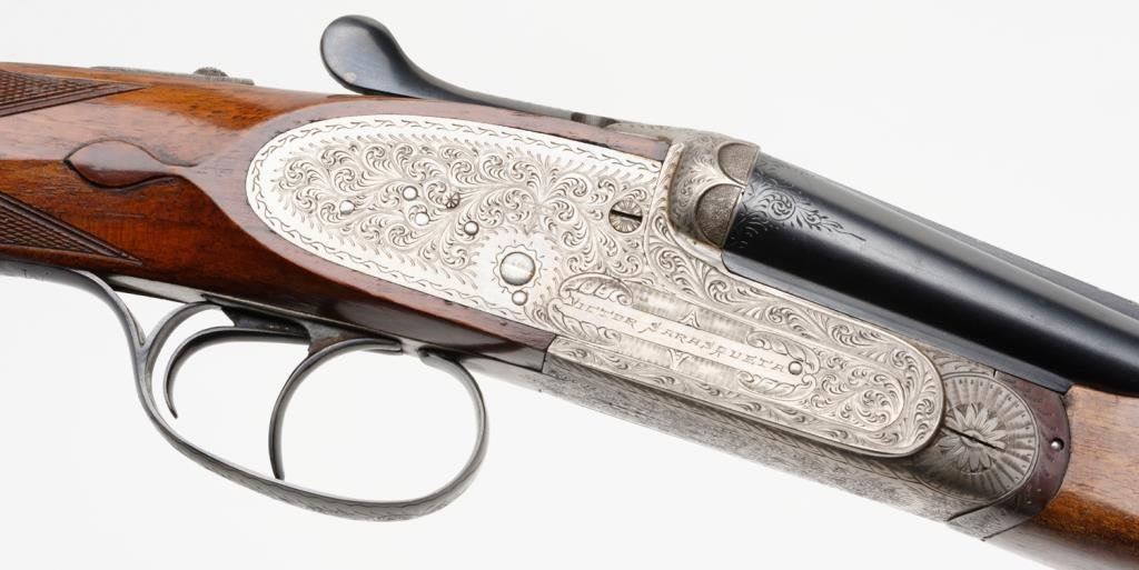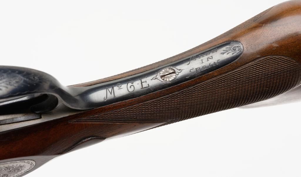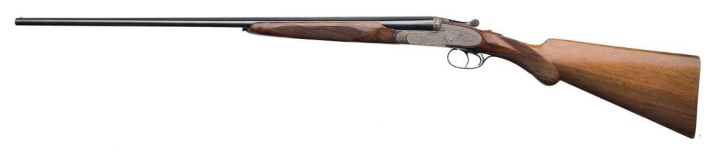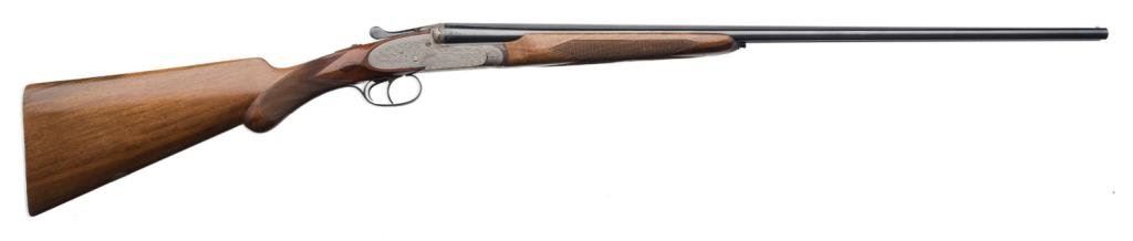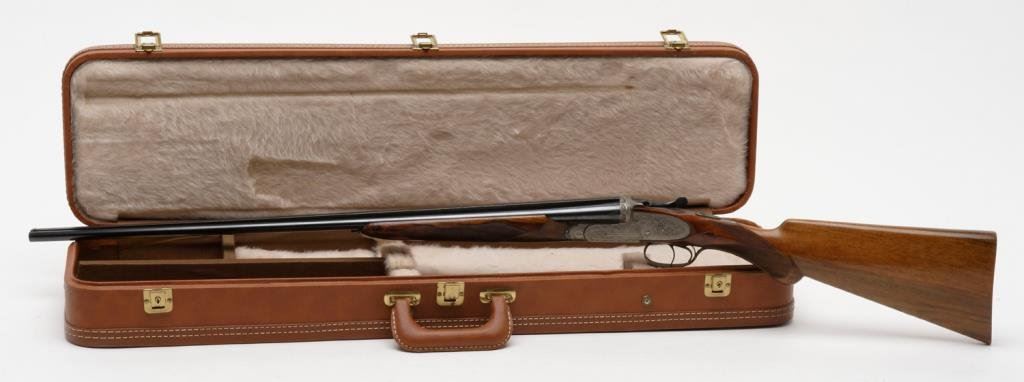 **Spanish Sarasqueta Model 6E SxS hammerless shotgun, .410 gauge, 28” barrels, S/N 113272, blued finish to barrels, engraved receiver, double triggers, checkered wood stocks, length of pull from front trigger to end of checkered butt stock is 14.625”. Accompanied by Browning compartment leather covered hard carry case. This shotgun is in overall fine condition displaying the majority of its original finish, fine bores, crisp actions, sharp markings and overall fine wood. Est.: $875-$1,750.