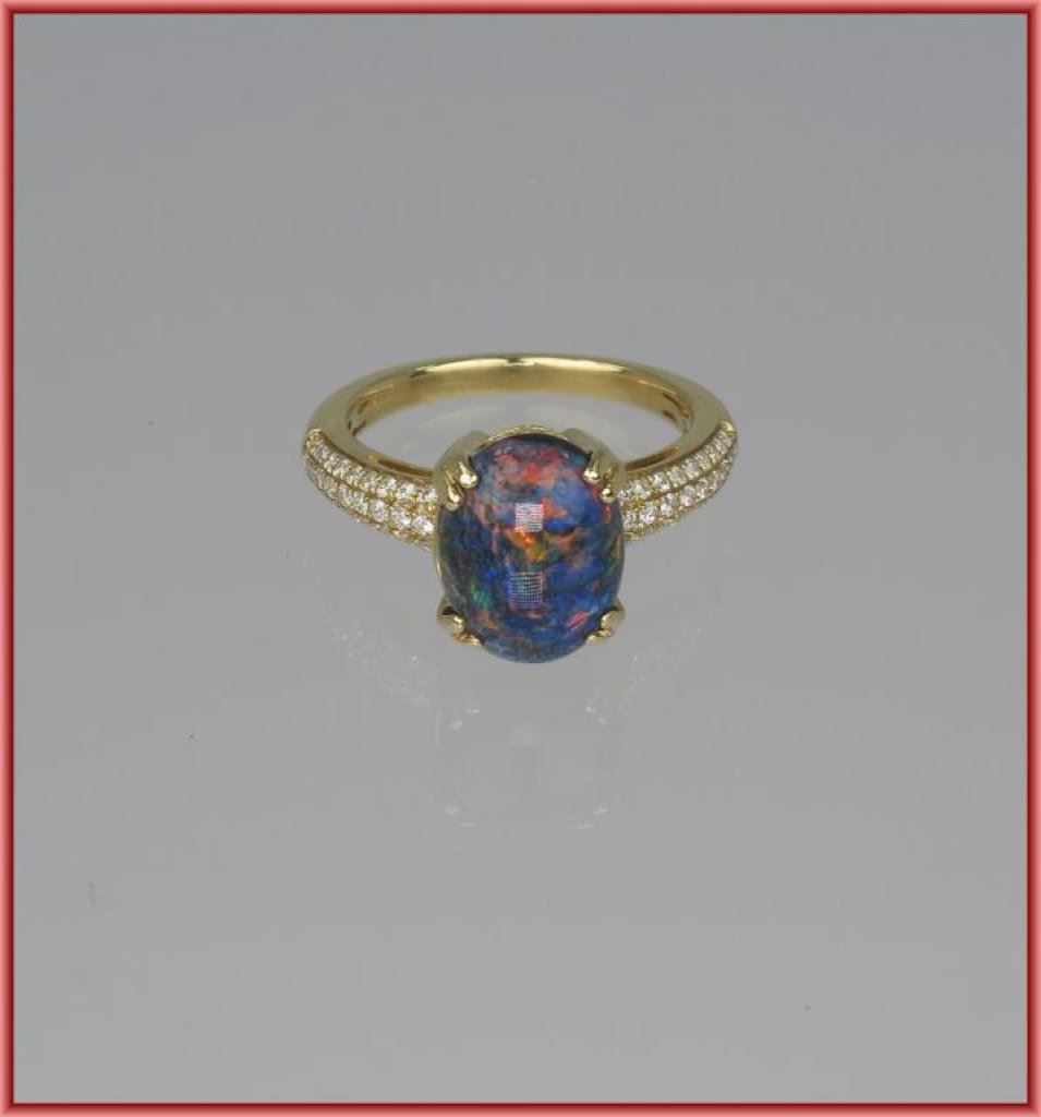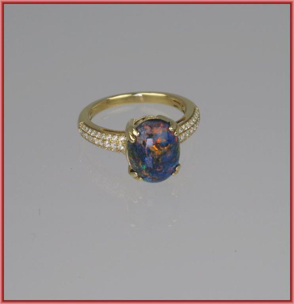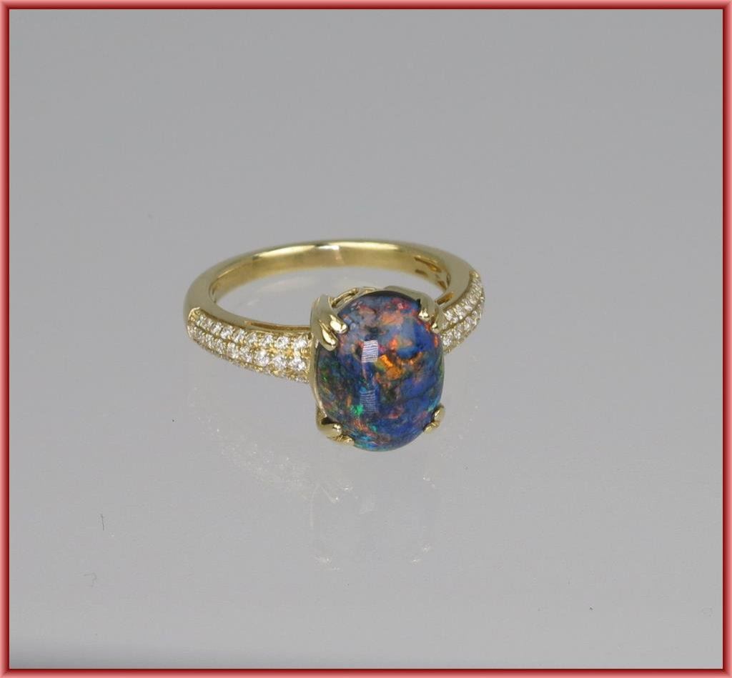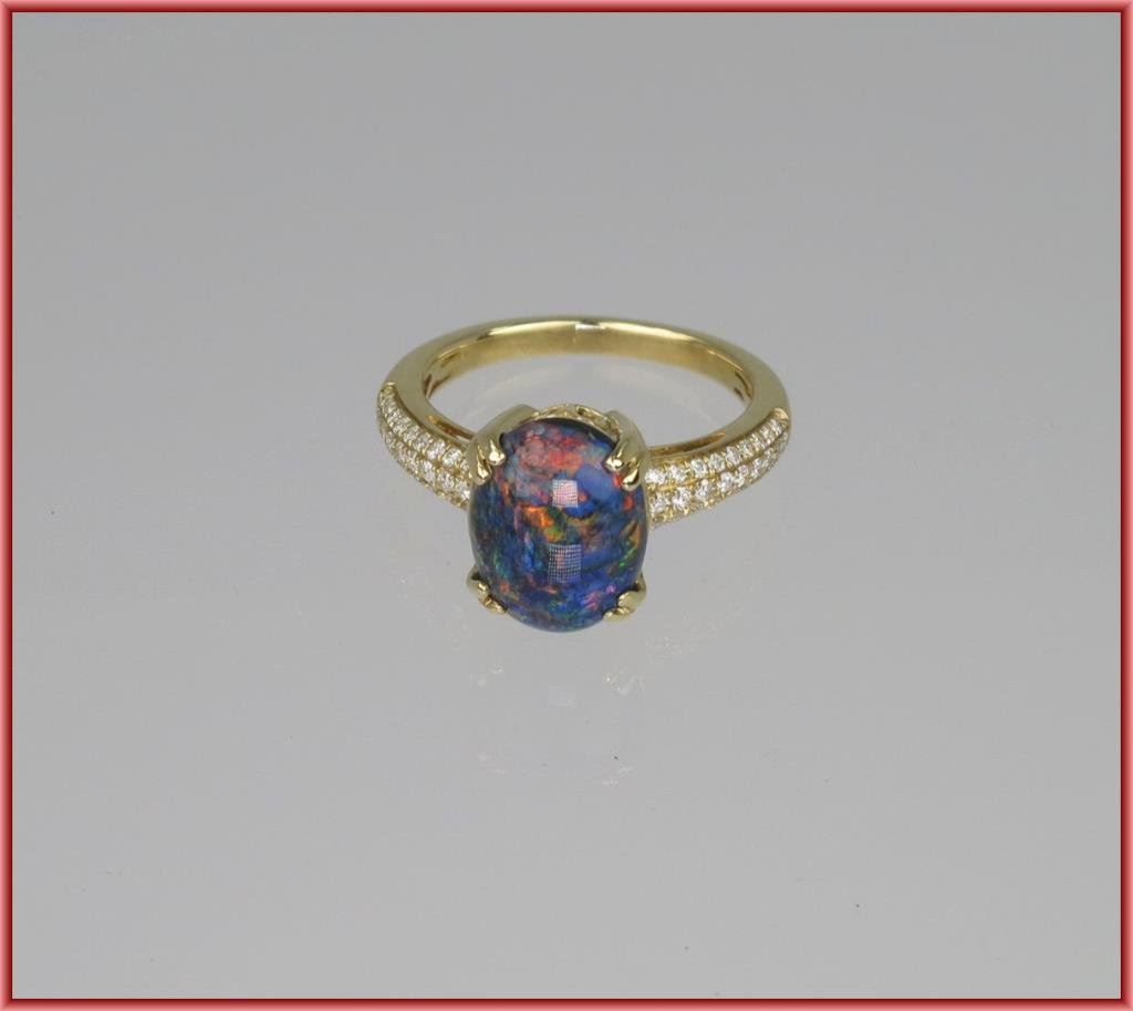 Captivating Australian Black Opal and Diamond Ring featuring a 2.65 carat cabochon opal with fantastic full spectrum color flashes of pink, orange, yellow and red with a bit of green amid a multi-blue background with 54 round cut pave set Diamonds weighing approx. 0.40 carats with H-I colors and SI clarity set in 4.60 carats of yellow gold. NEW Piece. Retail $3,500-$4,000 Estimate $1,800-$2,200