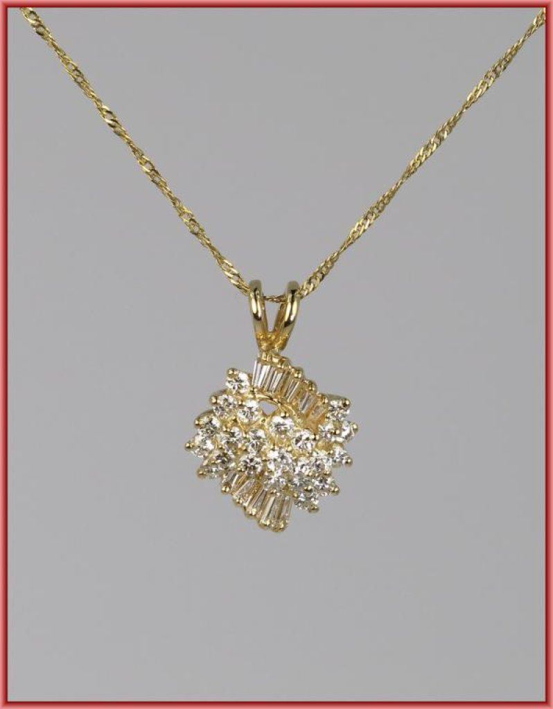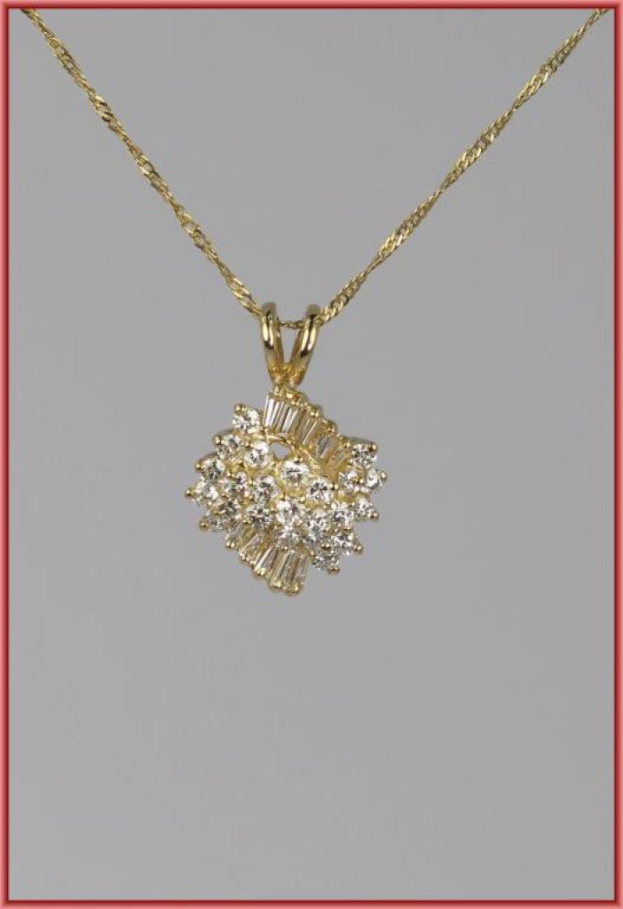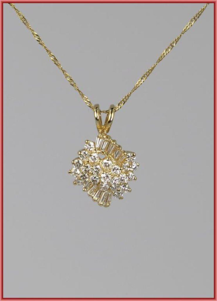 Exquisite FINE Quality Diamond Cluster Pendant wonderful estate piece with 23 blinding white round cut Diamonds and 10 tapered baguette cut Diamonds weighing approx. 1.20 carats total with E-F colors and VVS/VS clarity set in 14 karat yellow gold. Retail $2,600-$2,800 Estimate $1,400-$1,800