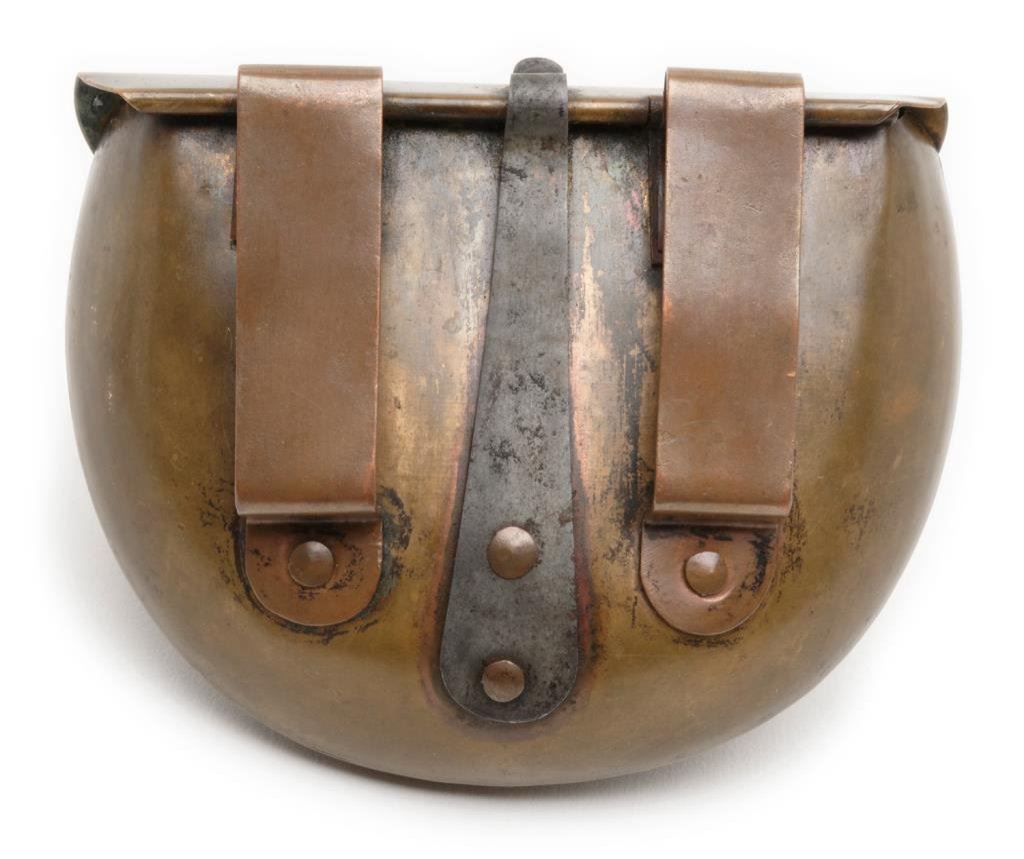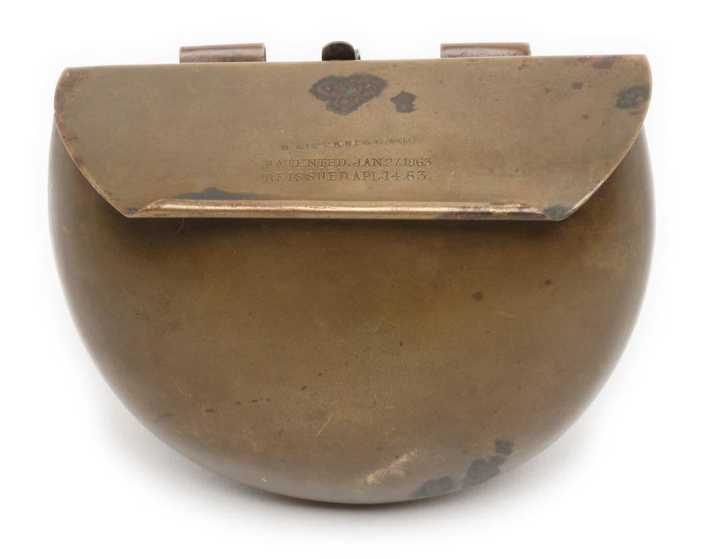 Scarce brass cartridge box with Patent dates from Civil War era and generally attributed to use with Henry lever action rifles and Frank Wesson .44 RF longarms; in overall very good condition with a pleasing dark patina to brass with top of hinged lid marked “PATENTED. Jan 27, 1863/REISSUED APL. 14.63.”; also dealer marked on the lid “B. KITTREDGE & CO.”. Est.: $1,250-$2,500.