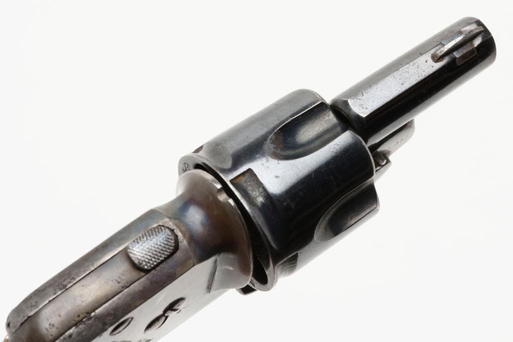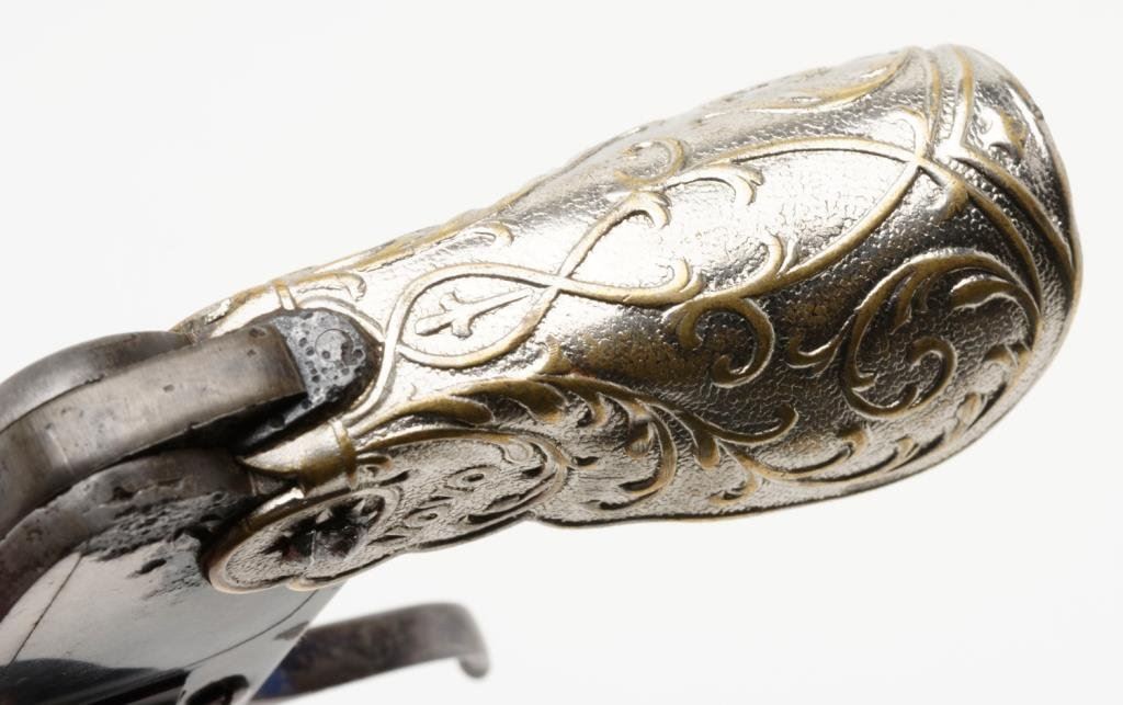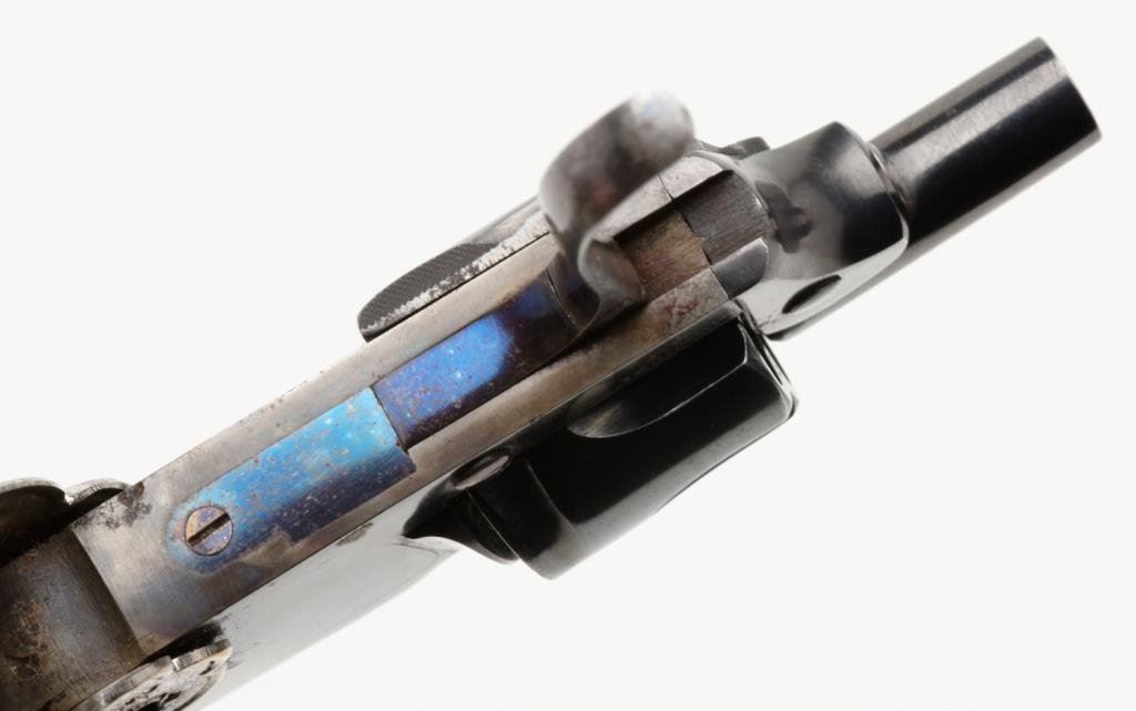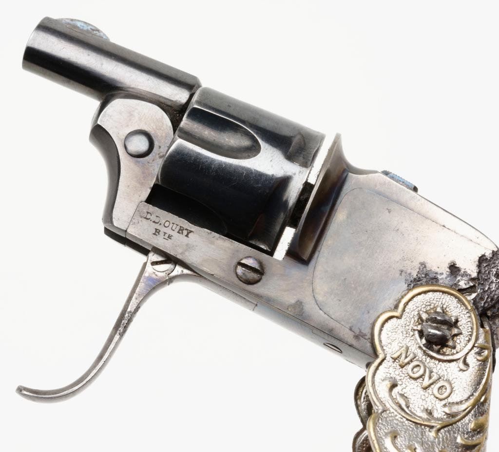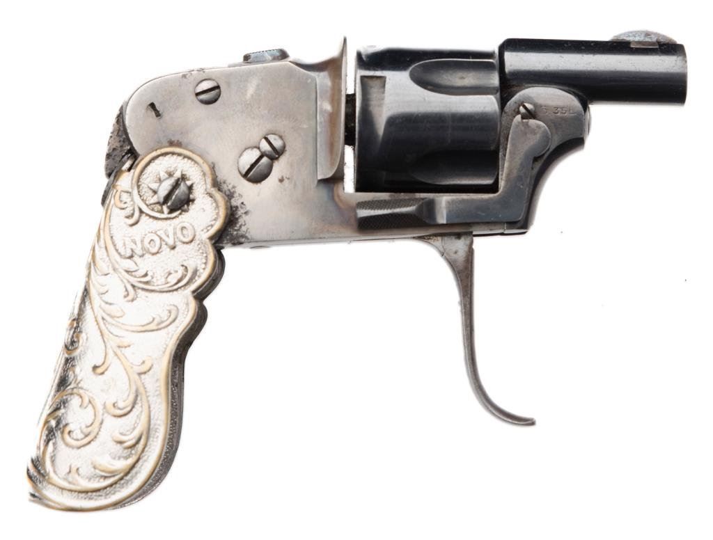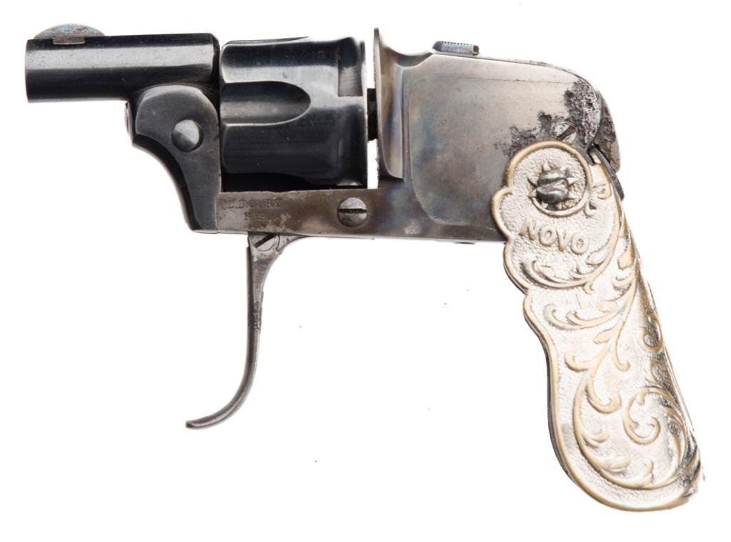 French Novo folding trigger and folding embossed metal grip by Oury, 6.35mm caliber, 1.25” barrel, no visible S/N, blued and case hardened finish; overall good condition and scarce; some scattered pitting confined to the rear frame at grip area; crisp action; considerable blue and case colors remaining. Est.: $1,000-$2,000.