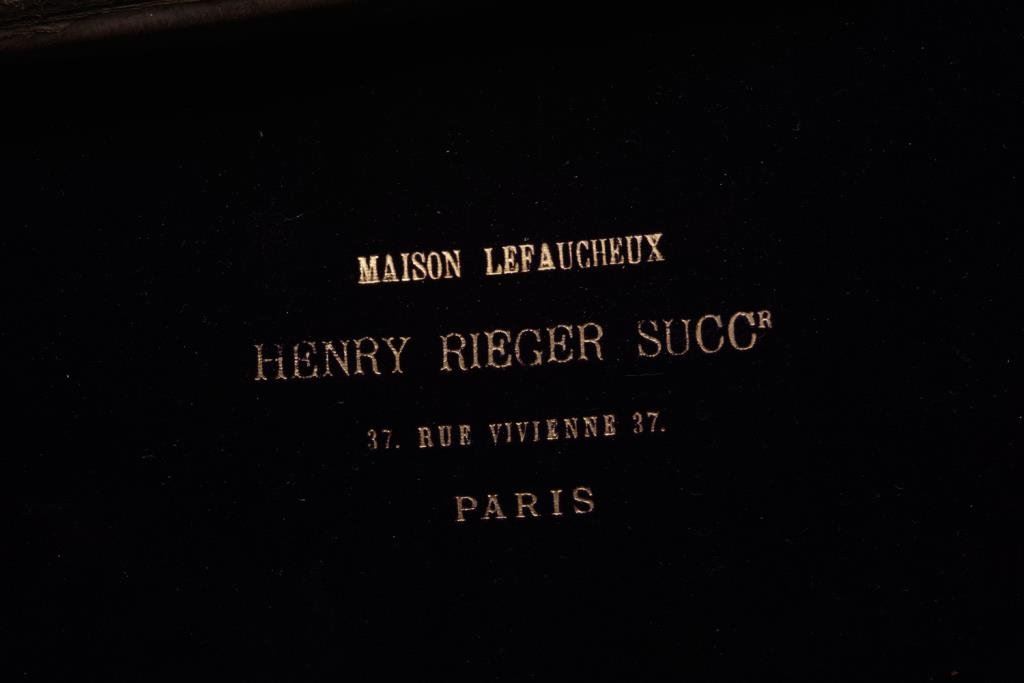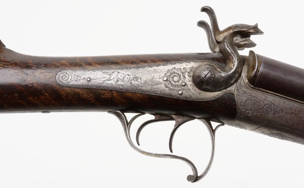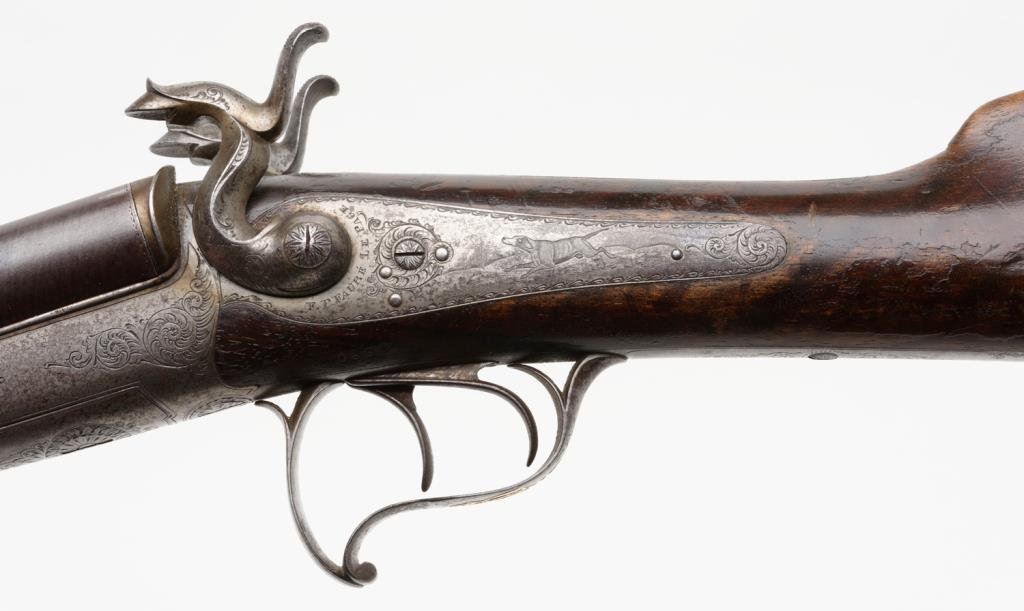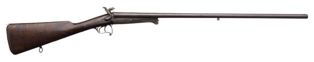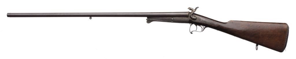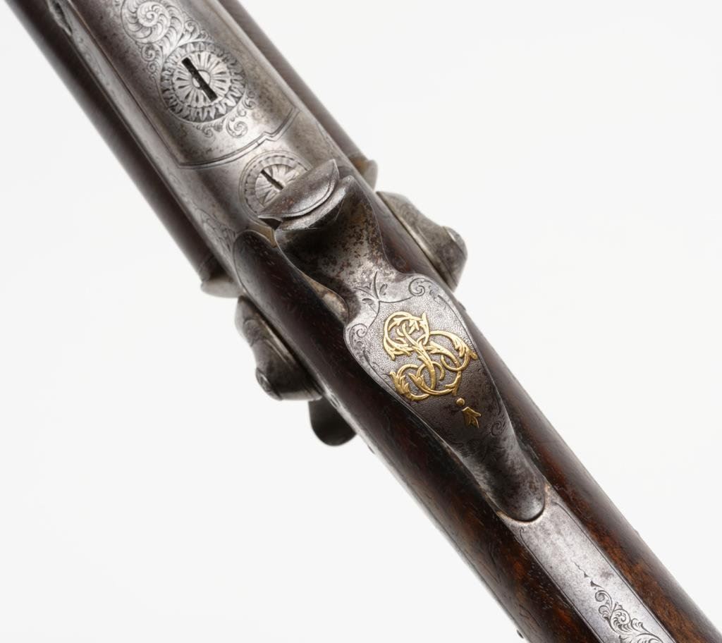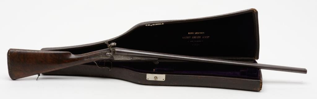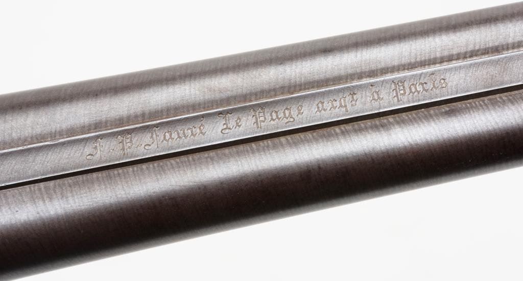 Double barrel side by side pinfire shotgun by F. Le Page in original fitted musical style case with “Maison Lefaucheux label embossed on the inside of the lid; 28 gauge, 27.5” damascene pattern barrels, S/N 3724, game scene and scroll engraved receiver with elaborate gold initials applied to the underside of the trigger guard; wood butt stock with leather butt pad attached with gold pin piercings. This gun is in overall very good condition with finely accomplished engraving and panel scenes; the actions are crisp, the bores are good and the stock is good overall with some scattered old mars and losses to finish from handling and storage. The casing is in overall good to very good condition with the majority of the original purple lining remaining intact; leather carry strap still attached. Est.: $1,250-$2,500.