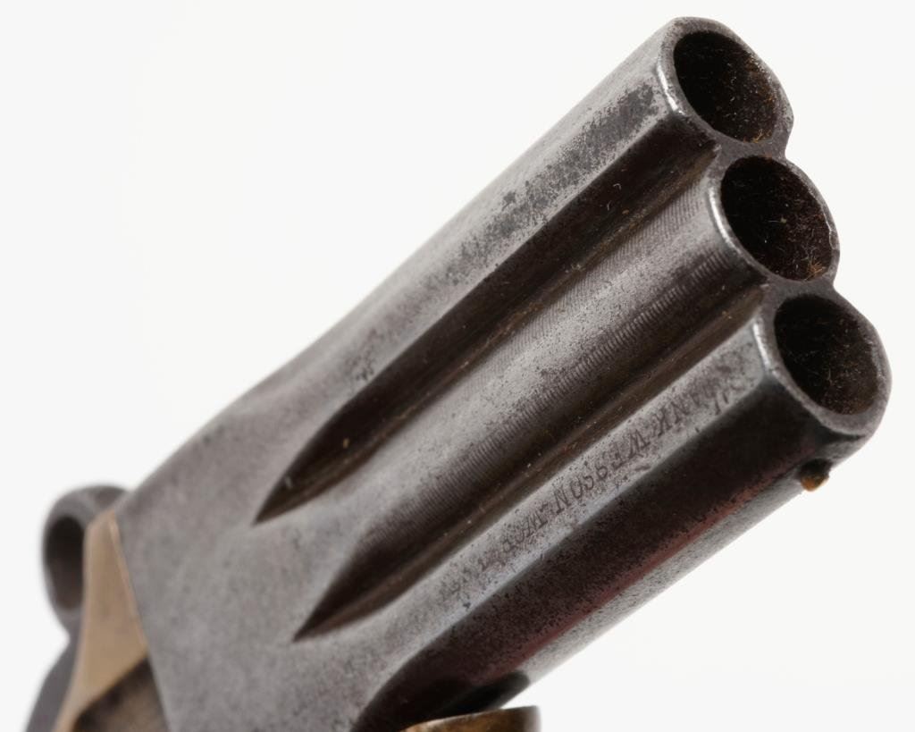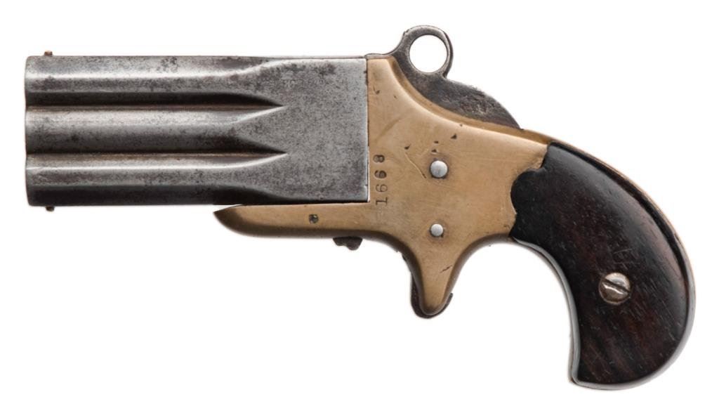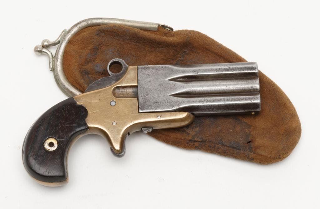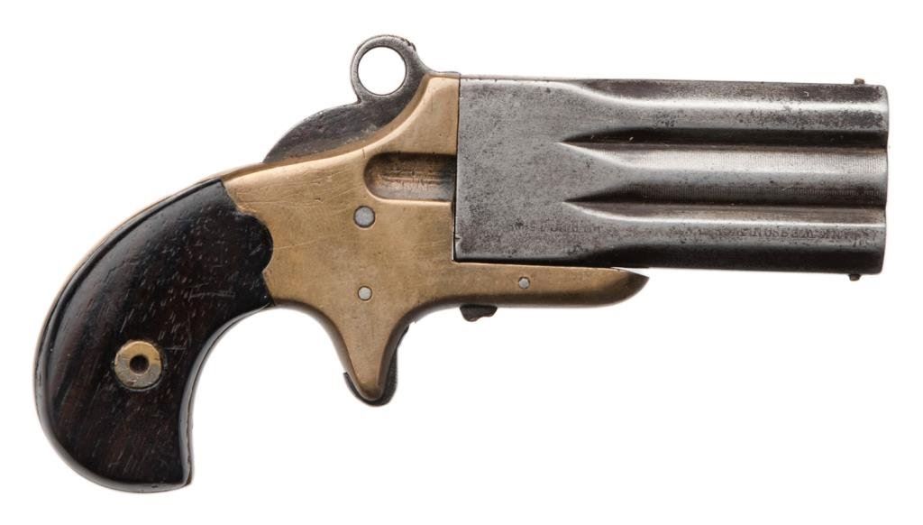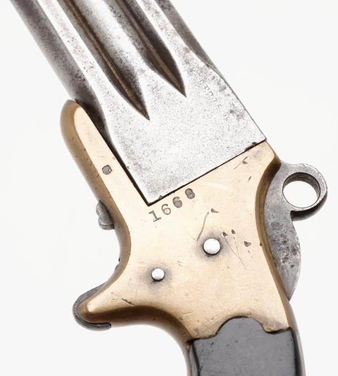 Frank Wesson Vest pocket O/U derringer with purse holster, #1668; brass frame, iron barrel assembly, one of the rarest and most desirable derringers and hard-to-find in any condition. This one is good overall with working action and very good grips. Est.: $1,000-$1,800.