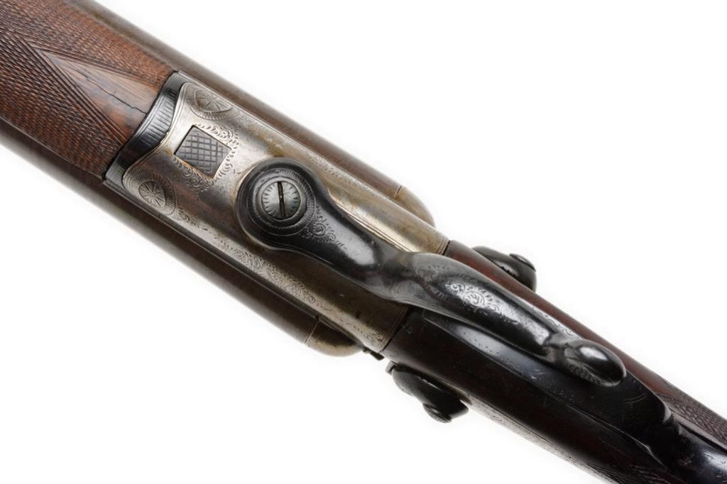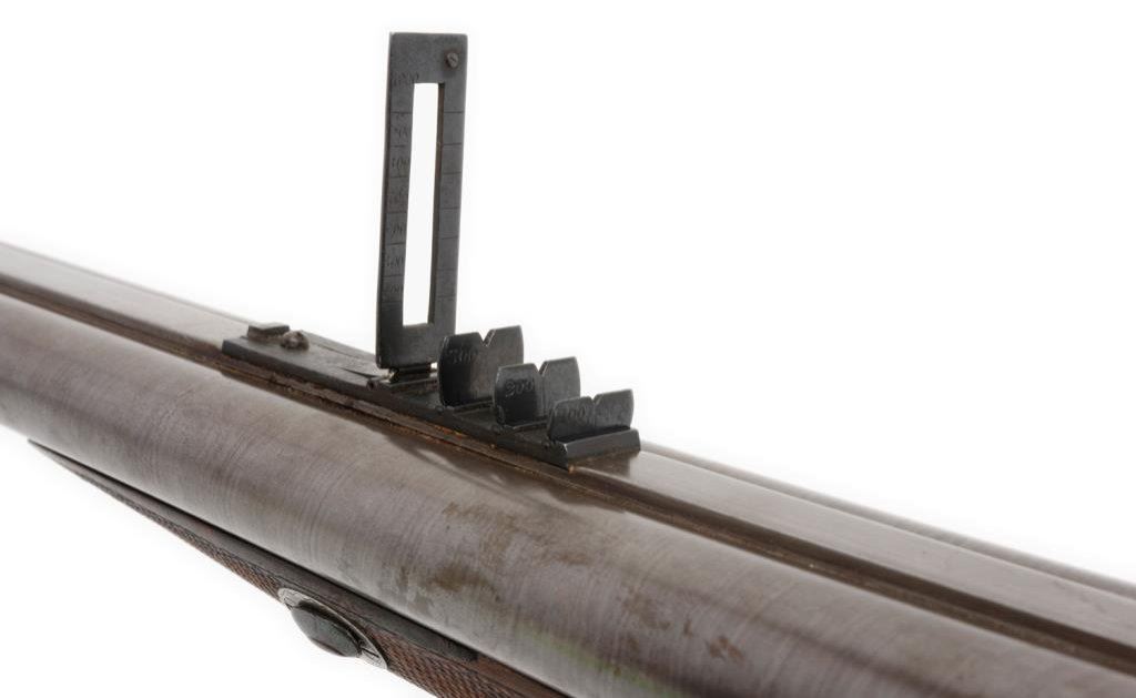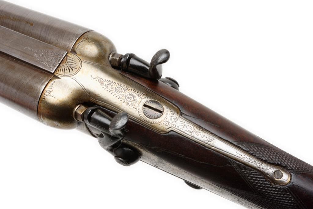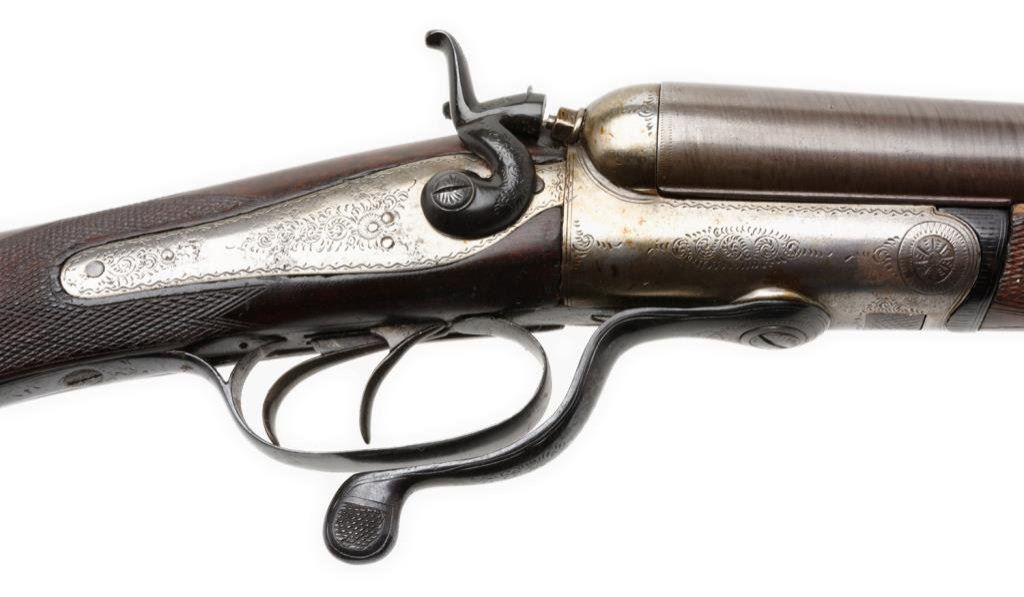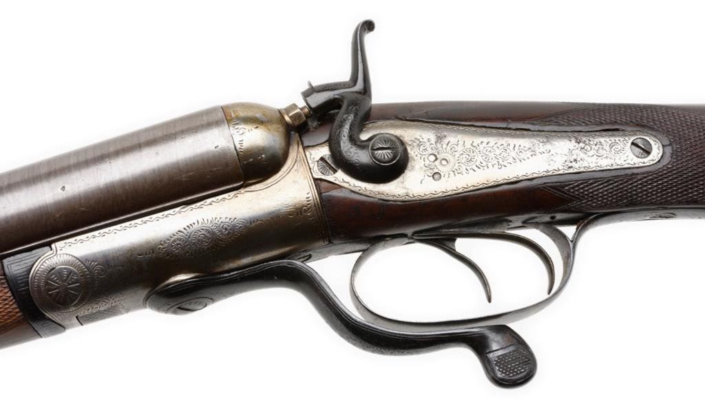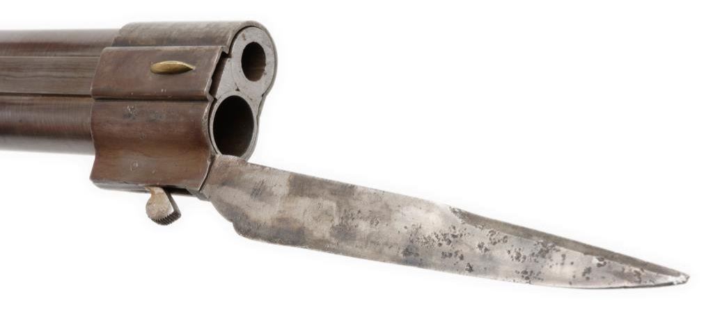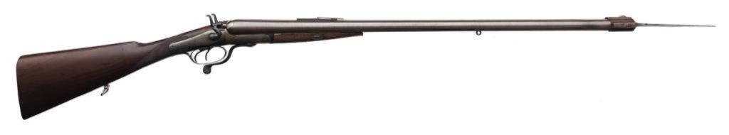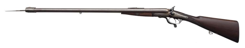 Side by side Cape Gun with removable short bayonet, approximately 11mm caliber (L) and 12 gauge (R), 30” barrels, no visible S/N, Continental made, checkered wood stocks in overall very good condition with very good bores, crisp actions, engraved receiver and lock plates, very good wood stocks with a couple chips to the right rail of the forend. Est.: $1,250-$2,500.