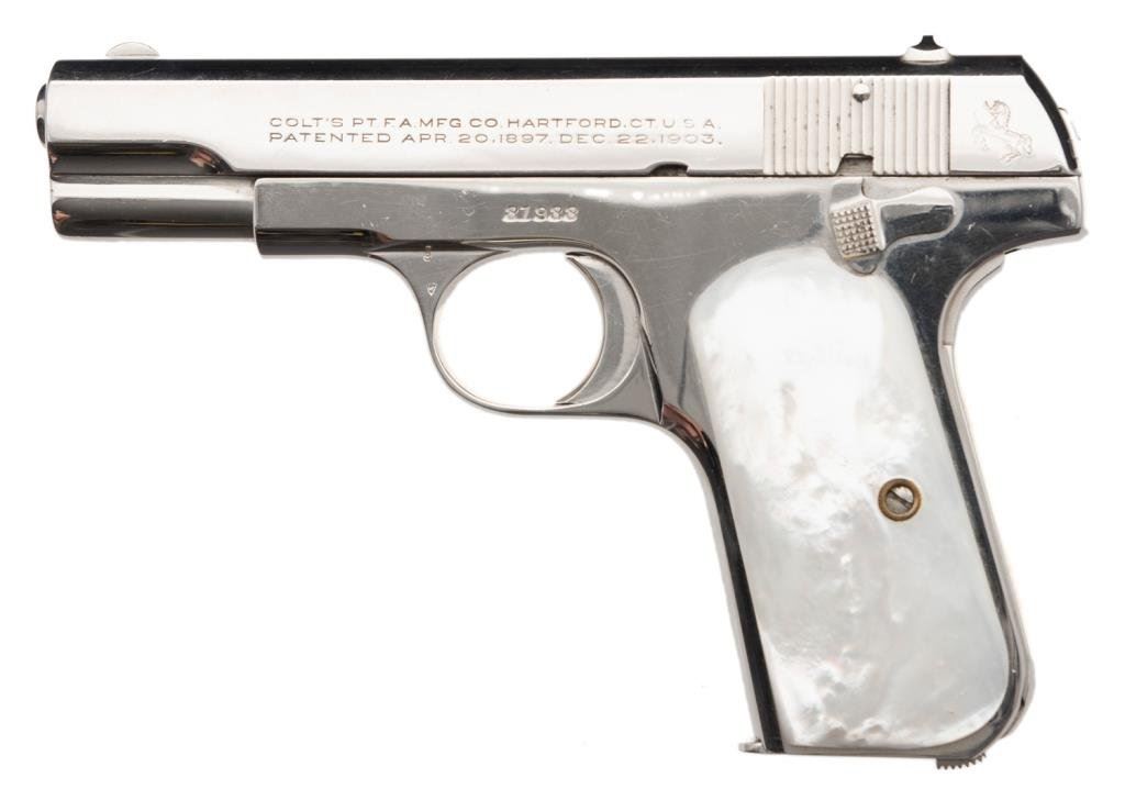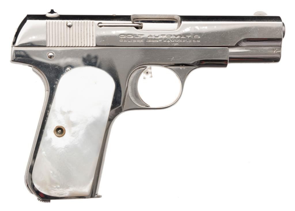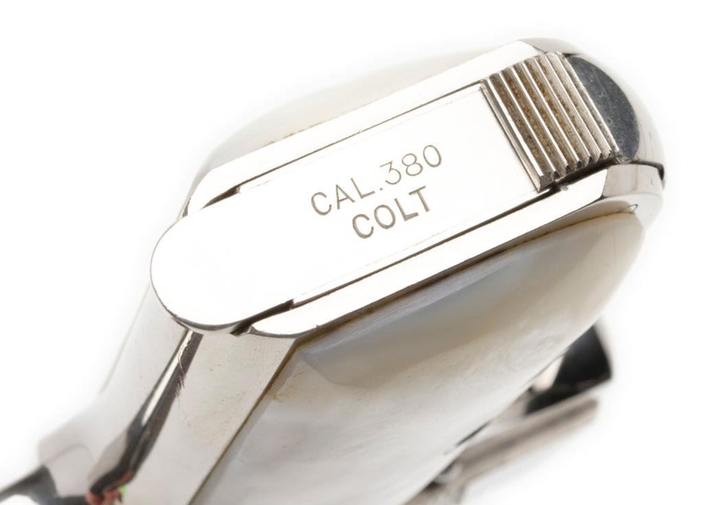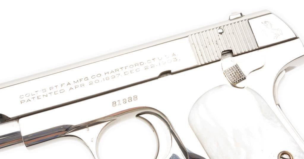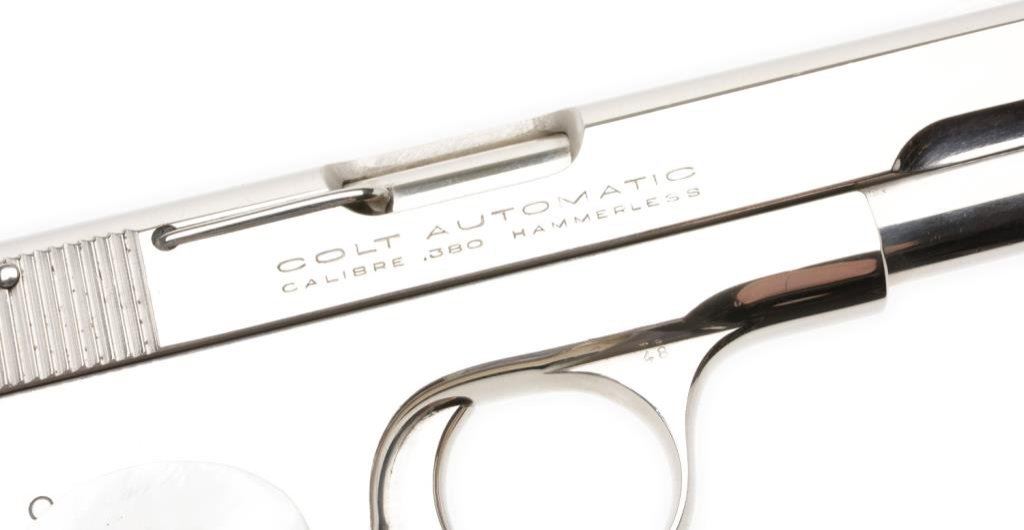 **Colt Model 1908 Pocket semi-automatic pistol, .380 caliber, 3.75” barrel, S/N 81988, nickel finish, pearl grips in overall fine to excellent condition showing little use; fine bore, crisp action, sharp markings and fine grips. Est.: $1,400-$2,800.