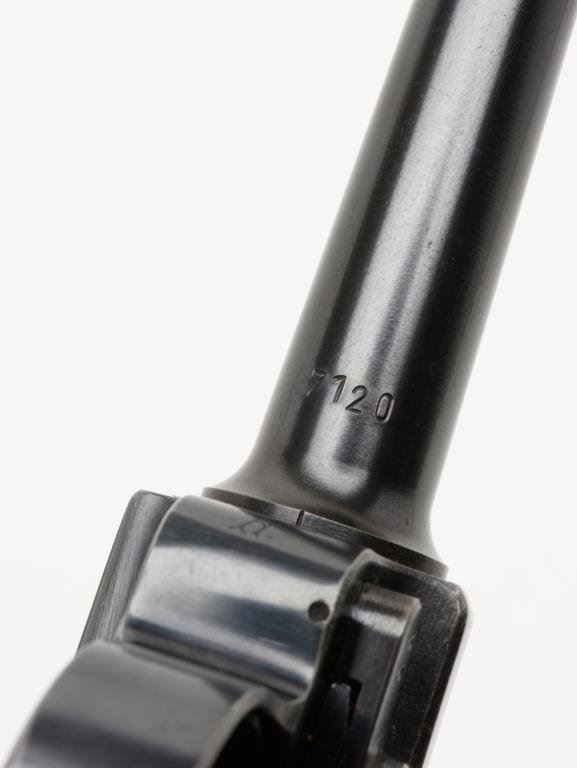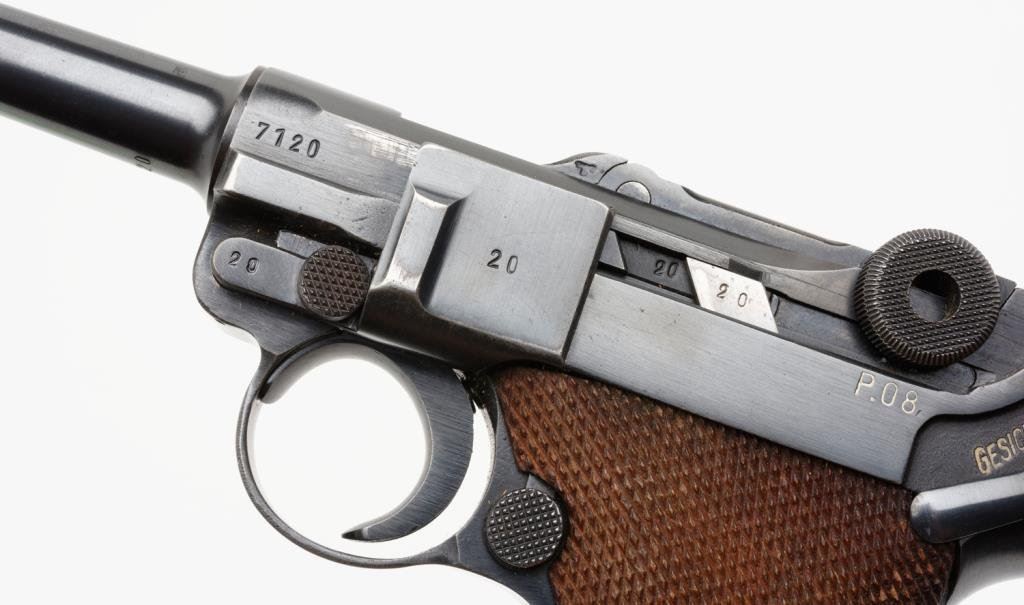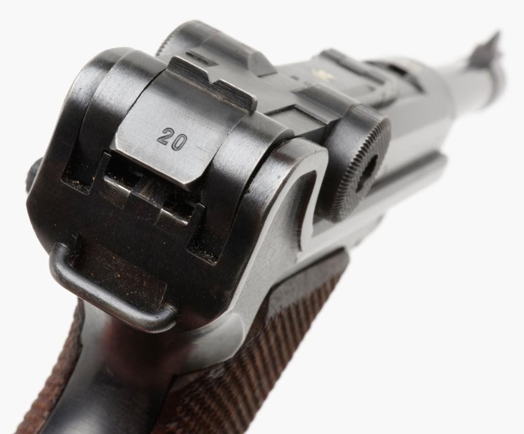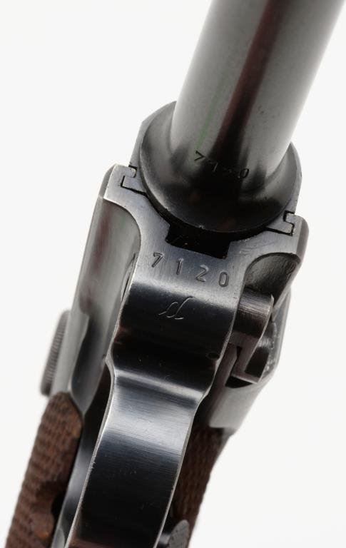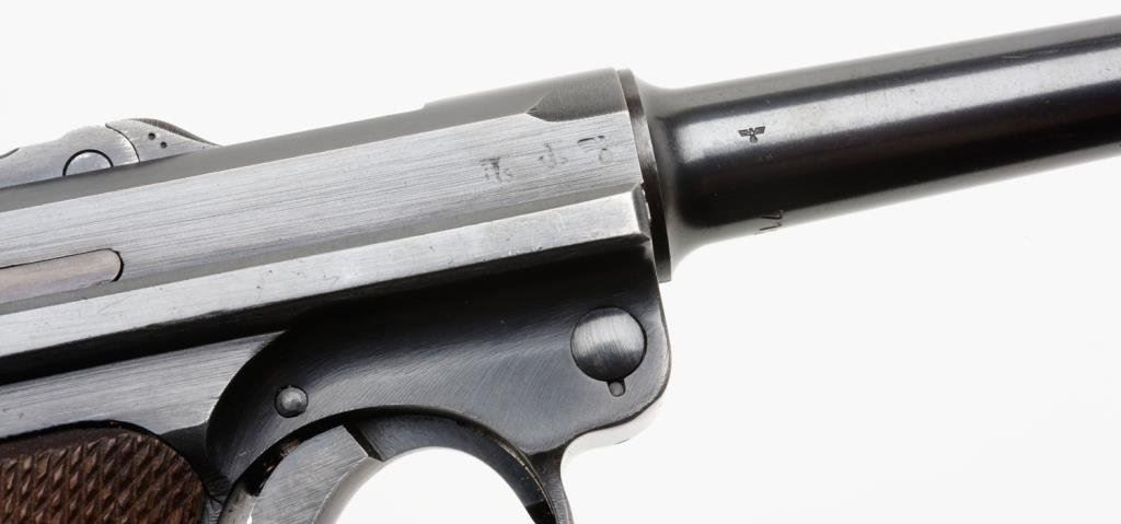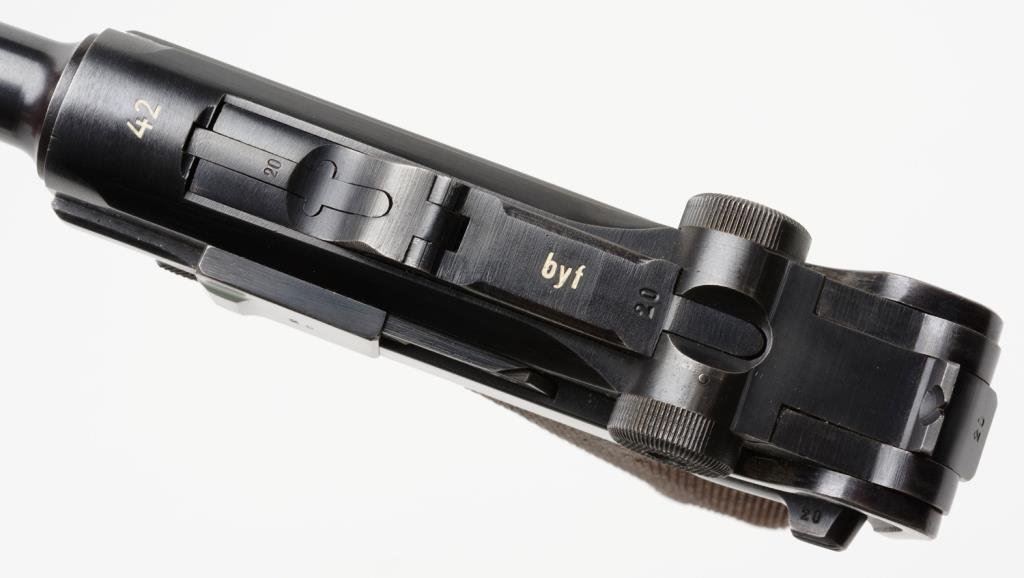 **Early nazi period German Luger semi-automatic pistol, 9mm caliber, 4” barrel, “byf/42” marked, S/N 7120 d, matching visible numbers except magazine that is un-numbered but marked “P08” as is the left rear side of the frame; 96-98% original finish, crisp action, near fine bore, sharp markings and near fine grips; an exceptional example Luger. Est.: $1,250-$2,500.