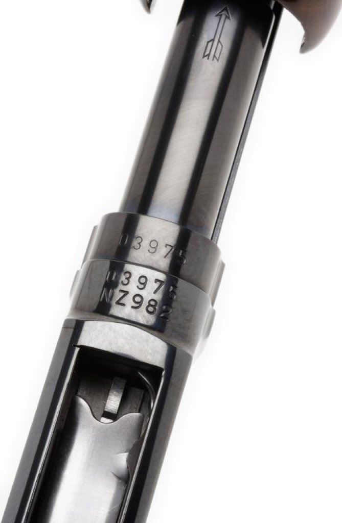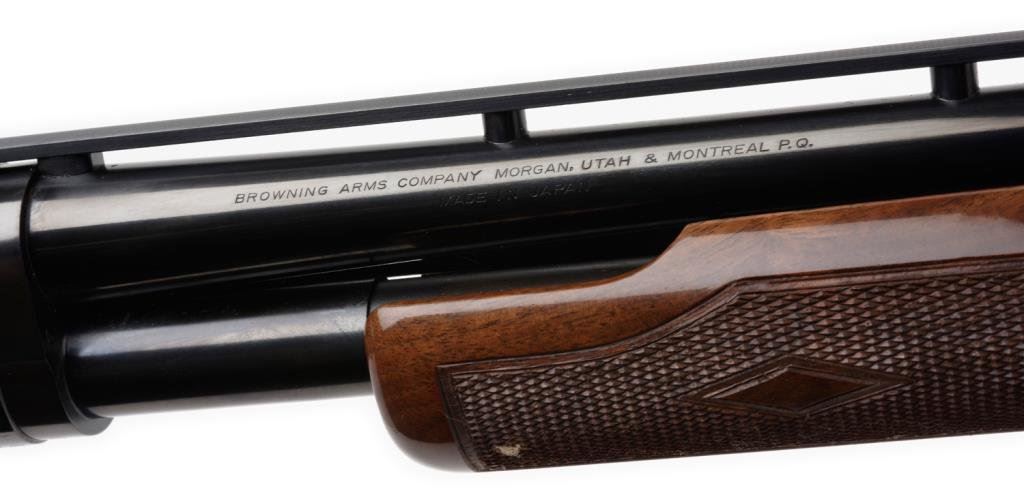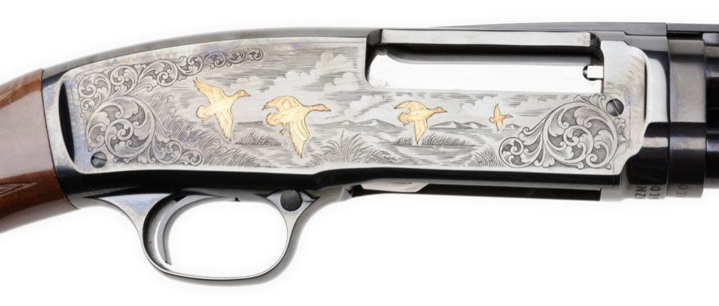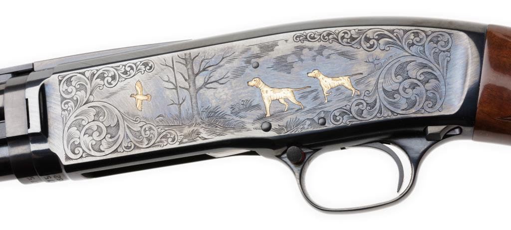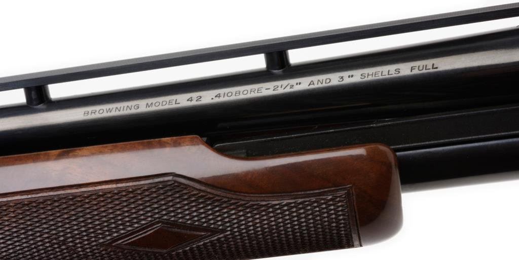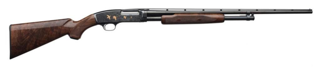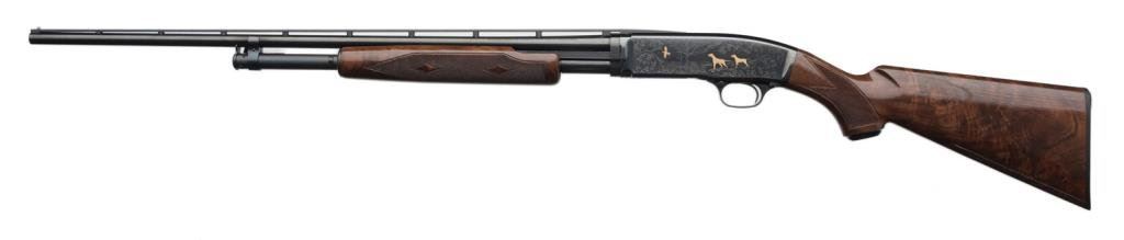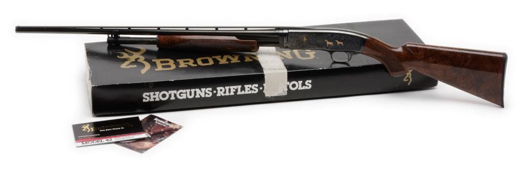 **Browning High Grade Model 42 pump shotgun, .410 gauge with a 26” blued barrel, S/N 03975NZ982. The shotgun is in overall very good to nearly fine condition showing little use. The 26” blued barrel features a full length ventilated rib and silver bead front sight. The receiver is highly engraved with gold inlay portraying hunting scenes with birds and retrievers. The finely checkered, high gloss exhibition grade stock is in overall fine condition with beautiful figure in the butt stock. The stock ends with a Browning marked hard rubber butt plate and a 14” LOP. Est.: $1,225-$1,850.