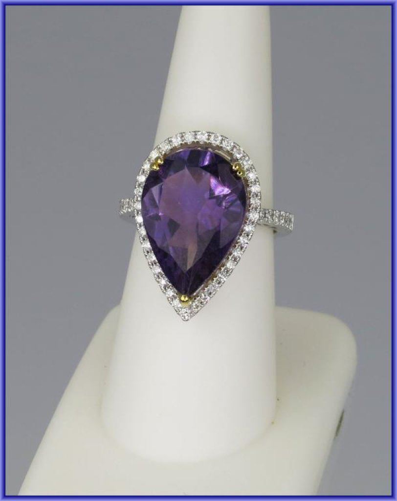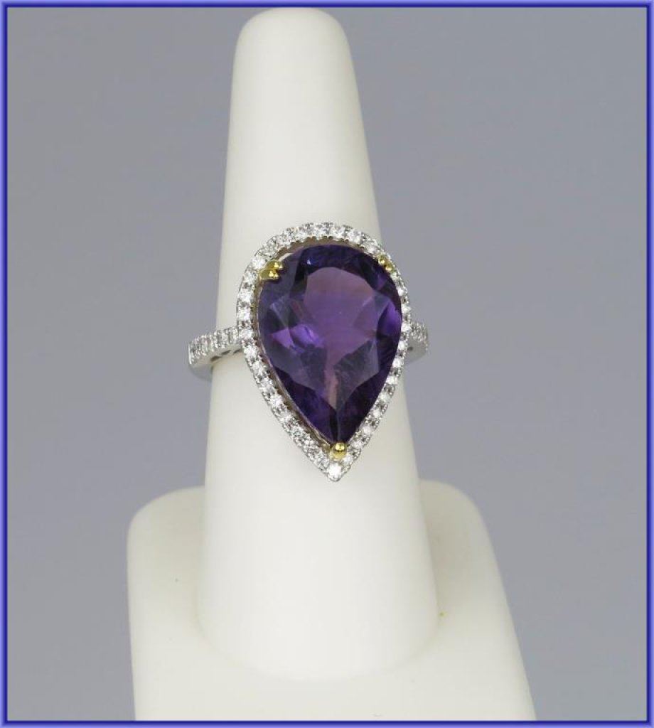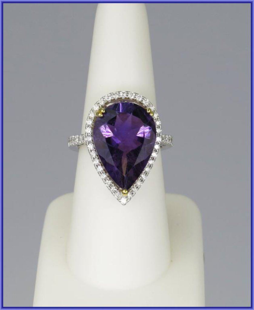 Wonderful Pear Shaped Amethyst and Diamond Ring featuring a Fine amethyst weighing approx. 18.00 carats set in classic halo setting encircled with 34 round brilliant cut diamonds weighing approx. 0.80 carats with G-H colors and SI clarity set in 14 karat white gold. Retail $3,000-$3,600 Estimate $1,800-$2,500