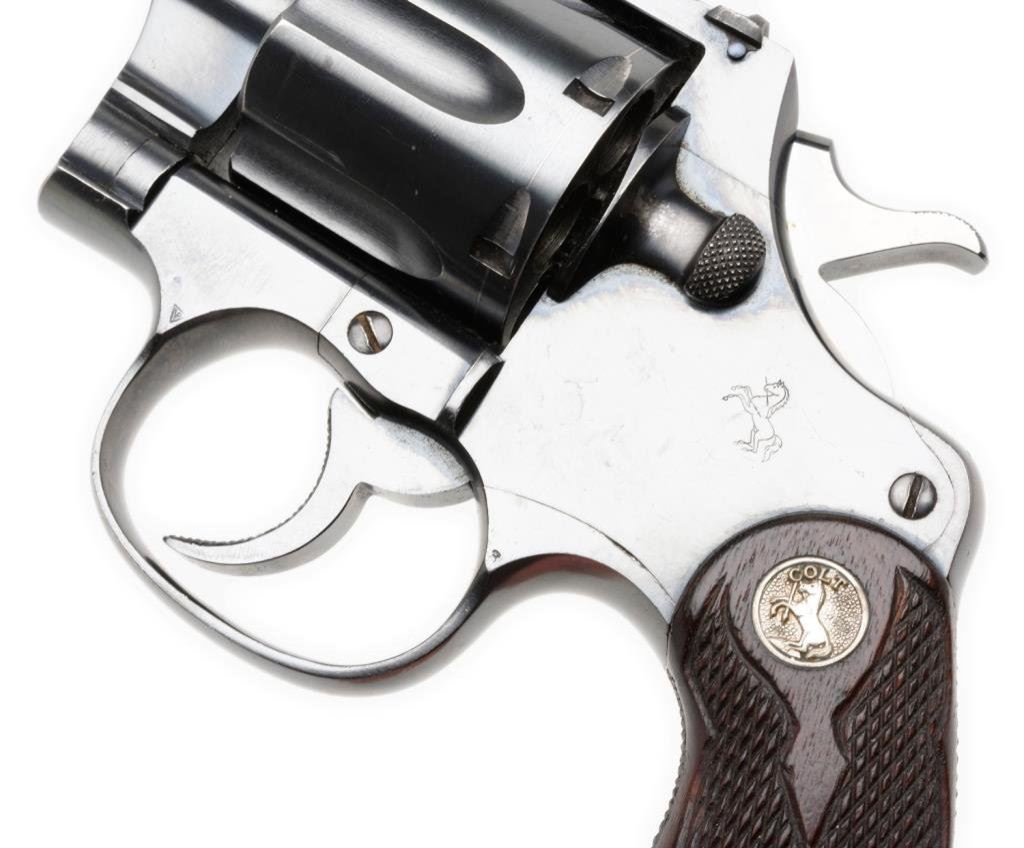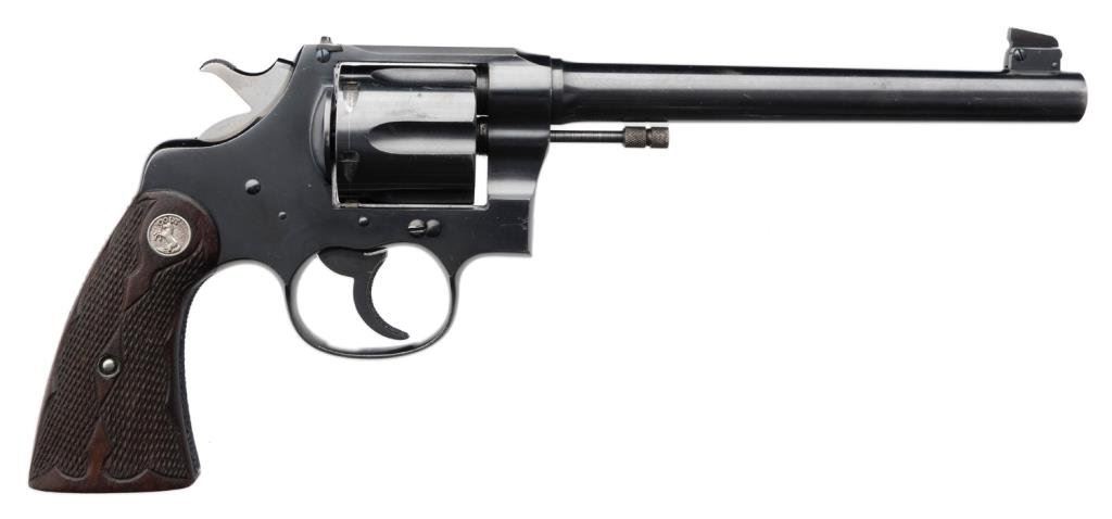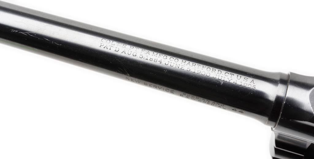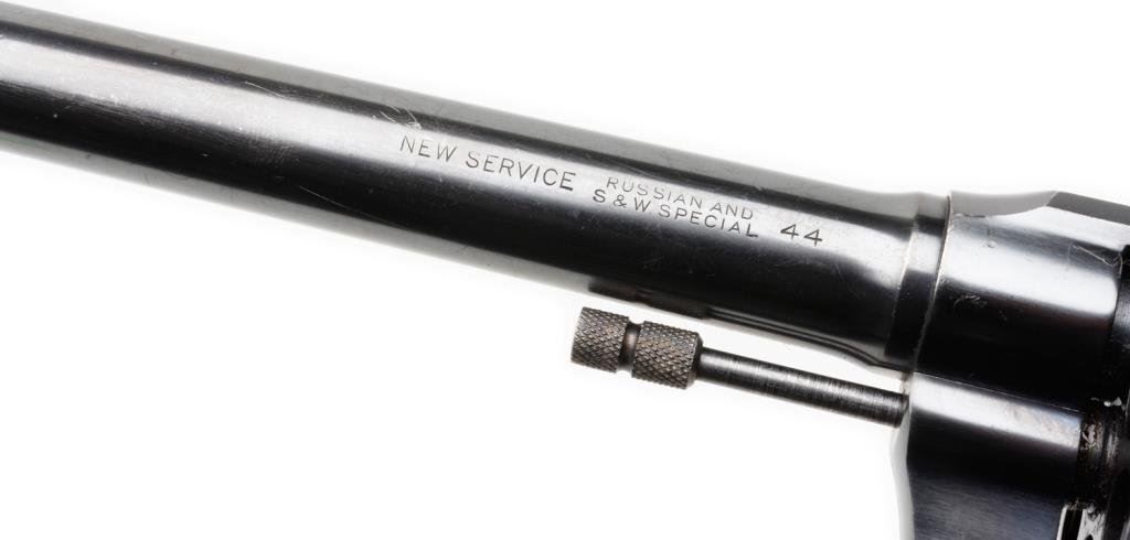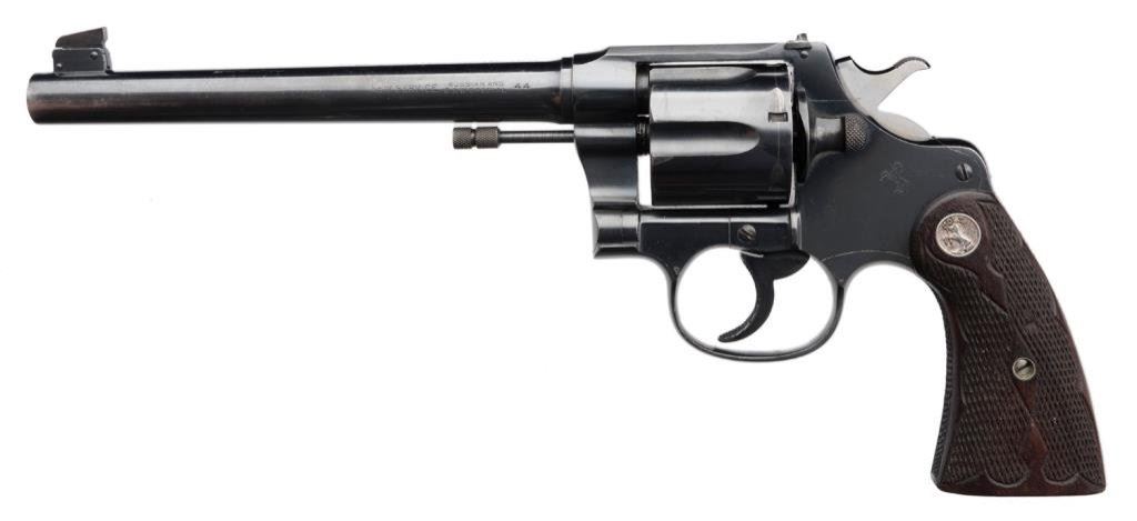 **Colt New Service Flat top Target DA revolver, .44 Russian and S&W Special caliber, 7.5” barrel, S/N 325915, blued finish, checkered fleur d’lis medallion wood grips in overall excellent condition with some muzzle wear; otherwise crisp and desirable. Consignor’s tag on gun notes “Special order 3-lb pull, shipped 1-14-27 to Detroit Dealer Lew Eppinger”, but no factory letter to confirm information. Est.: $2,500-$5,000.