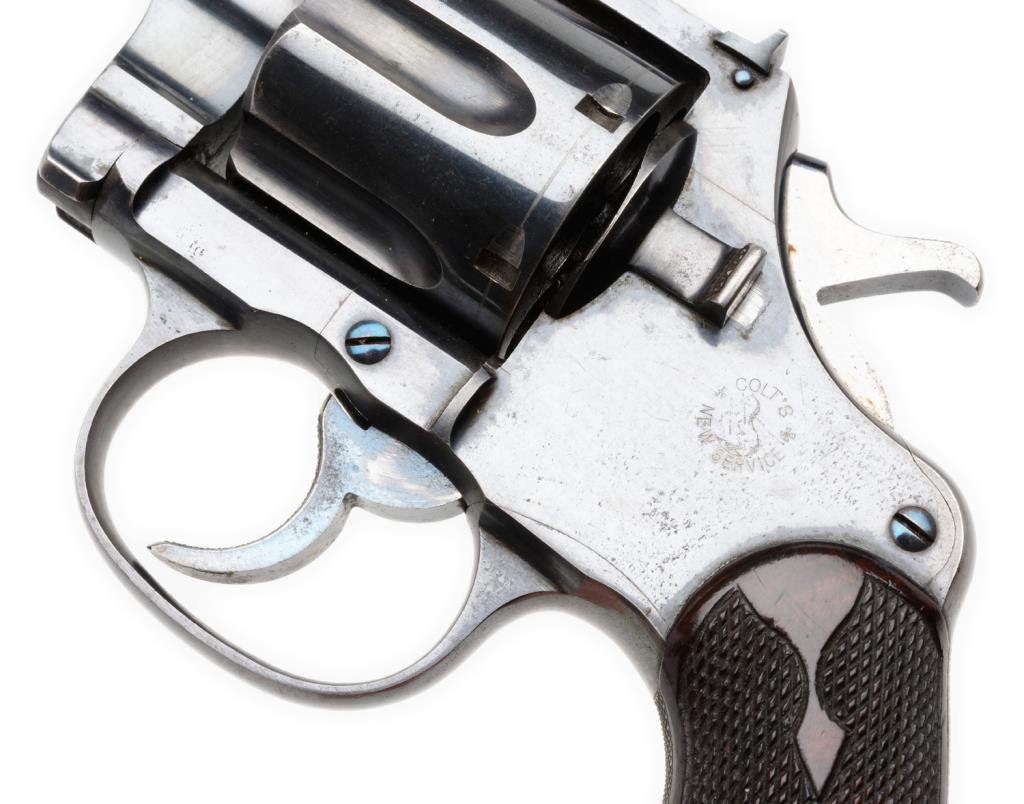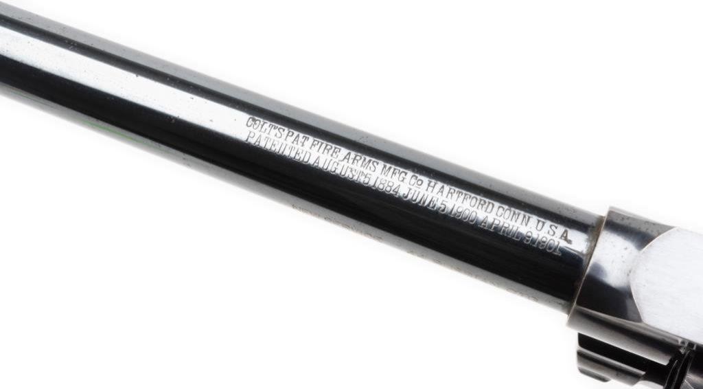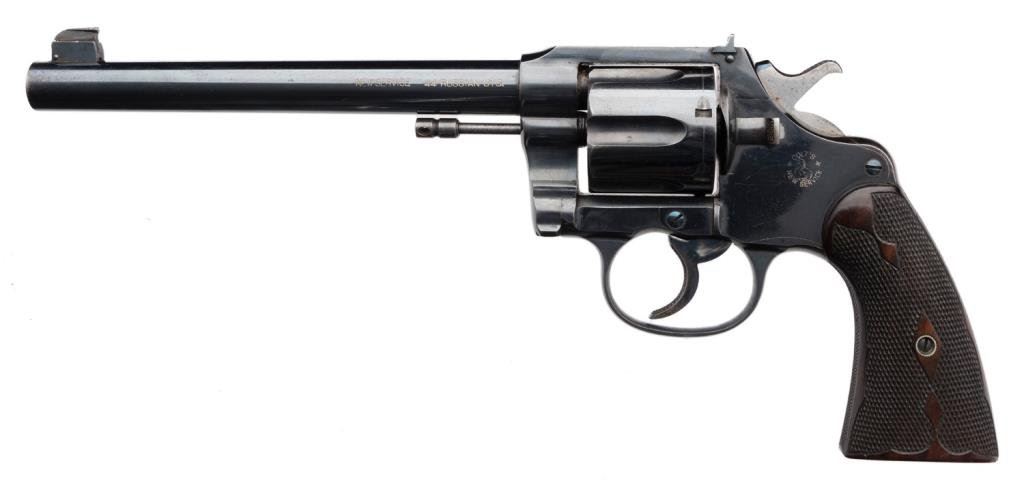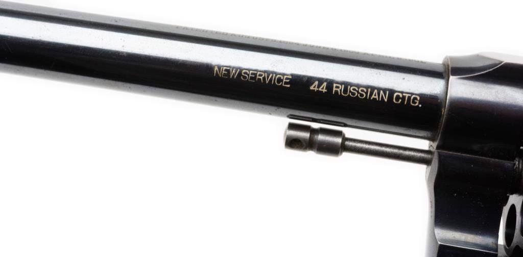 **Colt New Service Flat top Target DA revolver in scarce .44 Russian caliber, 7.5” barrel, S/N 7073, high polish blued finish, checkered fleur d’ lis wood grips in overall excellent condition showing little use; accompanied by a Colt factory letter confirming features, type of stocks “Not listed”; shipped to Iver Johnson Sporting Goods Co., Boston, MA on July 12, 1902; one gun is shipment. A real beauty! Est.: $2,500-$5,000.